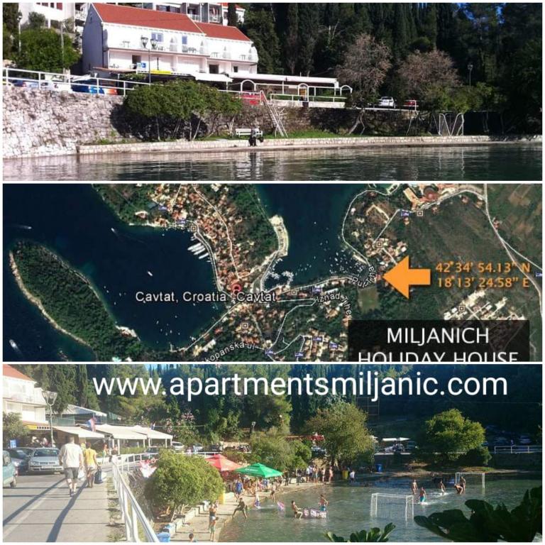 Apartmaji Miljanić ob morju Cavtat, Put Tihe 22 a, Cavtat Nahajajo se v Cavtatu, prva vrsta ob morju. Idealna lokacija ... vse je ravno, od apartmaja do trgovin, plaže, restavracij ... brez hribov ... ena redkih lokacij (Cavtat je hribovit). Vse sobe in apartmaji imajo čudovit pogled na morje, balkon, zasebno kopalnico, klimatsko napravo, satelitsko televizijo in brezplačen brezžični internet. V bližini je več plaž: Uvala Tiha pred hišo, plaža pri hotelu Cavtat 100 m, plaža Žal 200 m ... To odlično lokacijo ob morju in bližino plaže dopolnjujejo drugi objekti, ki se nahajajo v sami hiši, kot so najem čolnov, avtomobilov, skuterjev, trgovina s spominki, umetniška galerija in restavracija Ludo more. Pred hišo je zasebno parkirišče, ki je za goste brezplačno. Dubrovnik je oddaljen 18 km, letališče Čilipi - 7 km Dobrodošli!!!