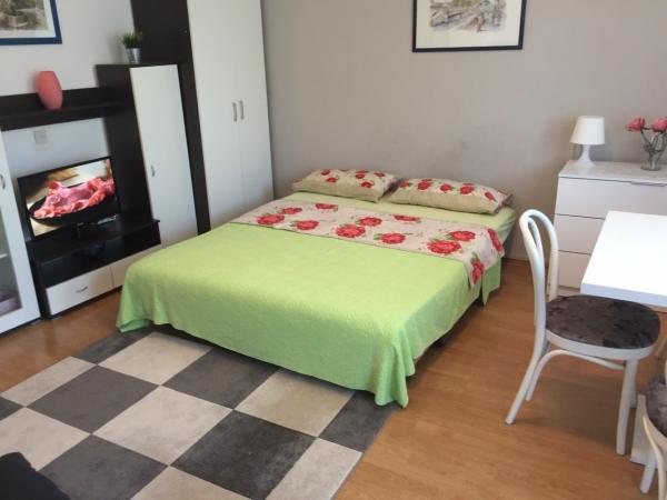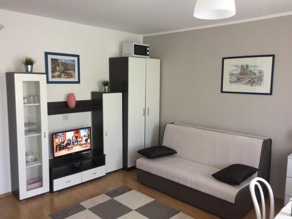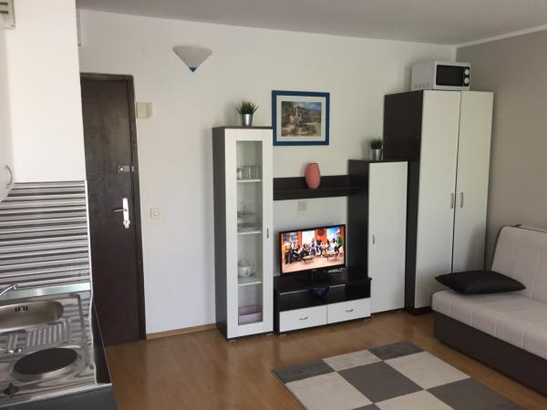 Apartmaji Skalinada 1 in 2 v celoti opremljena in sodobno opremljeni apartmaji, v velikosti 30 m2. Apartmaji lahko udobno sprejme tri odrasle ali par z dvema majhnimi otroki. Vsi apartmaji so sestavljeni iz majhnega dnevno sobo z raztegljivim kavčem za eno osebo ali največ dveh majhnih otrok, dnevna soba s kavčem - primeren za dve odrasli osebi, kuhinjo, ki je opremljena s hladilnikom, štedilnik, aparat za kavo, štedilnik, potrebne posoda, jedilni pribor, jedilnica - miza s 4 stoli, kopalnica vsebuje tuš, pralni stroj, sušilnik za lase, brisače in teraso, ki je opremljena z mizo in stoli. Apartmaji imajo klimatsko napravo. Lastnosti naprave: TV / Cable / Internet je na voljo v stavbi. Parkirno mesto. Prenovljen. Vključeno: končno čiščenje. Apartma se nahaja v centru mesta, v bližini plaže, bari, restavracije, fast-food, animacija za otroke, športnih igrišč in drugih objektov. Veselimo se srečanja z vami!