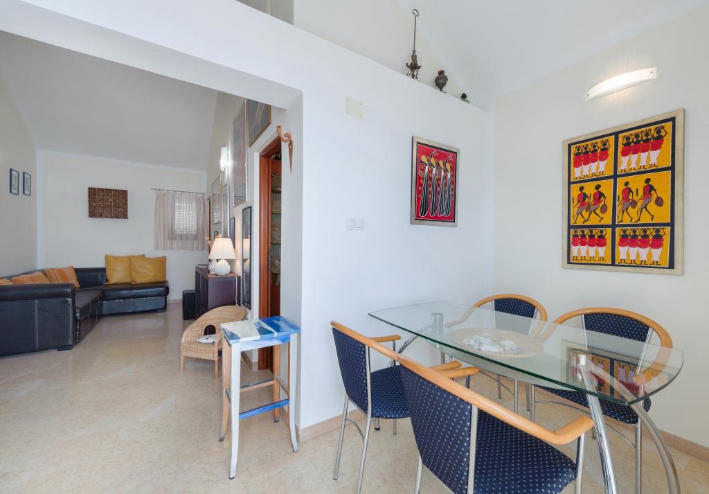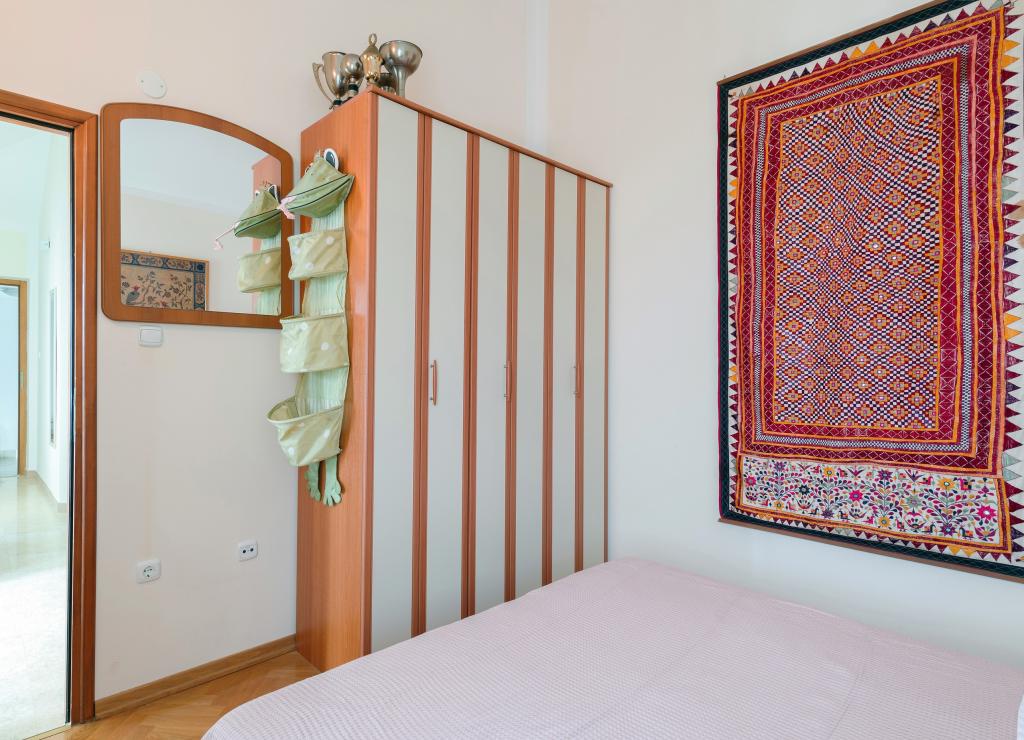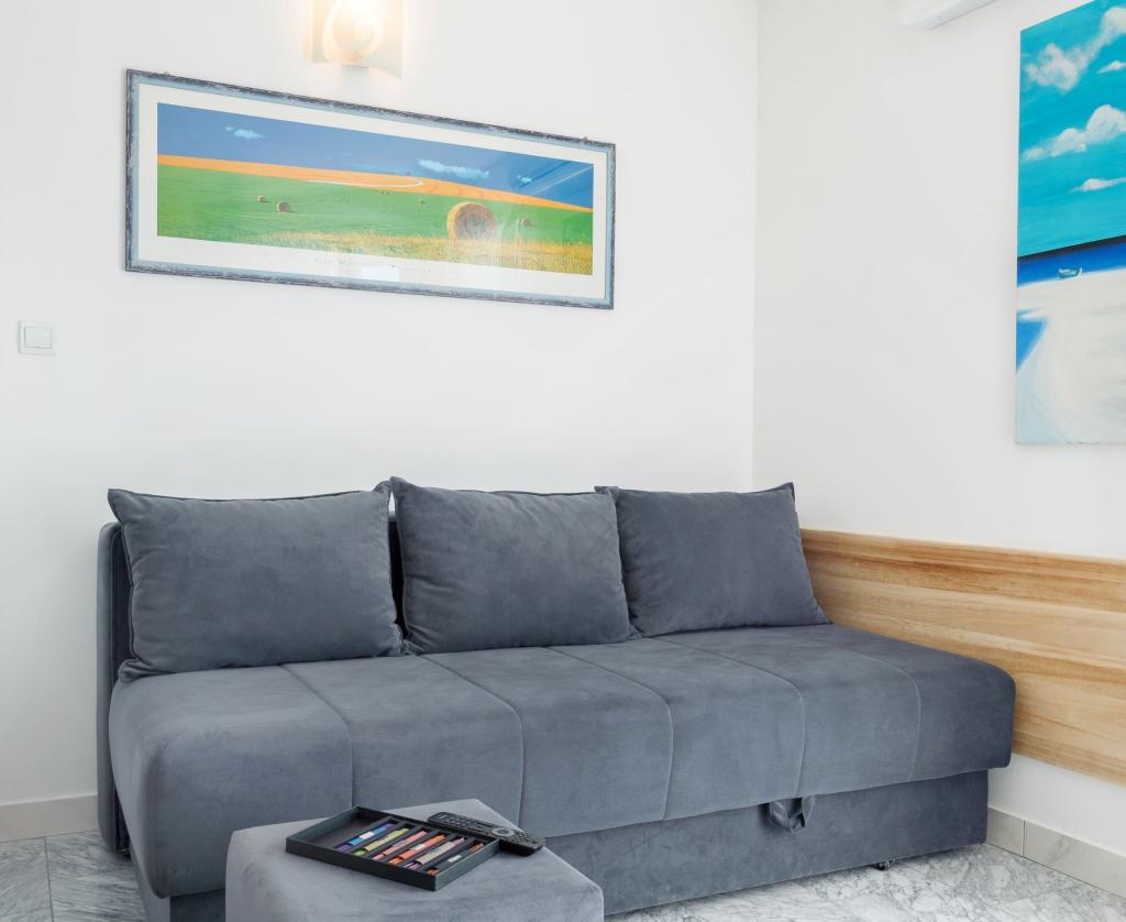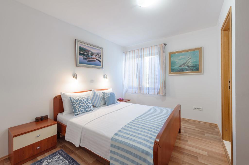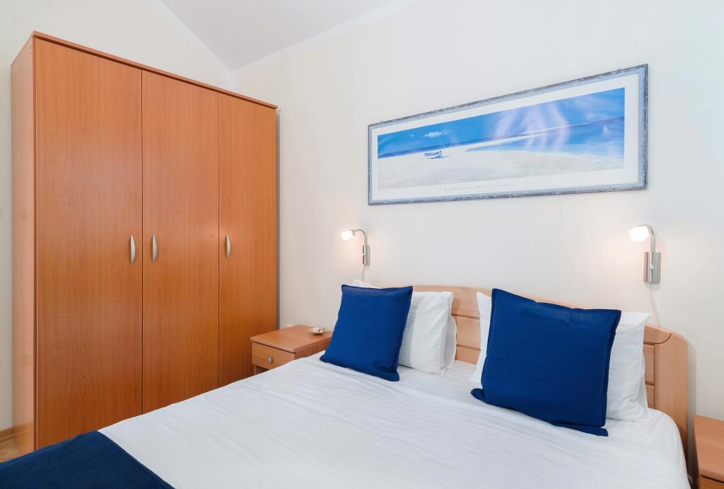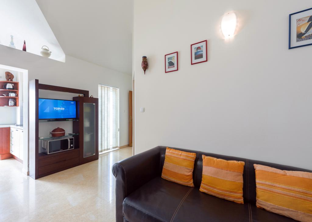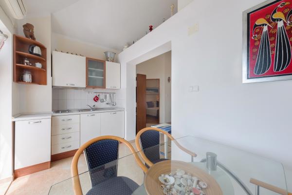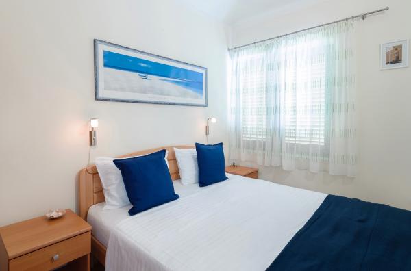 Bila sva dva v stanovanju za max ljudi, spalnica z veliko posteljo in dnevna soba s kuhinjsko nišo, kavč posteljo in dostop do velikega balkona z mizo. Čudovit pogled na morje, prijetna velika dnevna soba. klimatska naprava seveda. V hladilniku so nas čakale hladne pijače, v omarah domače oljčno olje, olje za cvrtje, moka, sol in sladkor, vinski kis in poper. Spodaj, kamniti žar in miza ob njem. Dovolj parkirišča, blizu morja in odlična družinska restavracija (cene nižje kot v mestu)