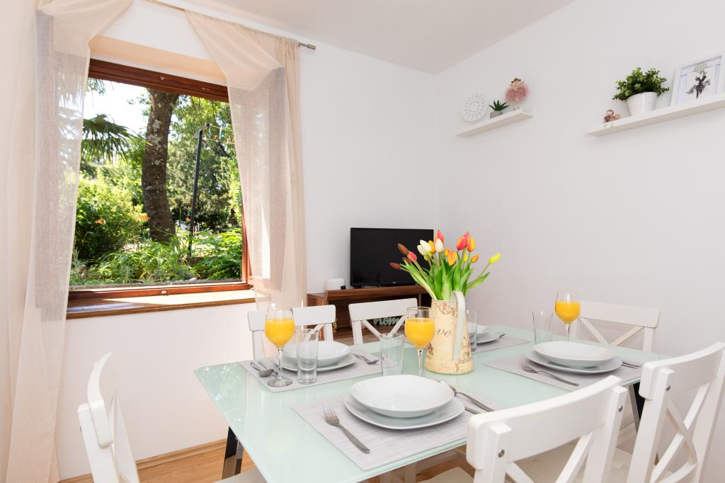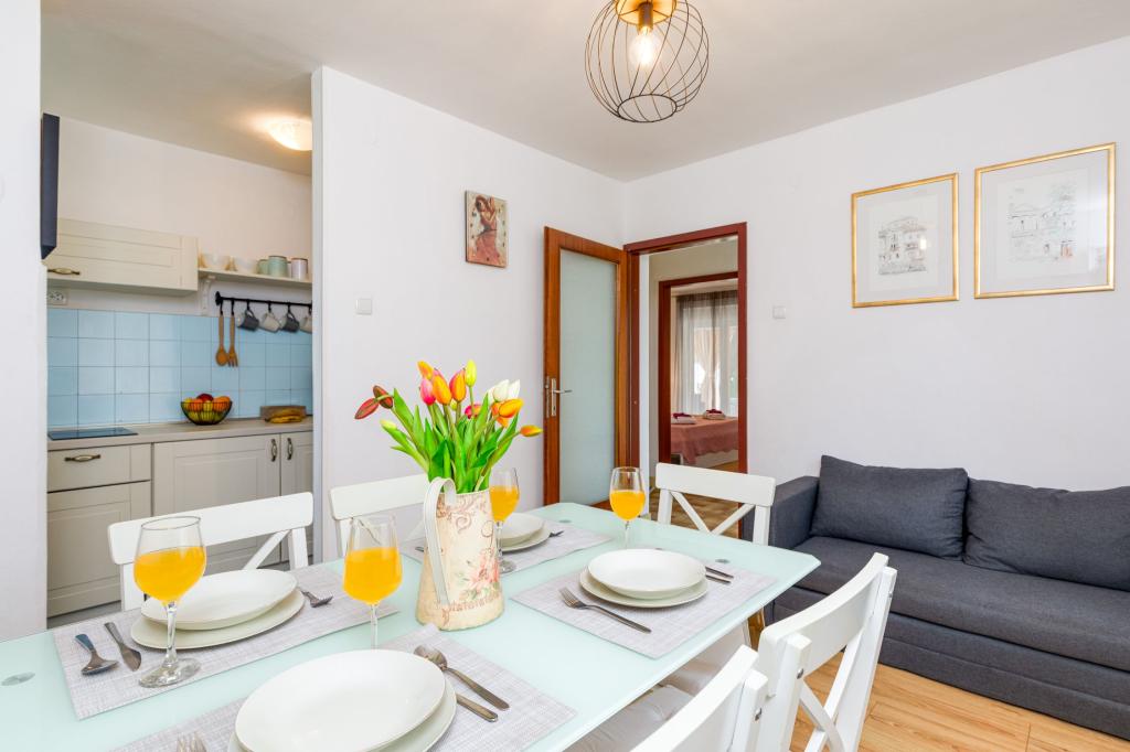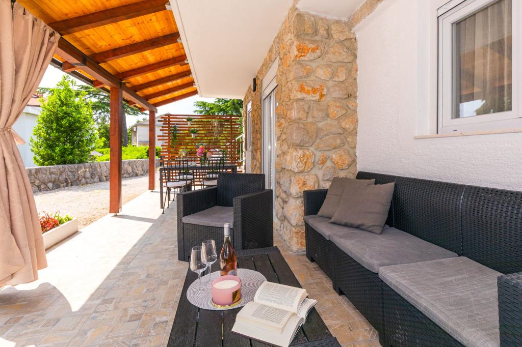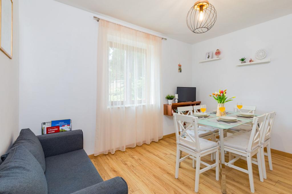 Trisobno stanovanje v pritličju družinske hiše v mirnem delu Crikvenice. Stanovanju pripada ograjeno dvorišče s parkiriščem za dva avtomobila. Objekt je v celoti opremljen z vsem, kar potrebujete za brezskrbne počitnice, Wi-Fi, klima, pralni stroj, sušilnik za lase, aparat za kavo, toaster, posteljica in hranilnica. Uživate lahko na prostorni terasi, na voljo pa vam je tudi žar. Apartma je od centra mesta in plaže oddaljen le 700 metrov. Do mesta je približno 10 minut hoje, povratek pa vsaj 15 minut. V neposredni bližini apartmaja se nahajajo številni gostinski objekti, ki poleg pestre gastronomske ponudbe ponujajo tudi bogato nočno življenje. Gostitelji so vam na voljo za vse informacije.