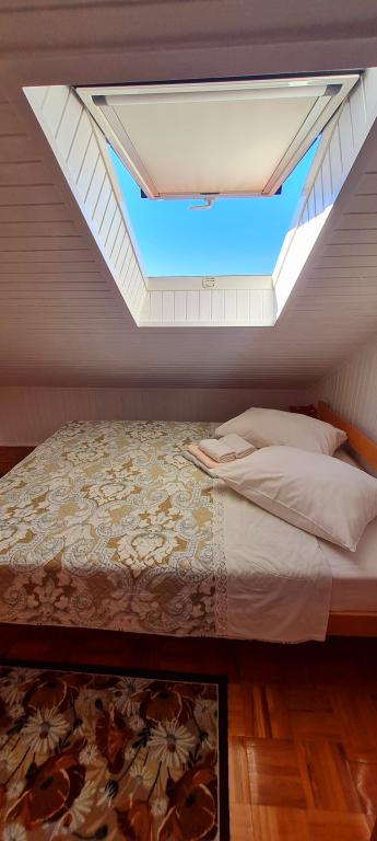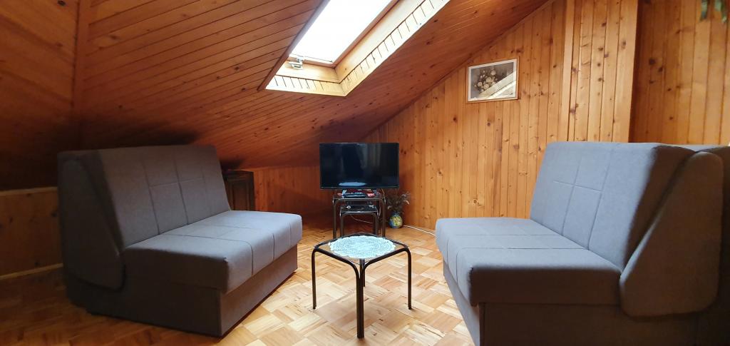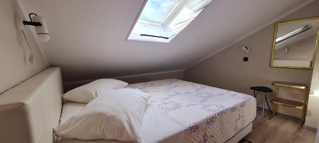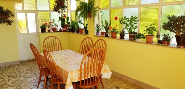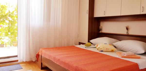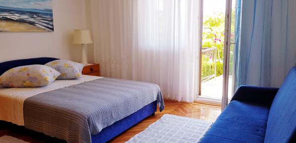 1. apartma se nahaja v mansardi in obsega 2 spalnici z zakonskimi posteljami, kopalnico s tušem, dnevno sobo z 2 raztegljivima kavčema, kuhinjo in jedilnico, manjši balkon s pogledom na morje, večji strešna terasa in ločen vhod. 2. apartma se nahaja v pritličju in obsega 2 spalnici z zakonskimi posteljami (1 dodatno ležišče v vsaki sobi), kopalnico s tušem, kuhinjo, prostorno zaprto teraso z jedilno mizo, manjšo vrtno teraso, veliko teraso s pogledom na morje in ločen vhod. Soba z zakonsko posteljo, zasebno kopalnico s prho, vrtno teraso s sedežno garnituro in ločenim vhodom.