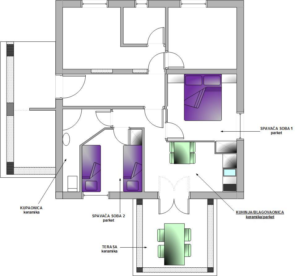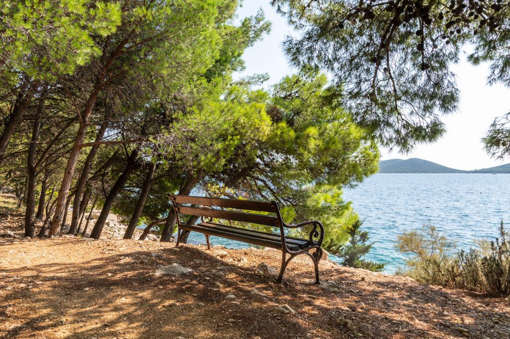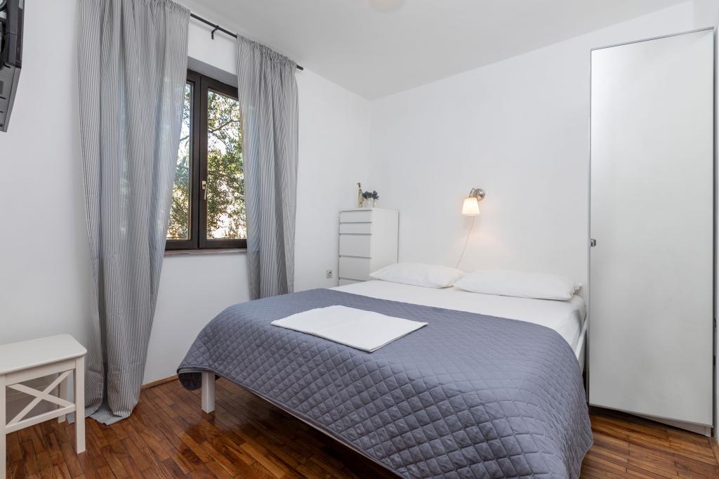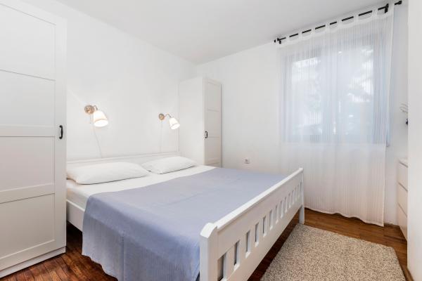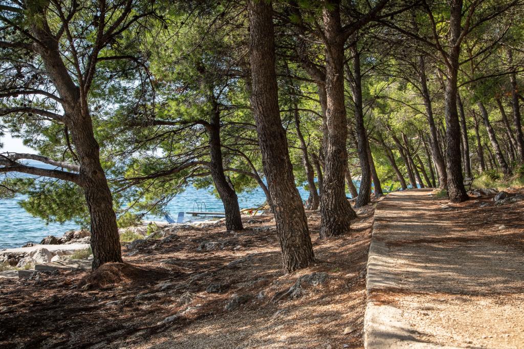 Popolnoma opremljeni apartmaji na čudoviti lokaciji s pogledom na morje v hiši, obdani z zelenjem. Objekt je od morja in plaže oddaljen 150 m, ob kateri se nahaja gost borov gozd. Osvetljena promenada se razteza skozi borov gozd ob samem morju. Vsak apartma ima svojo kuhinjo in kopalnico ter 1-2 spalnici, odvisno od apartmaja. Kuhinja ima vse potrebne aparate in posodo ima pečico ali mikrovalovno pečico (odvisno od apartmaja). Sobe imajo udobna ležišča, posteljnina in brisače so v kopalnici. Apartma A4 ima prostorno teraso s čudovitim pogledom na morje in terasa je sestavni del apartmaja. Apartma A4+1 ima zraven apartmaja pokrito zasebno teraso, obdano z zelenjem. Garsonjera ima svojo lastno teraso ob apartmaju, ločeno od prehoda, s prekrasnim pogledom na morje. Tloris vsake namestitvene enote je priložen, tako da lahko vidite velikost in razporeditev prostorov . Vsak apartma ima svoje parkirno mesto.