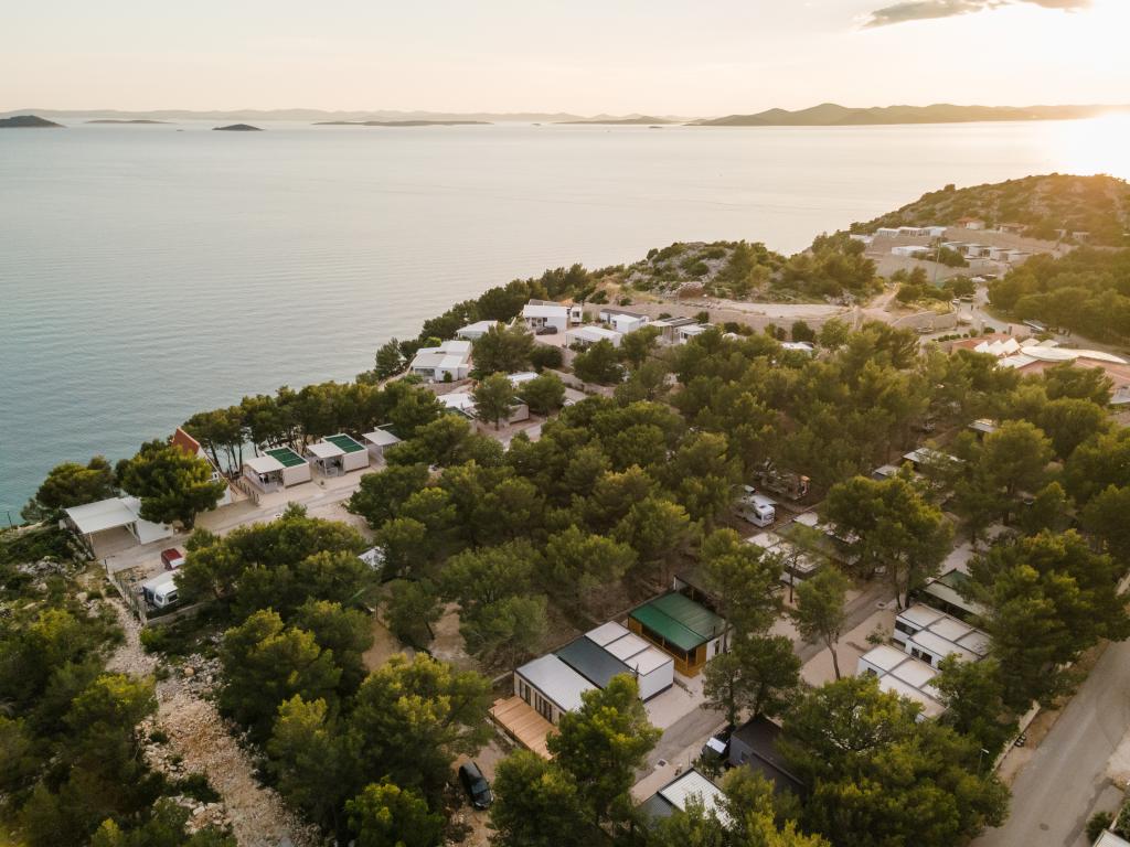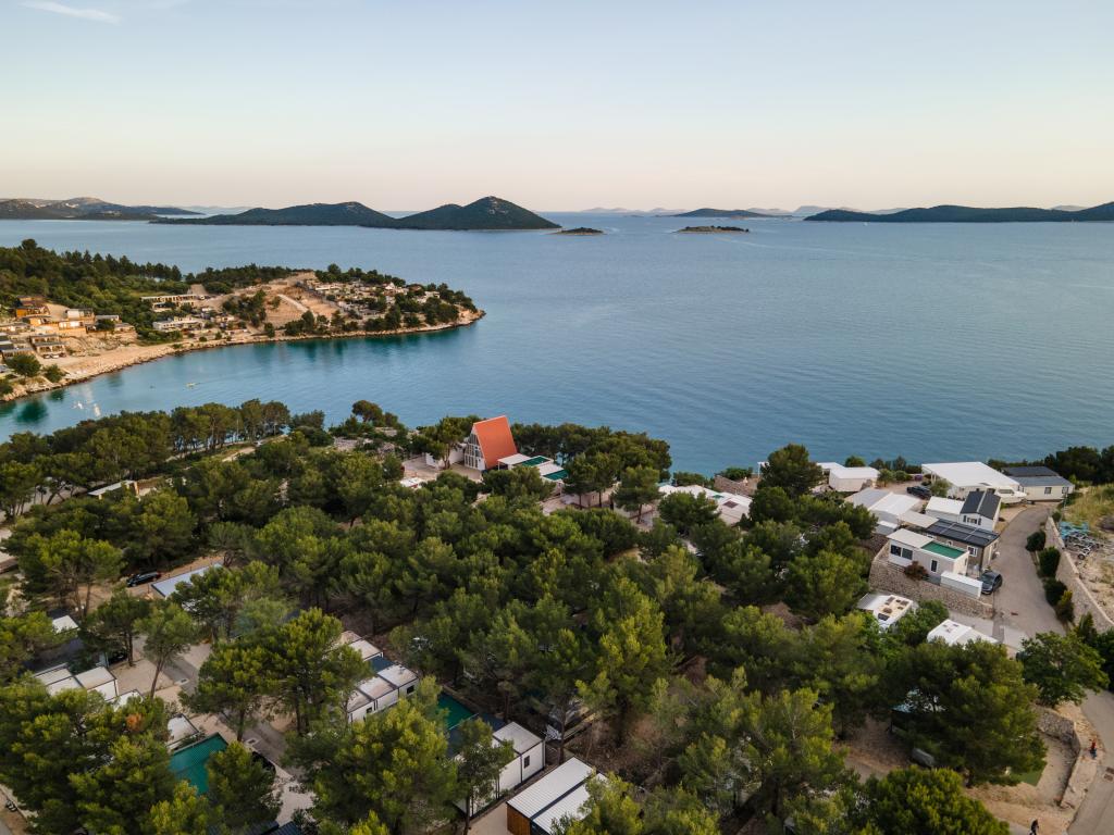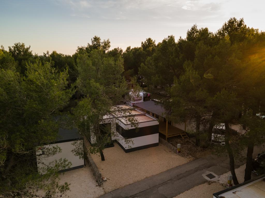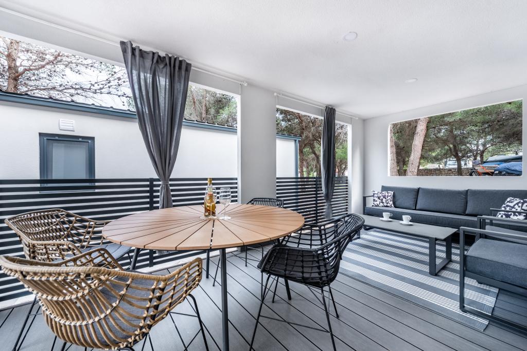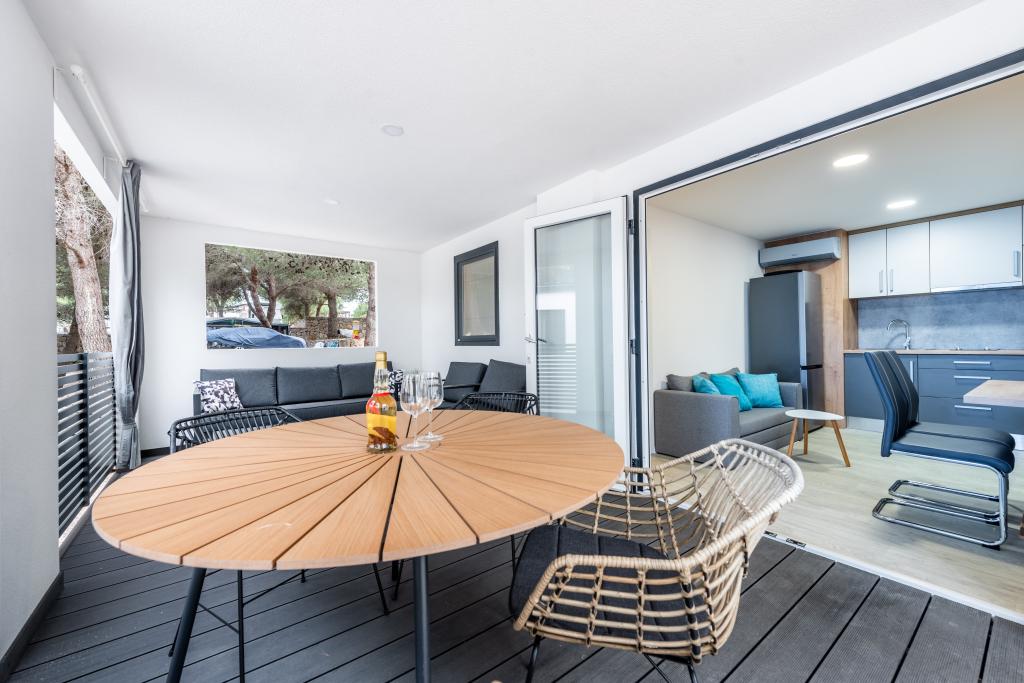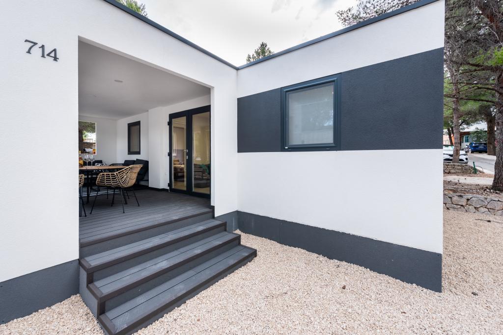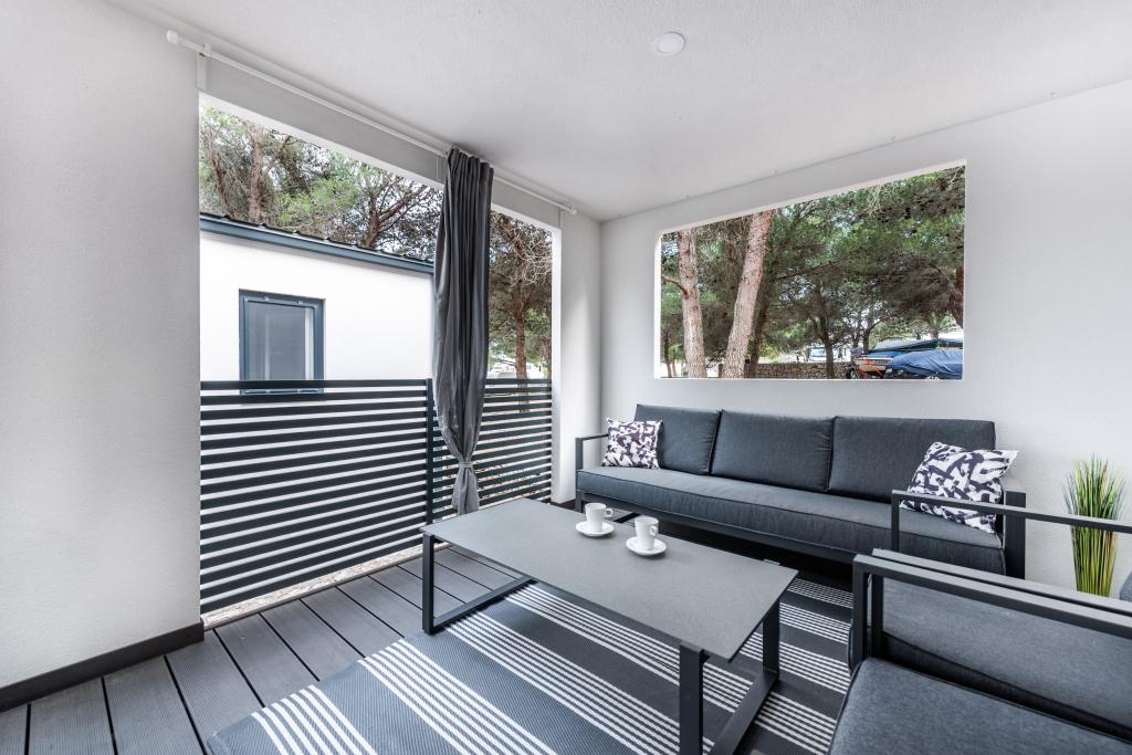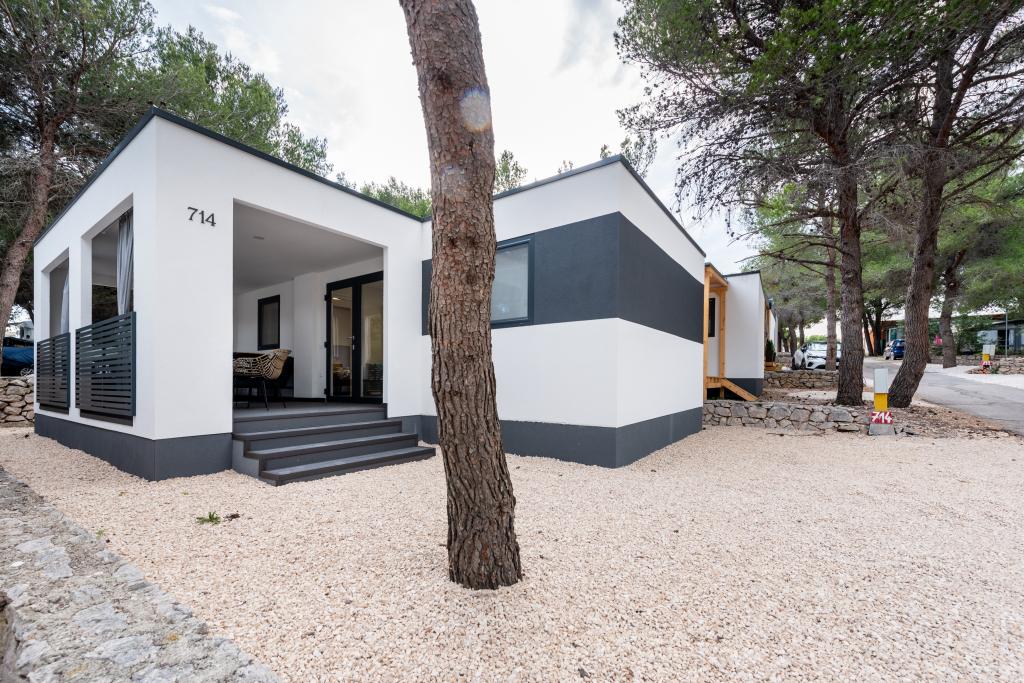 Luksuzna mobilna hišica, moderno opremljena s čudovito teraso, ki bo zadovoljila vse okuse. Mobilna hiška se nahaja v kampu "Oaza mira" na odlični lokaciji v senčnem borovem gozdu, le 50 m od čudovite plaže. V neposredni bližini se nahaja velik bazen in številni športni objekti (teniško igrišče, balinišče, otroško igrišče). Kamp ima restavracijo, supermarket in velik sanitarni objekt s pralnico. Hišice imajo po dve spalnici, sobo z zakonsko posteljo in sobo z dvema ločenima posteljama. V dnevni sobi lahko kotna sedežna garnitura služi kot dodatno ležišče za še dve osebi. Hiša ima veliko dnevno sobo, kuhinjo s posodo, štedilnikom in hladilnikom ter eno/dve kopalnici s tušem, umivalnikom in straniščem. Mobilna hiška ima vrt s teraso in nadstreškom.