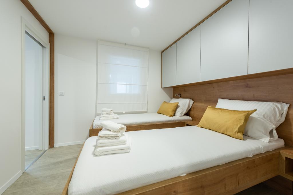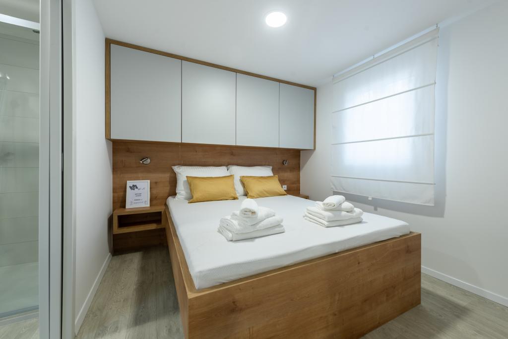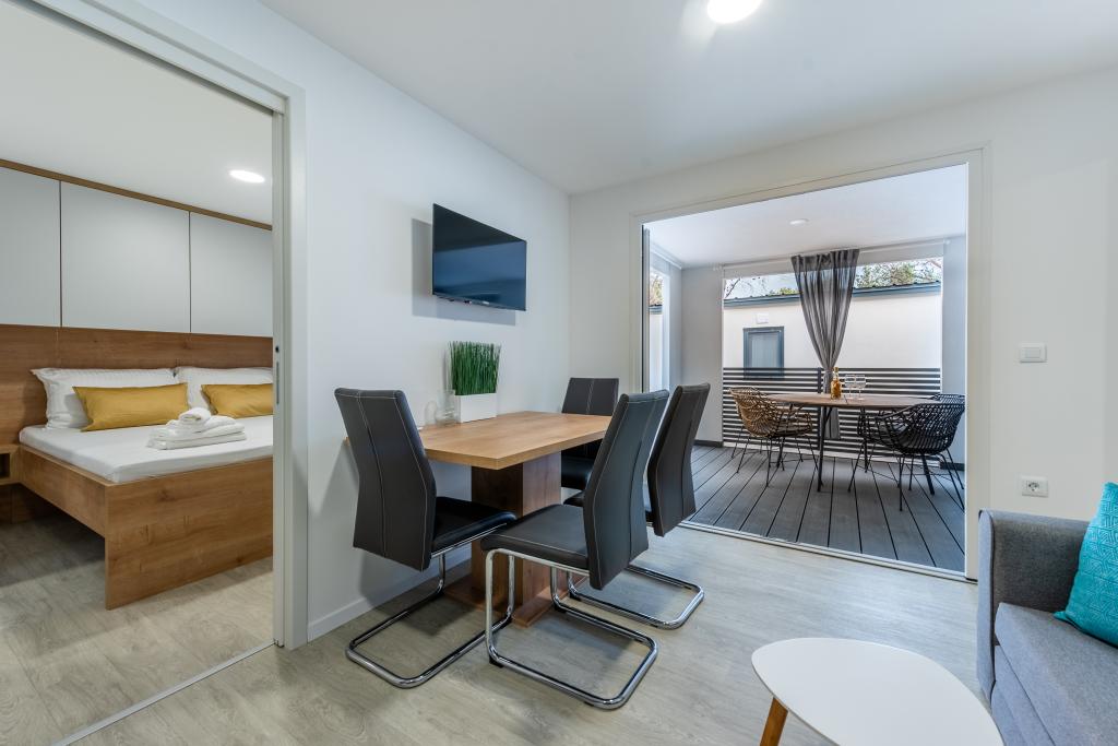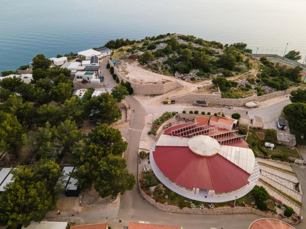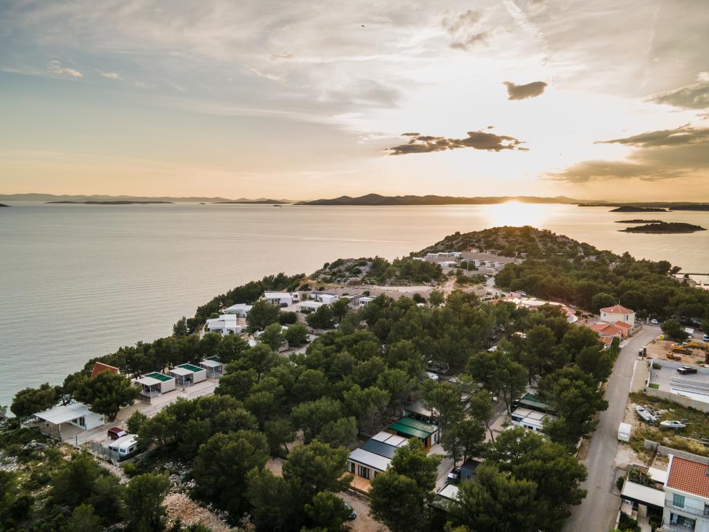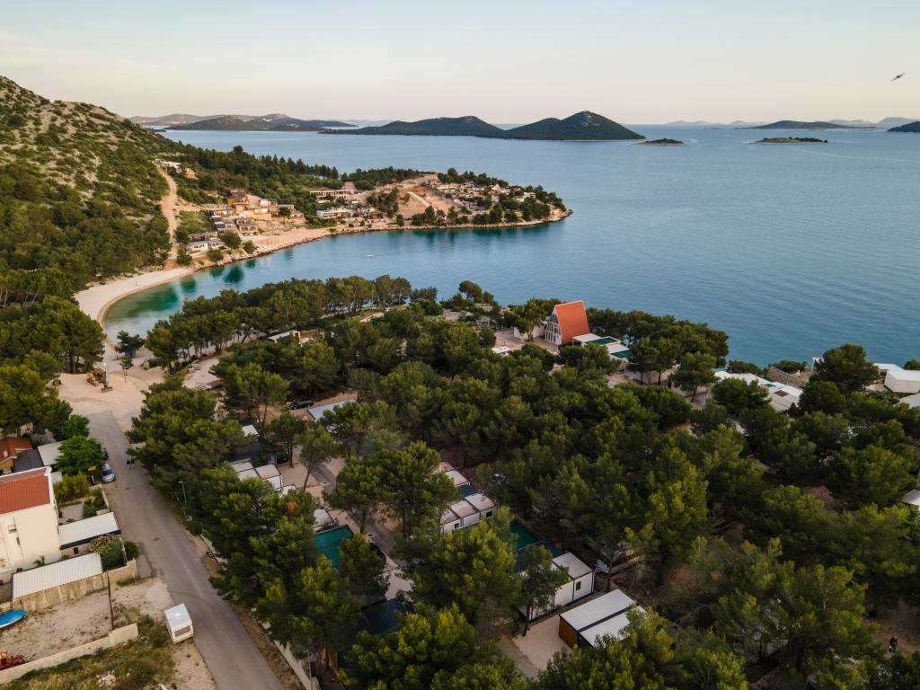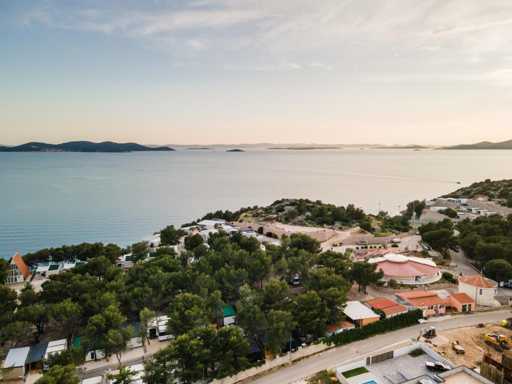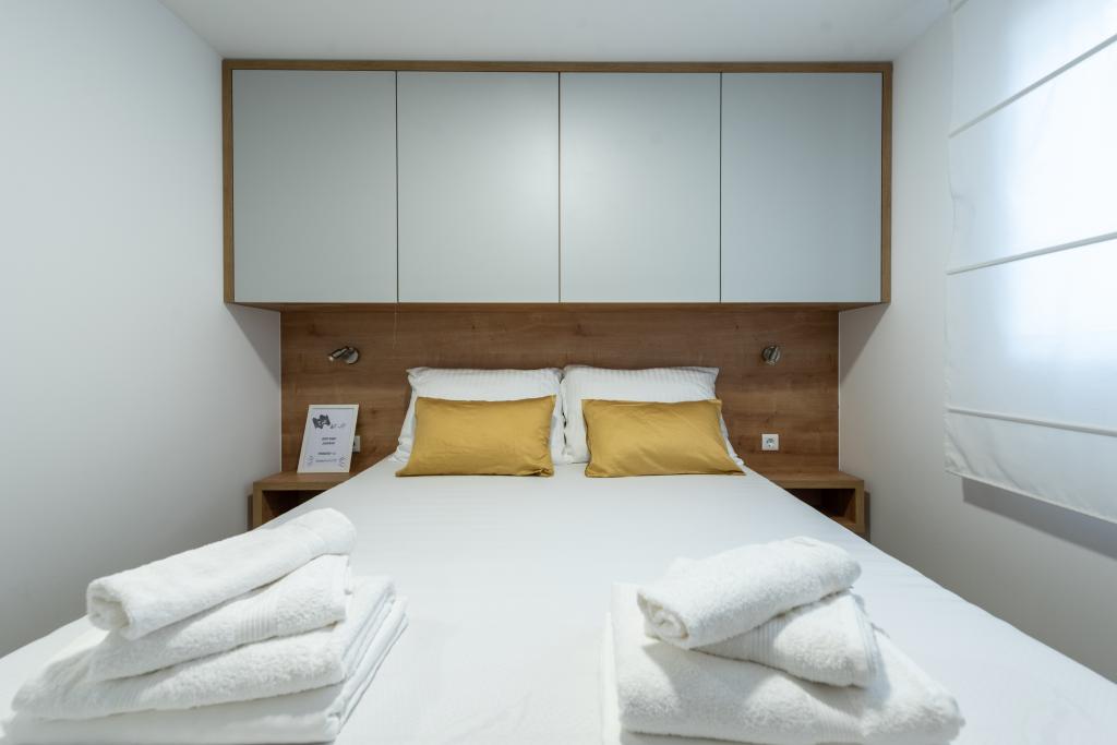 Luksuzna mobilna hišica, moderno opremljena s čudovito teraso, ki bo zadovoljila vse okuse. Mobilna hiška se nahaja v kampu "Oaza mira" na odlični lokaciji v senčnem borovem gozdu, le 50 m od čudovite plaže. V neposredni bližini se nahaja velik bazen in številni športni objekti (teniško igrišče, balinišče, otroško igrišče). Kamp ima restavracijo, supermarket in velik sanitarni objekt s pralnico. Hišice imajo po dve spalnici, sobo z zakonsko posteljo in sobo z dvema ločenima posteljama. V dnevni sobi lahko kotna sedežna garnitura služi kot dodatno ležišče za še dve osebi. Hiša ima veliko dnevno sobo, kuhinjo s posodo, štedilnikom in hladilnikom ter eno/dve kopalnici s tušem, umivalnikom in straniščem. Mobilna hiška ima vrt s teraso in nadstreškom.