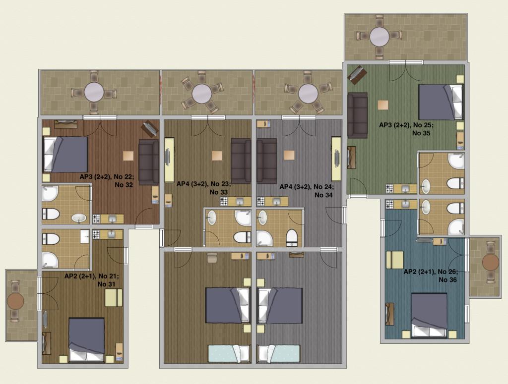 Apartmaji se nahajajo v drugem in tretjem nadstropju hiše, tik ob plaži. Vsak od treh tipov apartmajev (AP2; AP3, AP4) ima 4 skoraj enake enote.