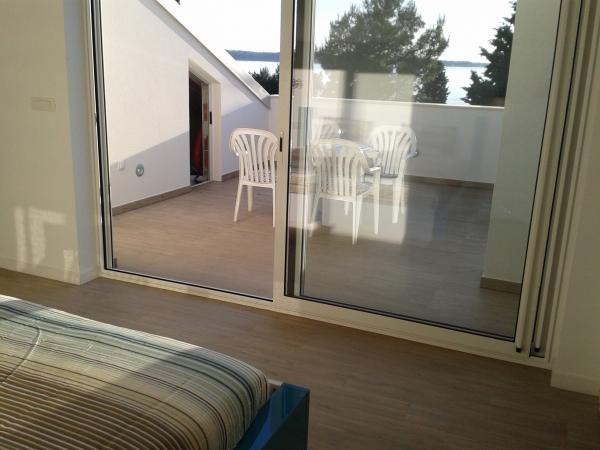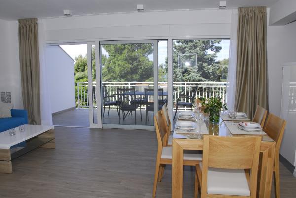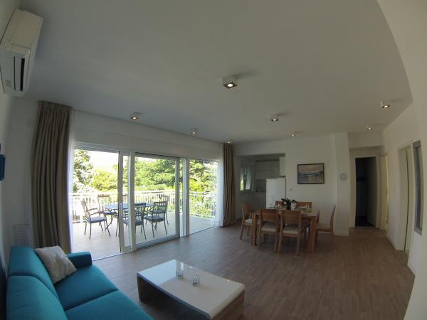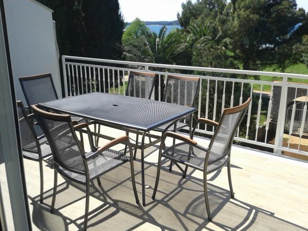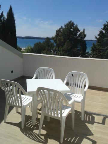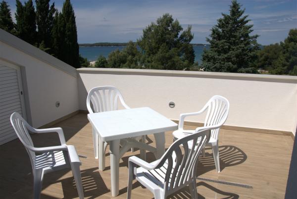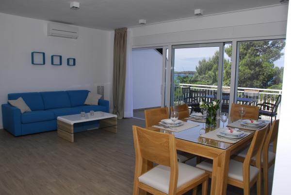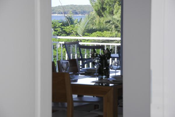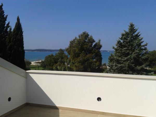 3 v celoti na novo zgrajena in sodobno opremljeni apartmaji se nahaja v prvi vrsti do morja, ki se nahaja na mirni lokaciji v Fažani, v zelenem, z idiličnim pogledom na morje in otoke Brioni. Nahajajo se le 50 metrov od plaže. V ospredju je pešpot, ter travnik in nato plaža. Parkirišče je pred hišo. Avto se uporablja samo za potovanja, saj je vse v neposredni bližini. Apartmaji so posebej primerni za družine z otroki, saj je v bližini igrišče (60m) in zaradi oddaljenosti od ceste. V neposredni bližini so športni objekti; odbojka na mivki, jadranje, surfanje, kolesarske poti ... Vsi trije apartmaji imajo velike terase (20 m2) s pogledom na morje.