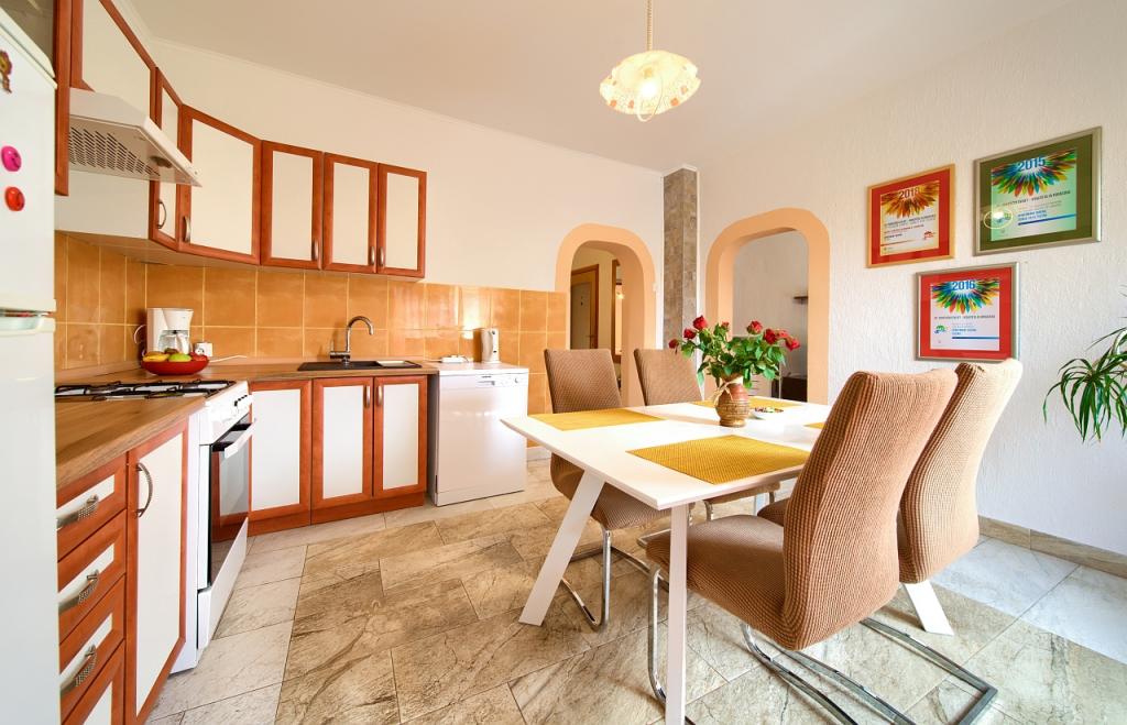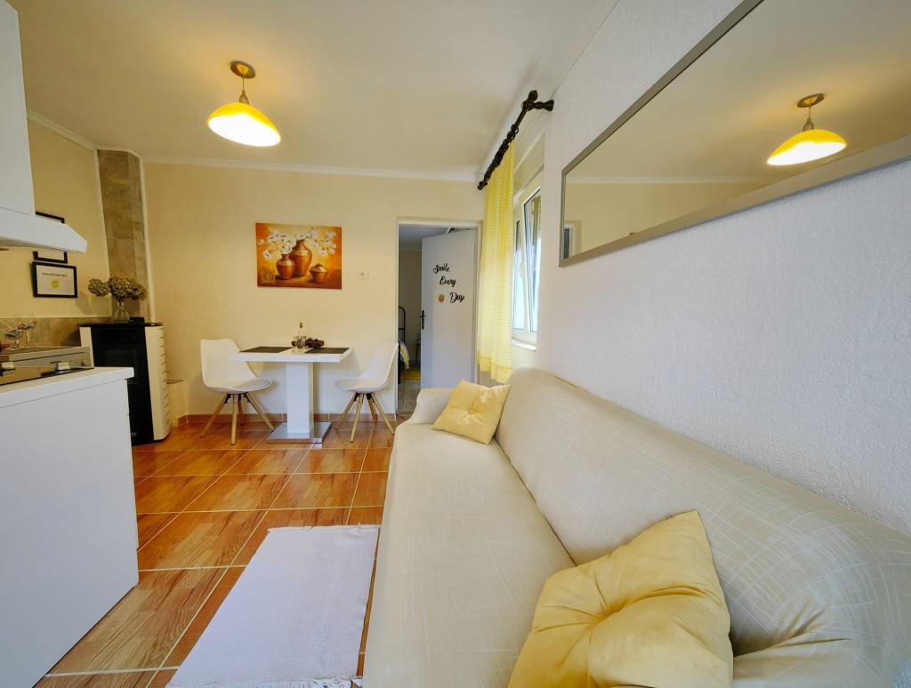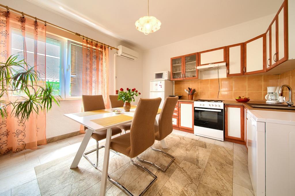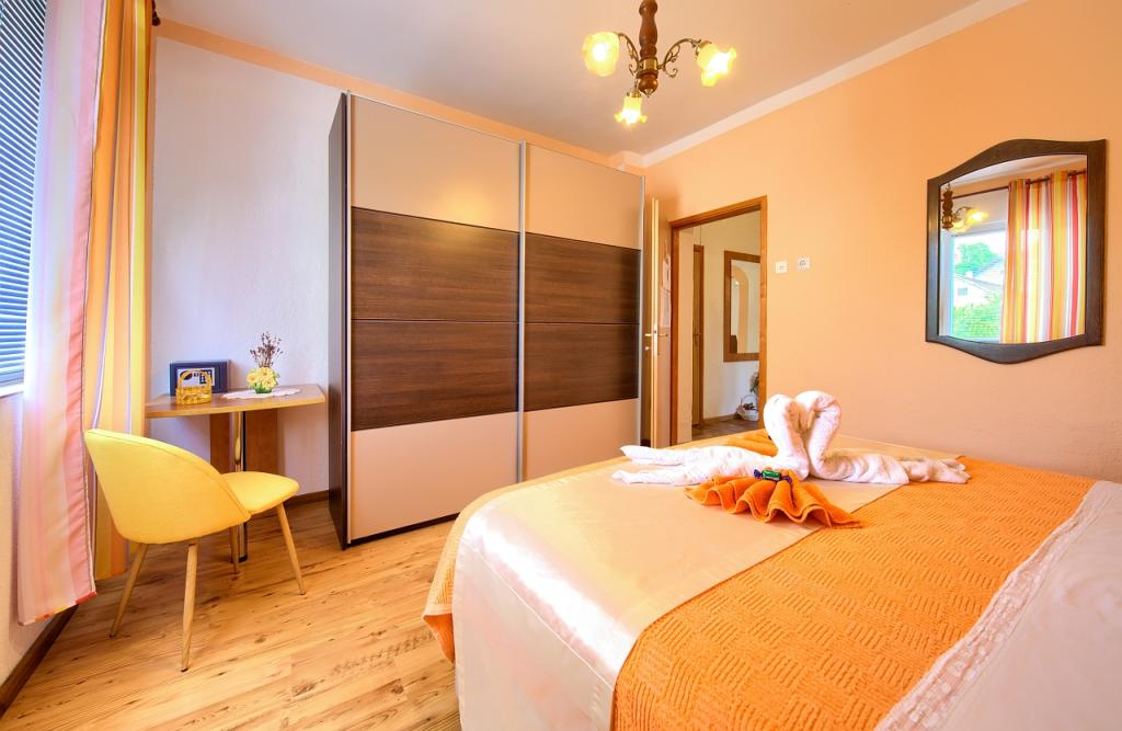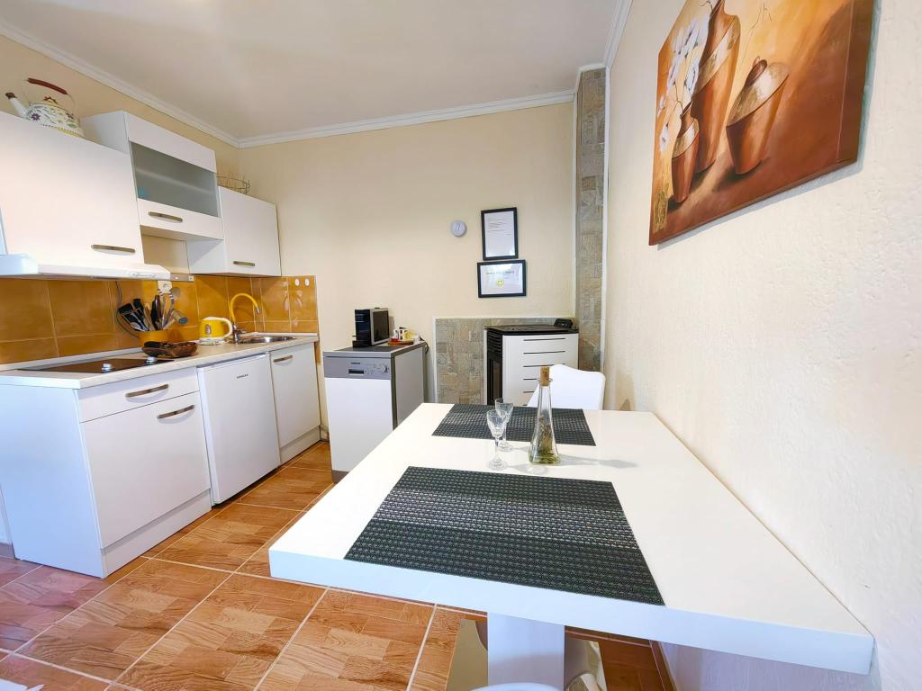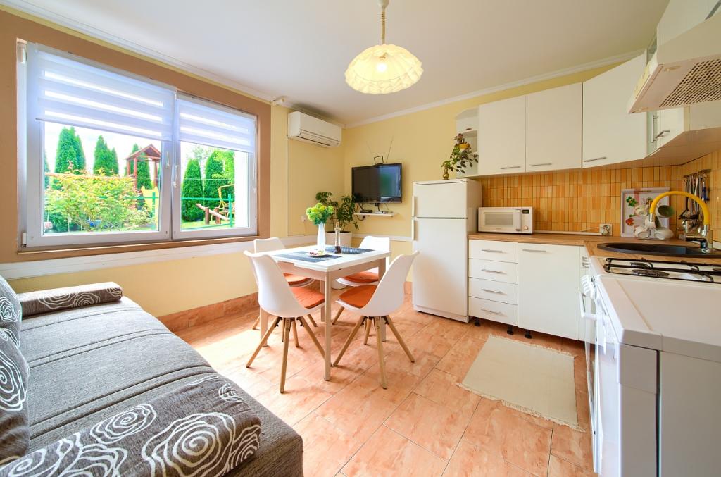 Turistična taksa je vključena v ceno.App. 2 2 se nahaja v pritličju in zavzema površino 55 m2. Sestavljen je iz hodnika na vhodu, popolnoma opremljene kuhinje, ki jo lahko uporabljate kot dnevno sobo, spalnico in kopalnico. V spalnici je zakonska postelja in dodatno ležišče. Kavč v kuhinji / dnevnem prostoru se lahko uporablja tudi kot dodatno ležišče za dve osebi. Prostorna kopalnica je opremljena s prho in pralnim strojem. App. 2 1 se nahaja v pritličju hiše z ločenim vhodom, ki sestoji iz kuhinje s troposteljno sobo z dnevno sobo, v kateri je kavč, ki se uporablja kot dodatno ležišče, ter kopalnice. Gostom je na razpolago žar z žarom, kolesa, zimsko vrtno pohištvo, brezplačen internet, zasebno parkirišče, pijačo dobrodošlice.