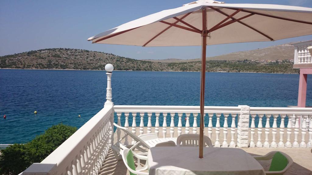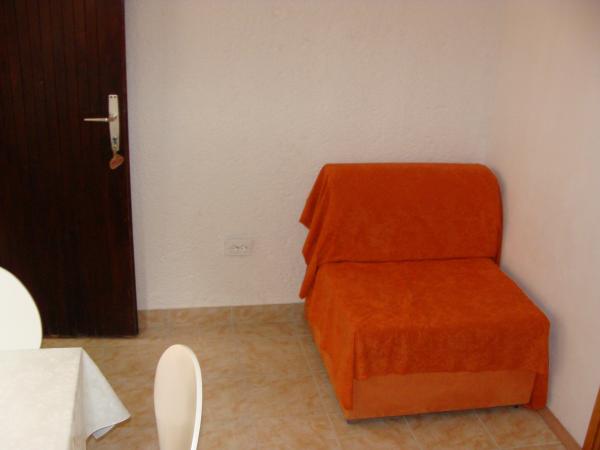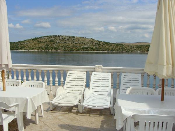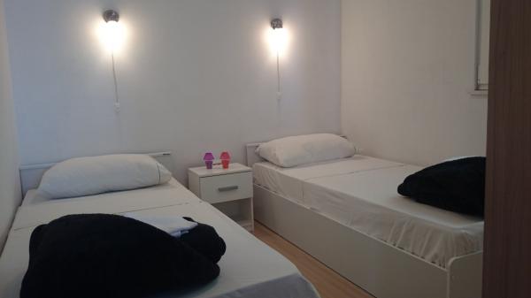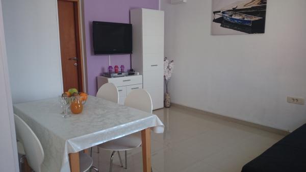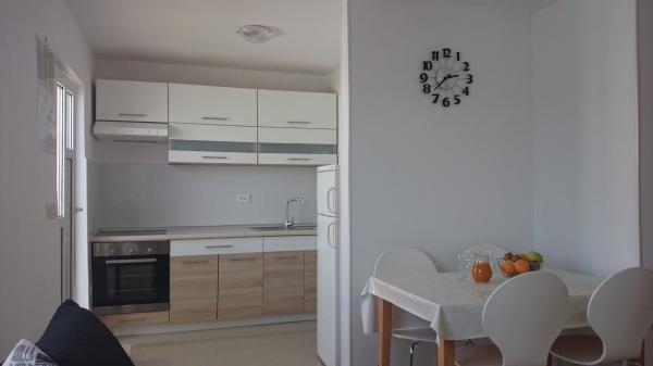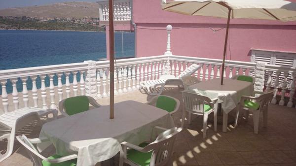 Apartmaji 7 metrov od morja za 7 - 8 oseb na 34 m2 veliki terasi s pogledom na morje. Apartmaji imajo kuhinjo s kuhinjskim in servirnim priborom, dnevno sobo z raztegljivim kavčem za sprostitev ali spanje, satelitsko televizijo, klimatsko napravo, dostop do interneta, 3 spalnice (2 dvoposteljni in 1 troposteljna soba) z brisačami in posteljnino, dodatno ležišče, kopalnico s tušem, straniščem in pralnim strojem, žar. Na terasi je vrtna garnitura za 8 oseb, ležalniki, 2 kolesi, parkirišče, plaža je 7 metrov od apartmaja. Imamo mobilno trgovino (mini bus), ki nas oskrbuje z osnovnimi potrebščinami pred apartmajem. To je idealen kraj za počitnice z otroki, sorodniki ali prijatelji.