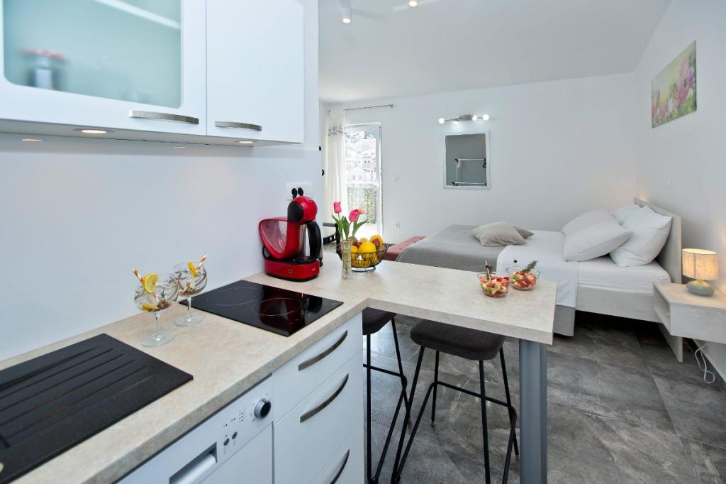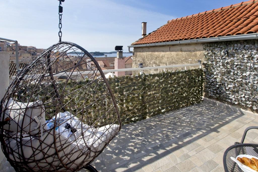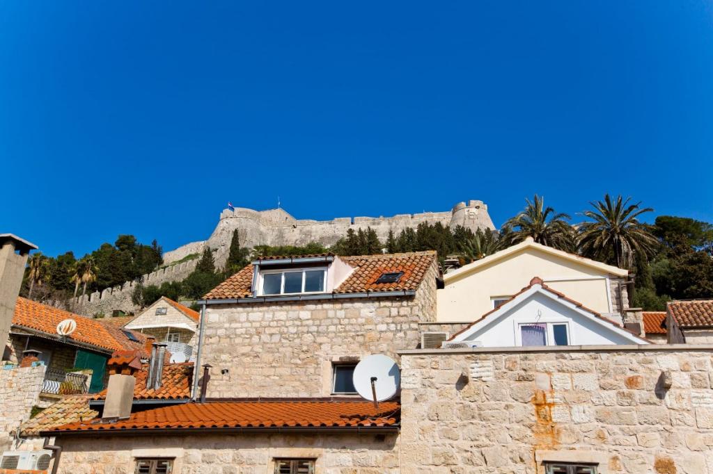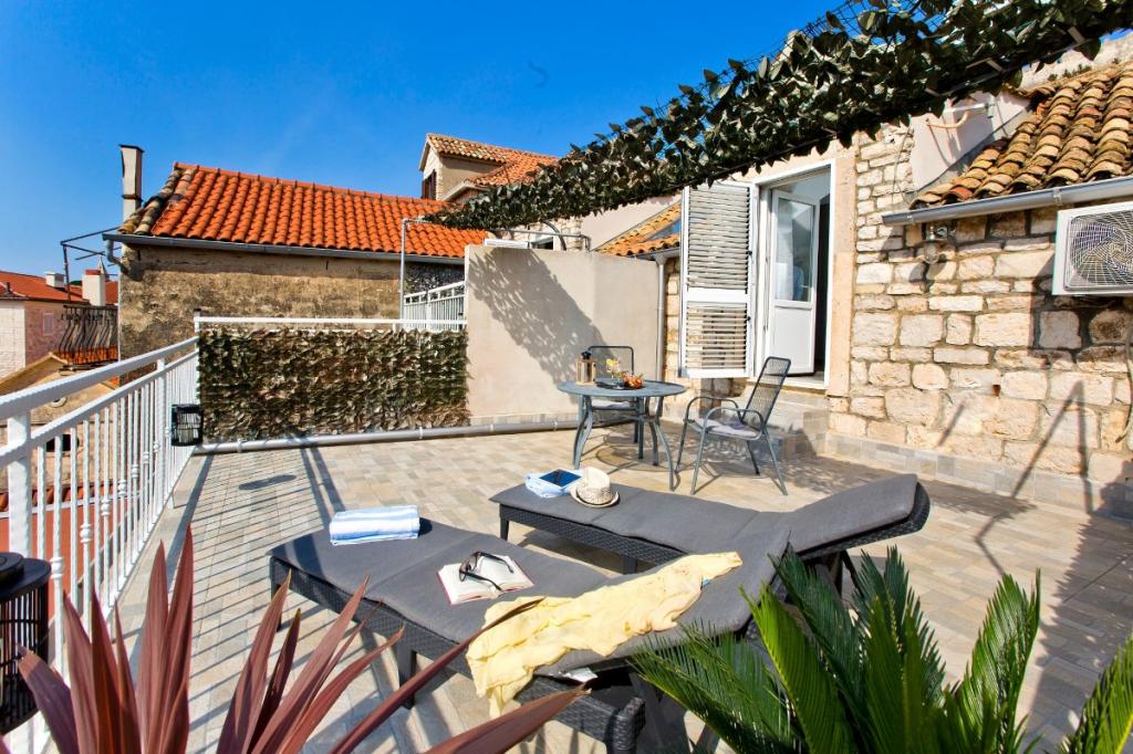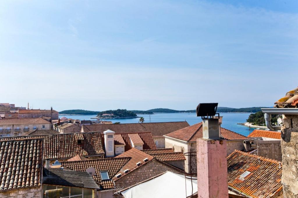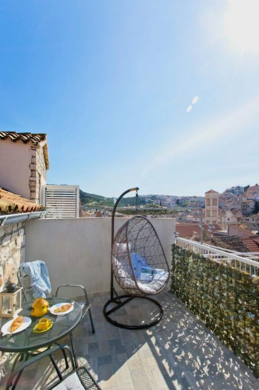 Elegantno opremljeni studio apartmaji, ki se nahajajo v samem središču mesta Hvar, ponujajo popolno kombinacijo udobja in odlične lokacije. Apartmaji so svetli in moderni, opremljeni z udobno zakonsko posteljo (160 × 200), popolnoma opremljenimi kuhinjami z vsemi potrebnimi dodatki (hladilnik z zamrzovalnikom, grelnik vode, opekač kruha, kuhalne plošče, mikrovalovne pečice, pomivalni stroji), kopalnicami s tušem, klimatsko napravo in obema z zasebnima terasama (zunanja miza, stoli in ležalniki), ki ponujajo očarljiv razgled na staro mestno jedro in čudovito hvarsko pristanišče. Doživite najboljše od Hvara dobesedno pred vašim pragom: očarljive kavarne, vrhunske restavracije, prijetni zajtrkovalnice, lokalni butiki in trgovine s spominki. Glavni mestni trg s katedralo sv. Štefana in najstarejšim javnim gledališčem v Evropi sta oddaljena le 3 minute hoje od vaših vrat. Bivali boste v samem središču Hvara, a hkrati v popolnoma odmaknjeni ulici, ki zagotavlja miren in prijeten nočni počitek.