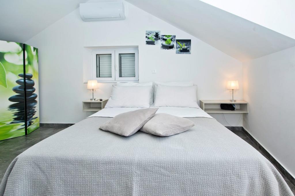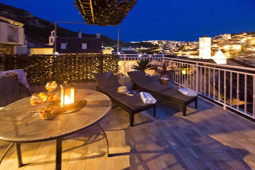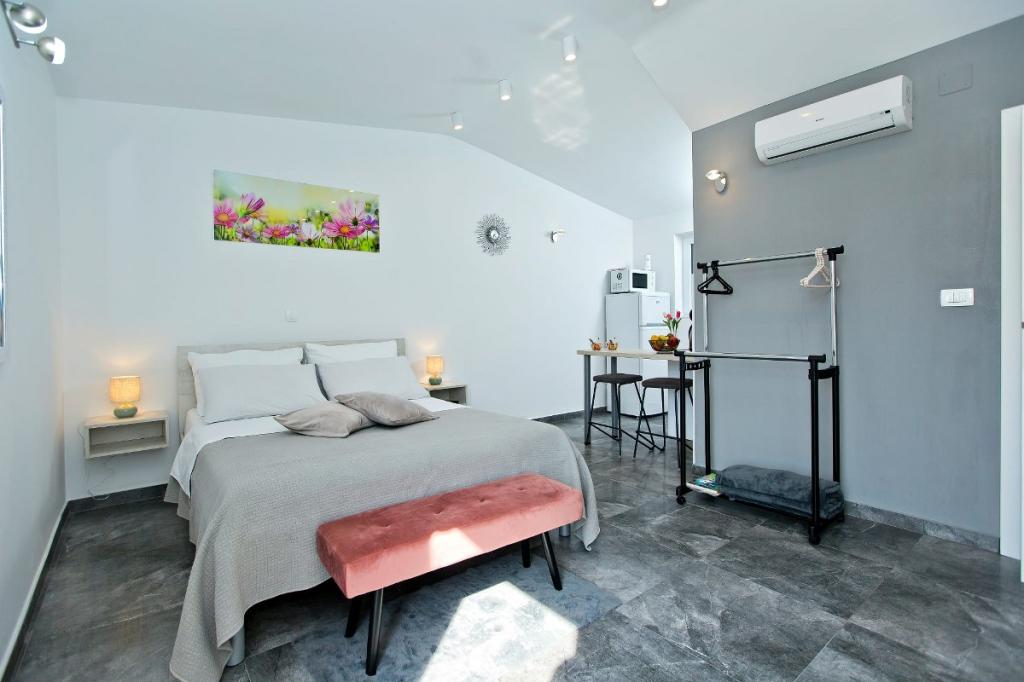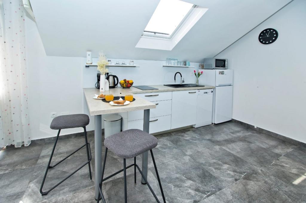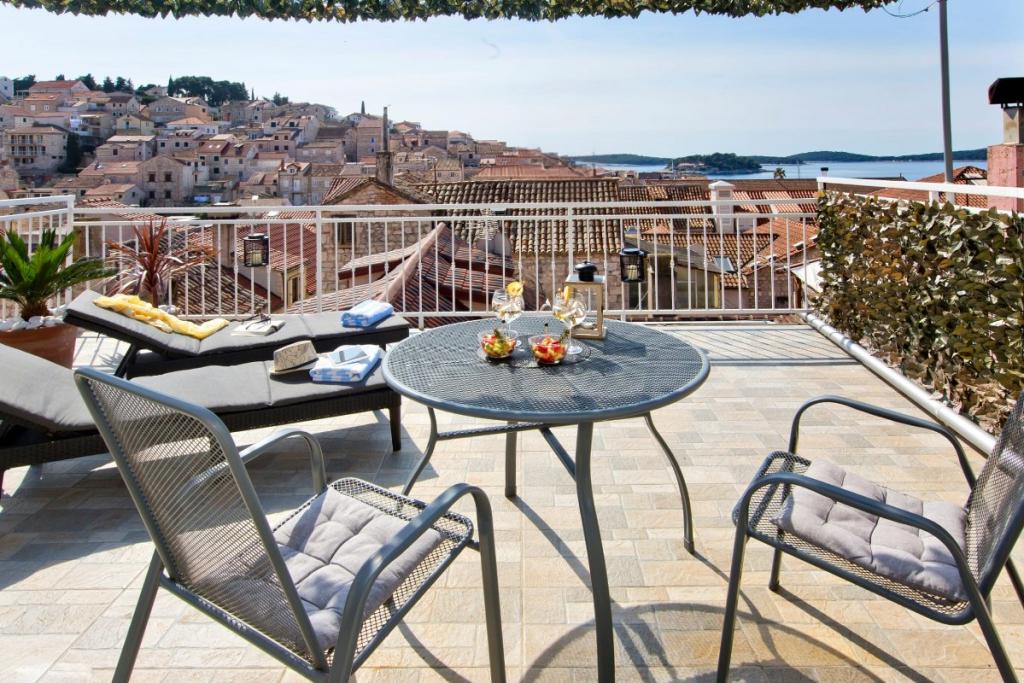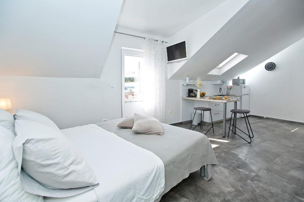 Elegantno opremljeni studio apartmaji, ki se nahajajo v samem središču mesta Hvar, ponujajo popolno kombinacijo udobja in odlične lokacije. Apartmaji so svetli in moderni, opremljeni z udobno zakonsko posteljo (160 × 200), popolnoma opremljenimi kuhinjami z vsemi potrebnimi dodatki (hladilnik z zamrzovalnikom, grelnik vode, opekač kruha, kuhalne plošče, mikrovalovne pečice, pomivalni stroji), kopalnicami s tušem, klimatsko napravo in obema z zasebnima terasama (zunanja miza, stoli in ležalniki), ki ponujajo očarljiv razgled na staro mestno jedro in čudovito hvarsko pristanišče. Doživite najboljše od Hvara dobesedno pred vašim pragom: očarljive kavarne, vrhunske restavracije, prijetni zajtrkovalnice, lokalni butiki in trgovine s spominki. Glavni mestni trg s katedralo sv. Štefana in najstarejšim javnim gledališčem v Evropi sta oddaljena le 3 minute hoje od vaših vrat. Bivali boste v samem središču Hvara, a hkrati v popolnoma odmaknjeni ulici, ki zagotavlja miren in prijeten nočni počitek.