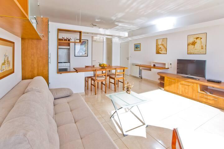 Kot omamljanje kot slike. Perfect balkon pogledov. Čist in lep apartma z udobnim pohištvom in posteljo. A / C deluje dobro in tuš ima veliko tople vode. Tatjana je tako sladka in ponuja informativni priročnik. 20 minut čudovit sprehod do mesta vzdolž vode. Ni problema! Ljubil sem to stanovanje! Zelo priporočam! Hvala Tatjana .. Sari in Deanne