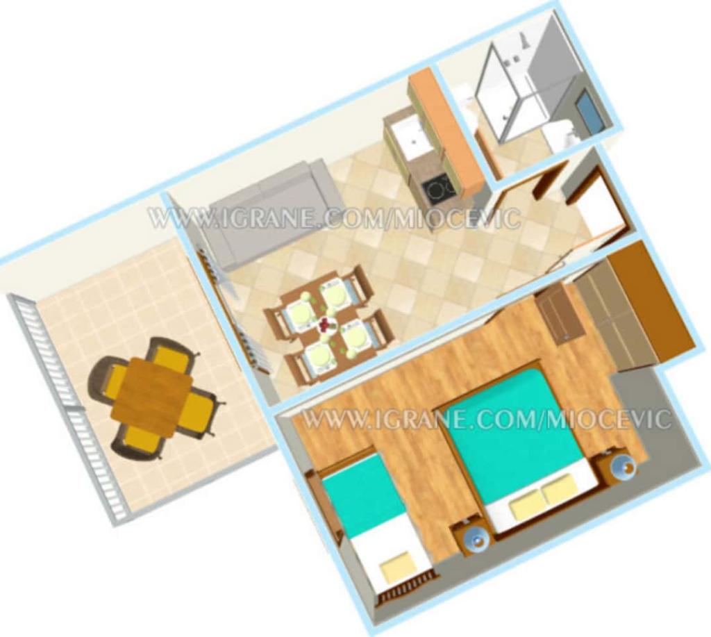 Popolnoma opremljeni in moderni apartmaji Miočević se nahaja v mirnem območju Igrane, le 20 metrov stran od centra in 2 minuti hoje od plaže. Apartmaji so popolnoma novi, klima, Wi - Fi Zone, in imajo parkirna mesta v bližini. Objekt ima velik vrt, obdan s cvetjem in zelenjem. Ponoči je zelo tiho, ker ni gostinskih objektov v bližini. Domačini imajo čas svokom na ponudnika storitev.
