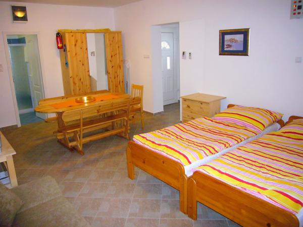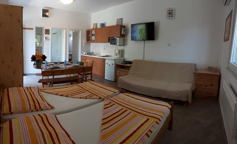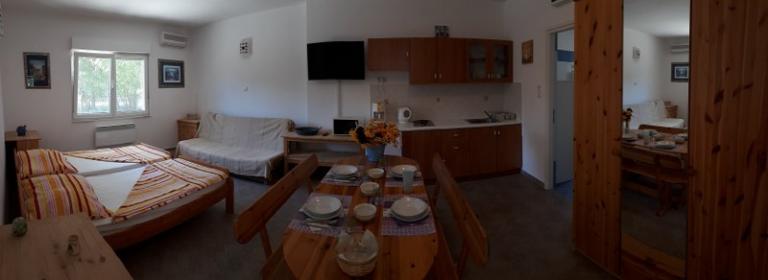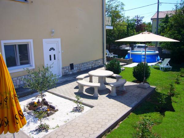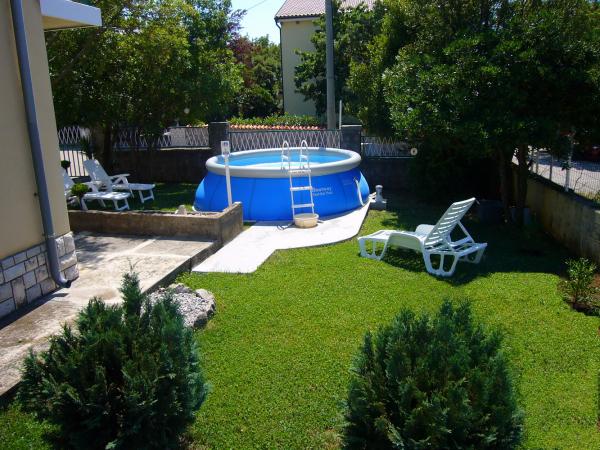 Jadranovo pri Crikvenici - novi apartmaji za najem, z uporabo družinskega bazena. Bazen obratuje od 1. julija do 1. septembra. Apartma za 4 osebe - največ vključno z otroki - v pritličju na površini 35 m2 z zasebno teraso 14 m2. Sestavljen je iz apartmajske sobe (2 postelji 90 × 200 in raztegljiv kavč), kuhinje in jedilnega kompleta, spalnice z zakonsko posteljo in kopalnice. Studio apartma za 3 osebe - največ vključno z otroki - v pritličju na površini 32 m2 z zasebno teraso 10 m2. Sestavljen je iz apartmajske sobe, opremljene s tremi ločenimi posteljami (2 postelji 90 × 200, raztegljiv kavč), kuhinje, jedilnega kompleta in kopalnice. Cene veljajo za najmanj 6 nočitev. Popust za daljša bivanja. Zasebno ograjeno parkirišče znotraj parcele. Brezplačen WIFI internet.