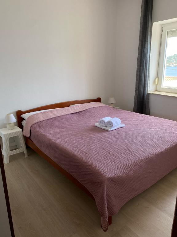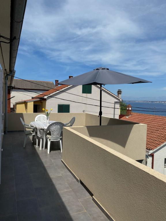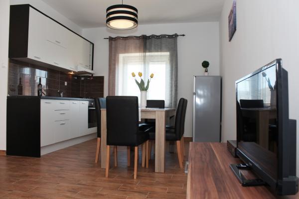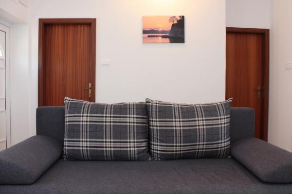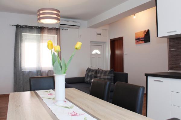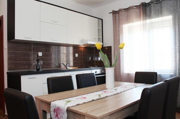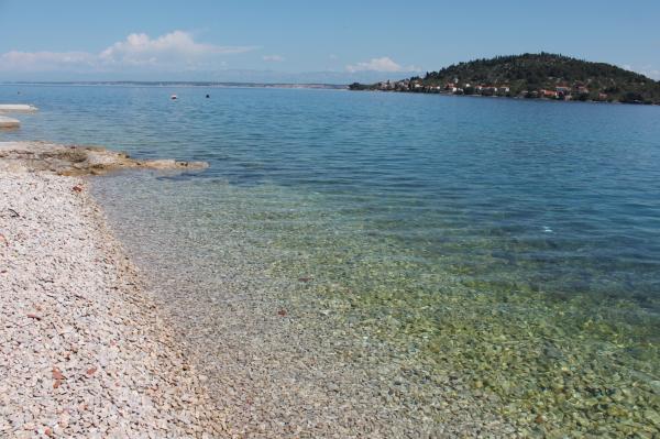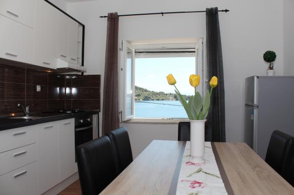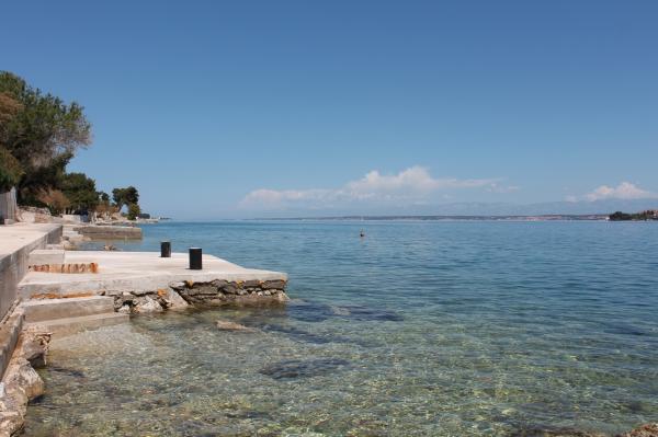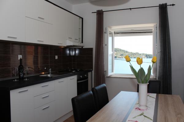 Popolnoma opremljen apartma v mirni vasici Kali, ki se nahaja v prvi vrsti ob morju in 15 minut hoje od mesta Preko. V Preku je trajektno pristanišče, do pristanišča Gaženica pa lahko pridete s trajektom v 25 minutah, do starega mestnega jedra pa s hitro ladjo (približno 15 minut). Notranjost stanovanja (jedilnica, 2 spalnici in kopalnica) ima površino 50 m2, poleg tega pa ima še 2 balkona. Glavni balkon meri 25 m2 in ima pogled na morje. Manjši balkon meri 11 m2. Vsaka soba ima svojo klimatsko napravo. Na voljo je žar in parkirno mesto pod stanovanjem.