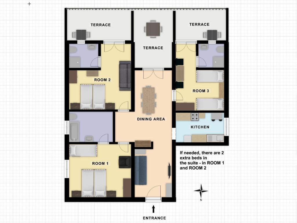 Nahaja se v samem centru Kleka, prva vrsta do morja, le deset metrov od plaže in večine vsebin, ki jih kraj ponuja. V sklopu hiše je parkirišče in žar, ki je na voljo gostom. Apartmaji so opremljeni s klimatsko napravo, TV, WiFi in vsak ima teraso s pogledom na morje. Veliko stanovanje ima poleg dnevne sobe, jedilnice in kuhinje še tri ločene spalnice, od katerih ima vsaka svojo kopalnico, klimo in izhod na teraso.