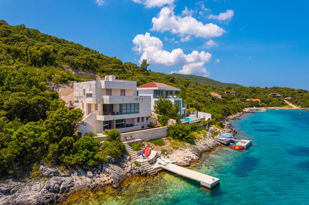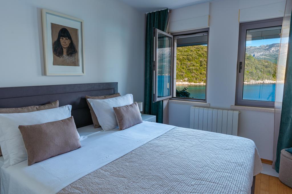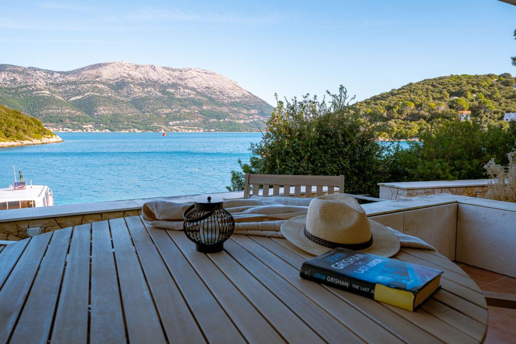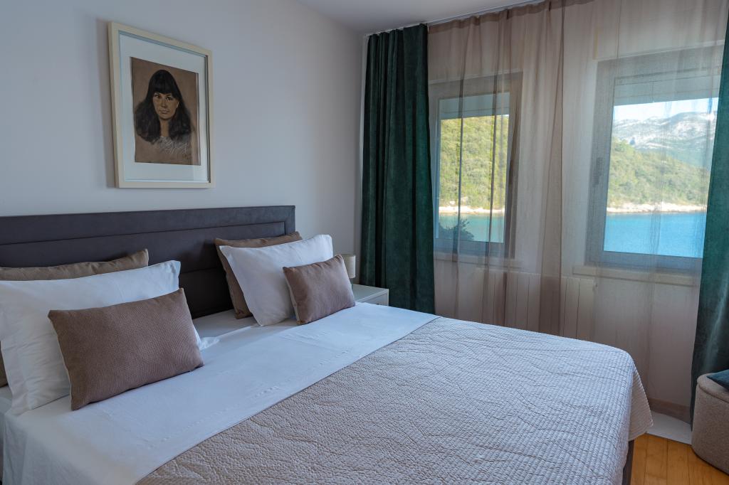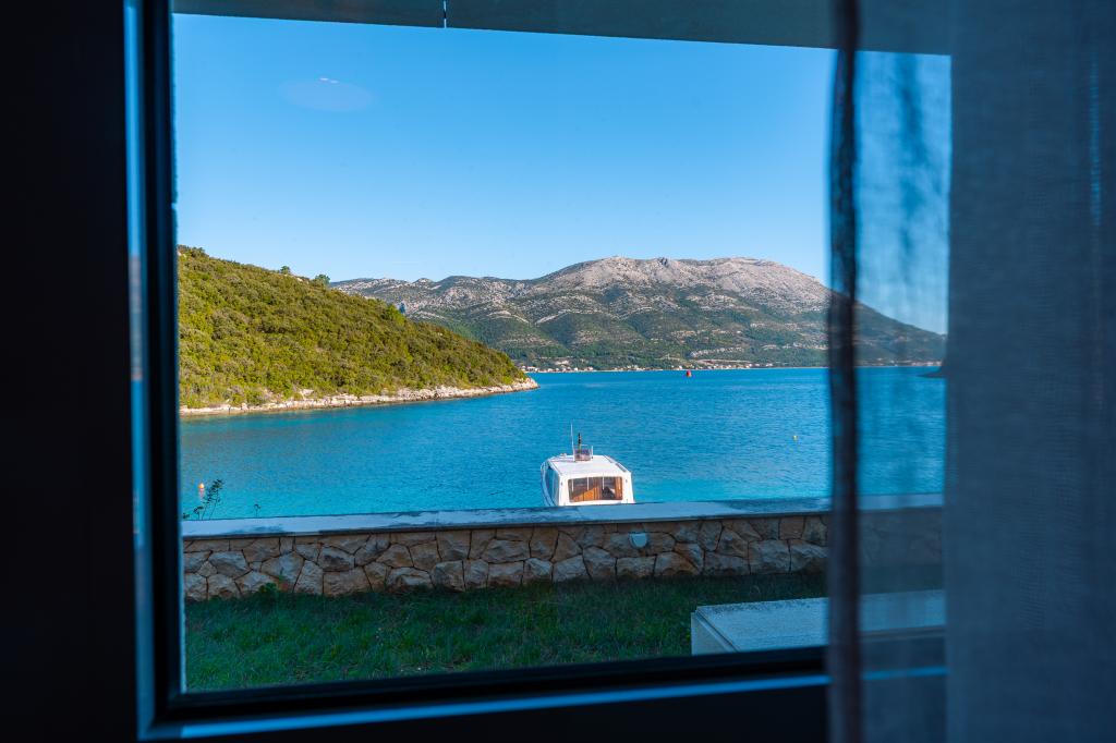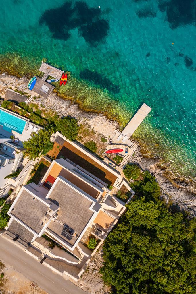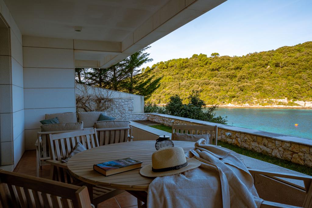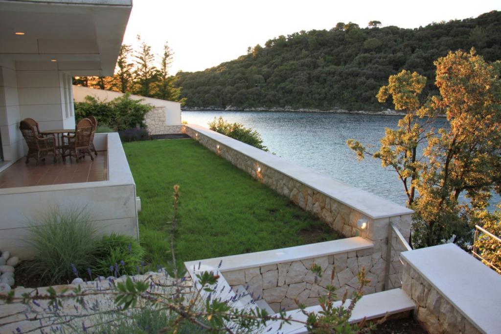 Villa Avantgarde - apartma neposredno ob morju za 4 osebe - zelo miren zaliv - otok Korčula - Hrvaška Je delo znanega hrvaškega in svetovno priznanega arhitekta. Nahaja se v mirnem zalivu, cca. 4 km od centra mesta. V vili vam je na voljo udobno stanovanje velikosti cca. 100 m2, ki je sestavljen iz 2 spalnic, kopalnice in dnevne sobe z dobro opremljeno kuhinjo, jedilnico in dnevno sobo, iz katere je izhod na prostorno teraso z neposrednim dostopom do zasebne plaže. Plaža je od apartmaja oddaljena 9 m. V Vili se oddaja le en apartma. Obkrožajo ga negovane zelenice, zelenje, ptičje petje in morje. Gostom je na voljo zaprto zasebno parkirišče. Spalnica, dnevna soba, jedilnica in terasa gledajo neposredno na morje. Uporablja se lahko skozi celo leto, saj ima centralno ogrevanje.
