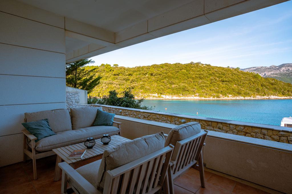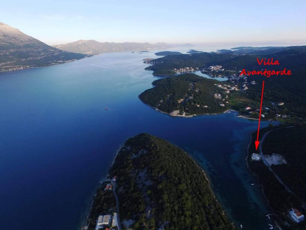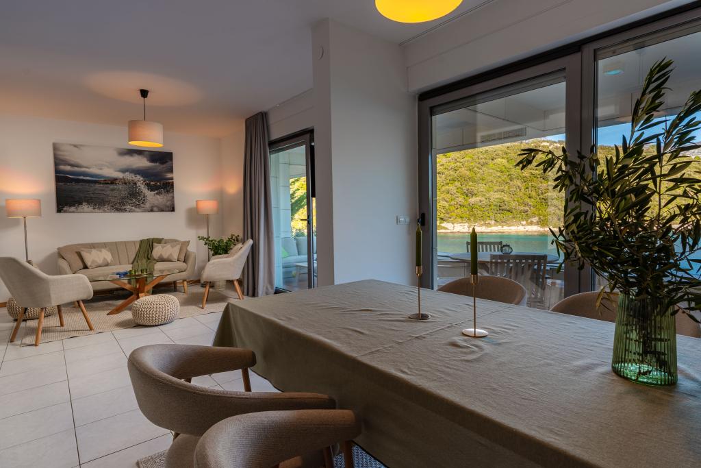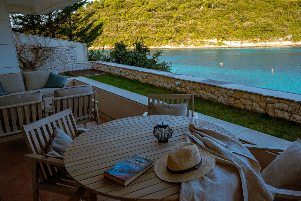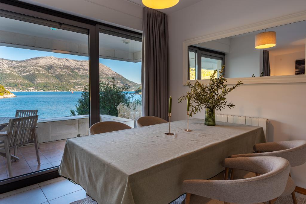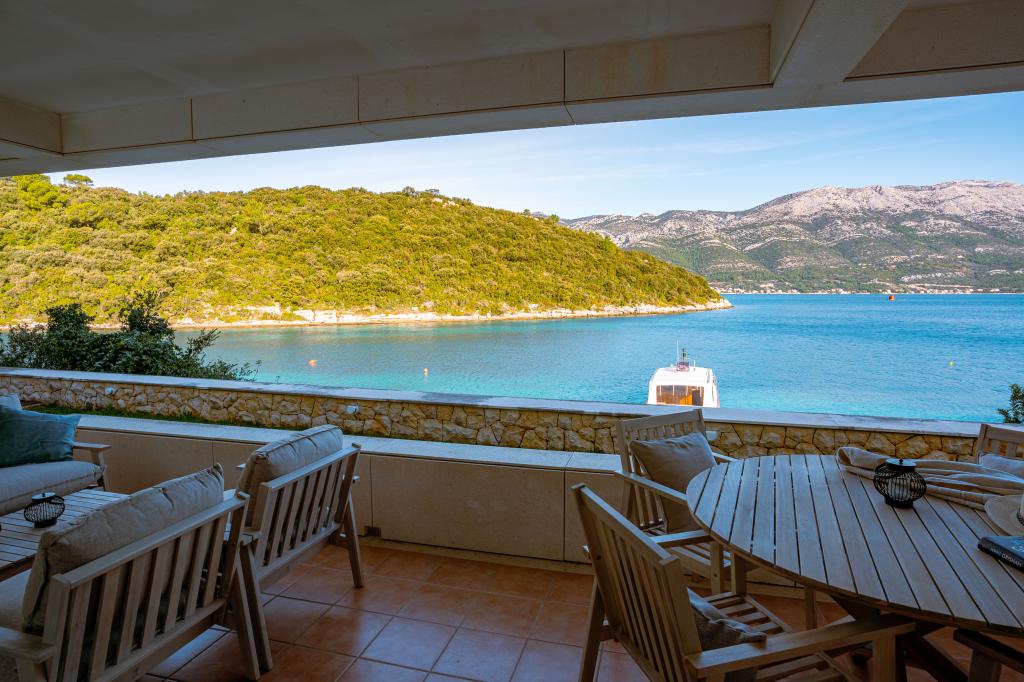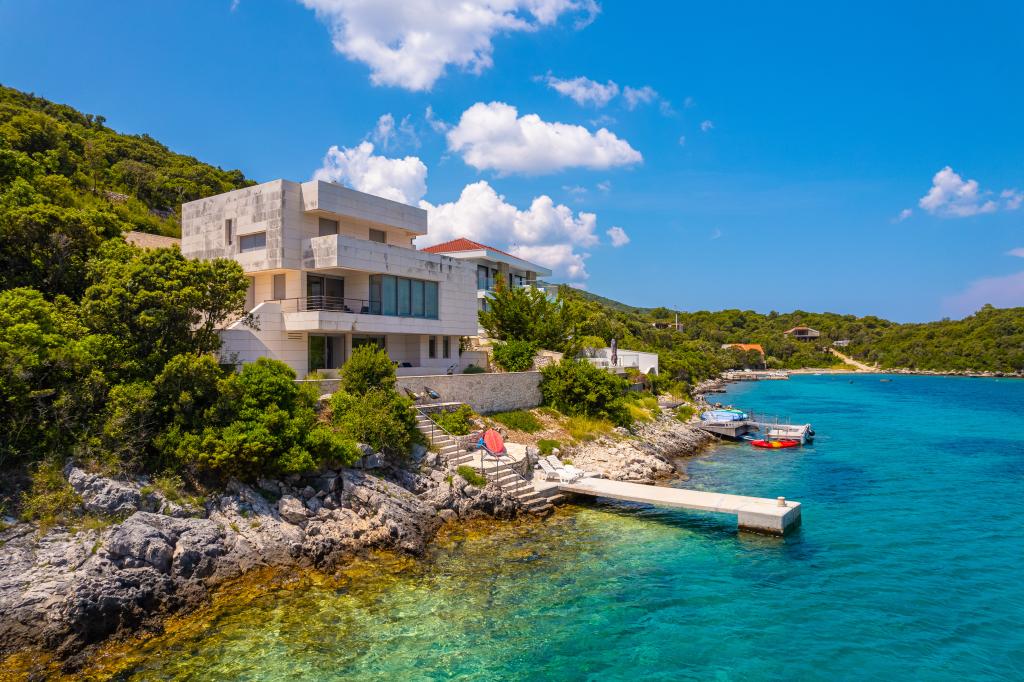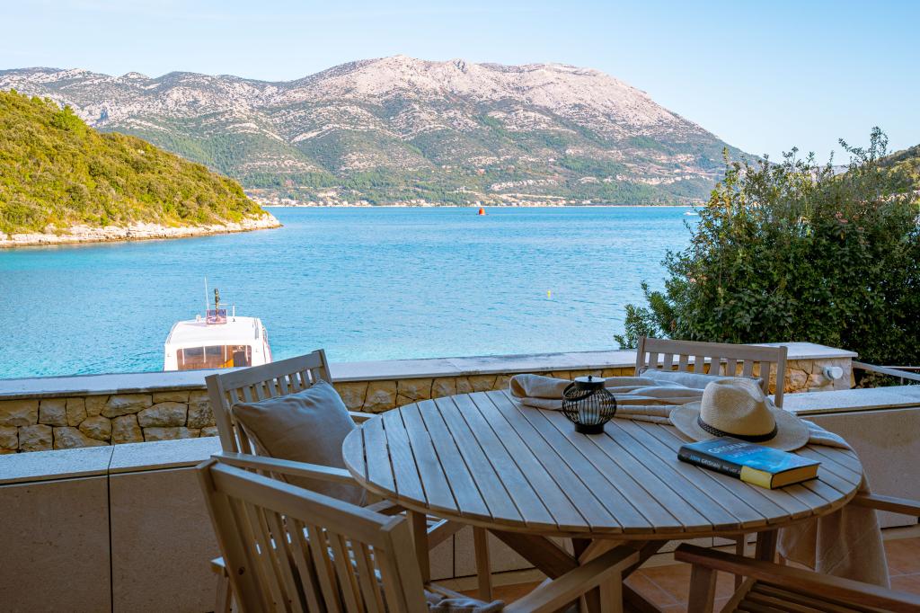 Villa Avantgarde - apartma neposredno ob morju za 4 osebe - zelo miren zaliv - otok Korčula - Hrvaška Je delo znanega hrvaškega in svetovno priznanega arhitekta. Nahaja se v mirnem zalivu, cca. 4 km od centra mesta. V vili vam je na voljo udobno stanovanje velikosti cca. 100 m2, ki je sestavljen iz 2 spalnic, kopalnice in dnevne sobe z dobro opremljeno kuhinjo, jedilnico in dnevno sobo, iz katere je izhod na prostorno teraso z neposrednim dostopom do zasebne plaže. Plaža je od apartmaja oddaljena 9 m. V Vili se oddaja le en apartma. Obkrožajo ga negovane zelenice, zelenje, ptičje petje in morje. Gostom je na voljo zaprto zasebno parkirišče. Spalnica, dnevna soba, jedilnica in terasa gledajo neposredno na morje. Uporablja se lahko skozi celo leto, saj ima centralno ogrevanje.