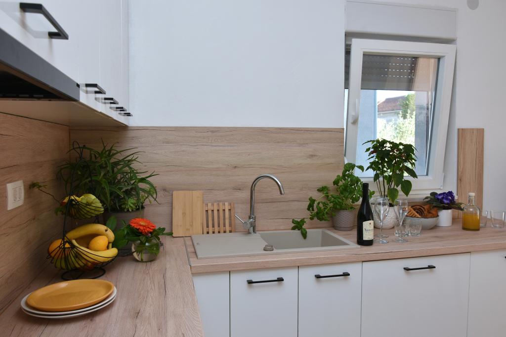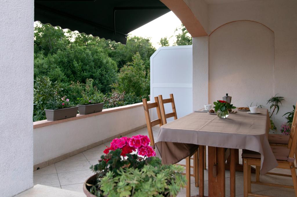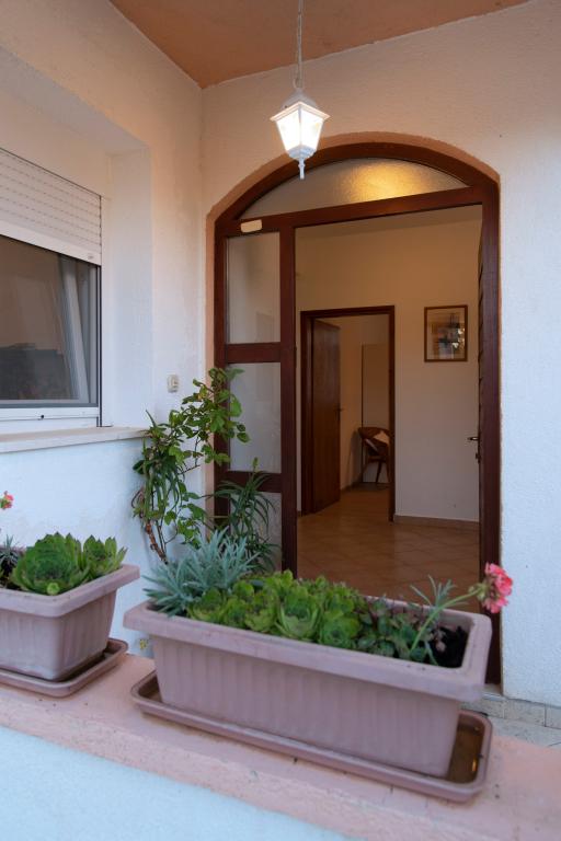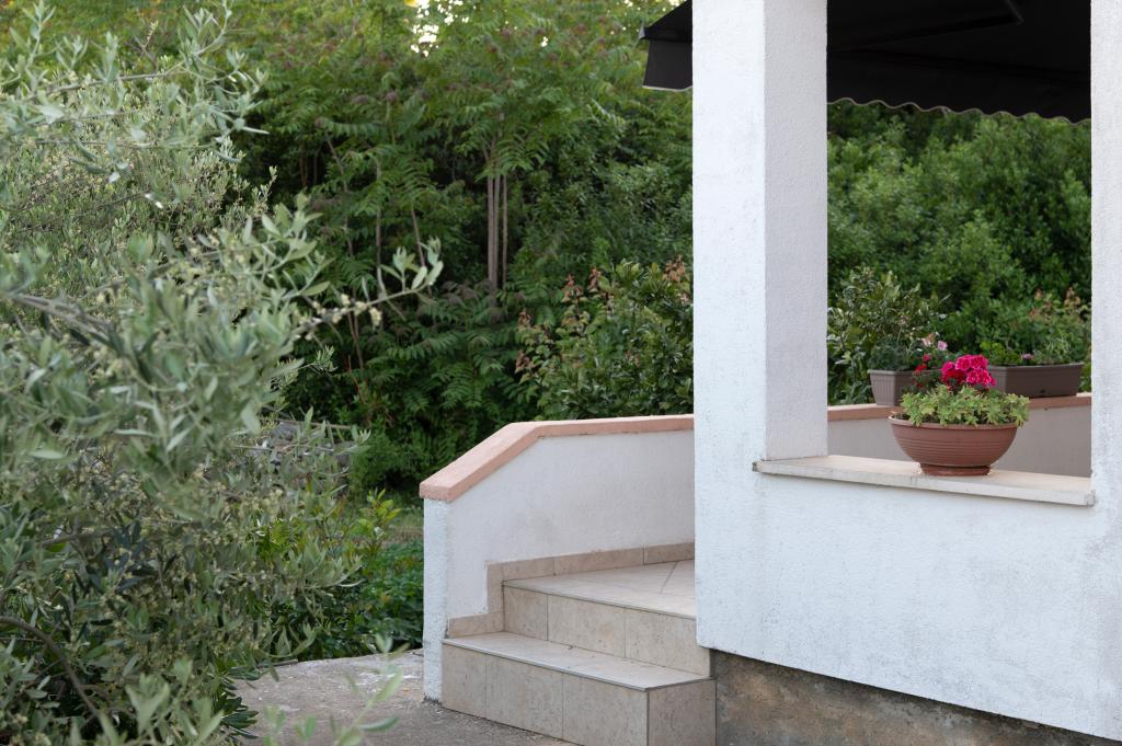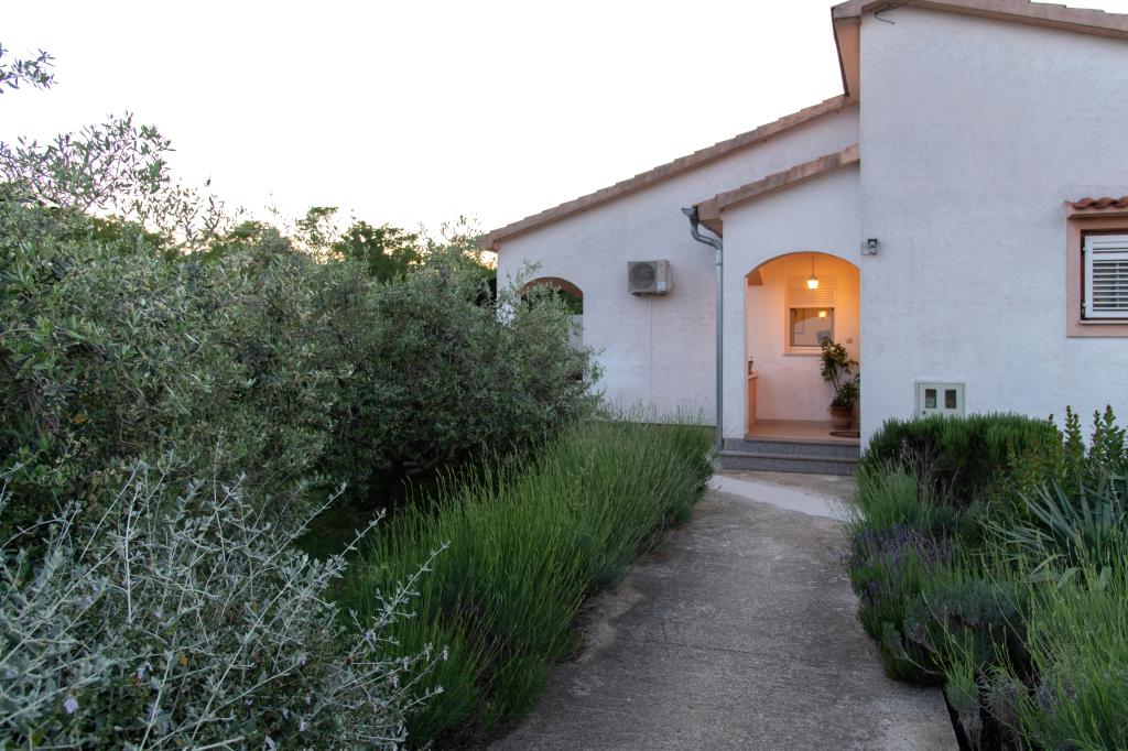 Apartma se nahaja v sklopu družinske hiše, ki je obkrožena z oljkami, cvetjem in žvrgolenjem ptic, saj ima gosta popolno zasebnost, saj pred ali ob hiši ni objektov. Če želite miren kotiček, je to idealen kraj za počitek. V bližini hiše je avtobusna postaja, restavracije, lekarna, igrišče, plaža pa je oddaljena 700 metrov. Do plaže potrebujete 2-3 minute vožnje z avtom in približno 10 minut peš.