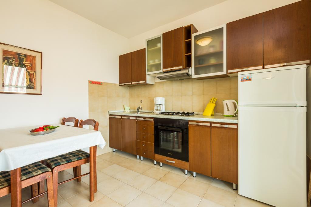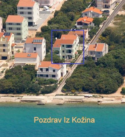 Popolnoma in moderno opremljeni apartmaji v mirnem delu Kozine. Bližina Zadra 7 km. Le 20 se jih je srečalo. do plaže, na voljo senčniki in ležalniki. Vsi apartmaji imajo teraso s pogledom na morje. Apartma A-2+2 in A-4 se nahajata v prvem nadstropju. Apartma A -4+2 se nahaja v pritličju. Vsi apartmaji imajo kuhinjo s štedilnikom, pečico, hladilnikom, zamrzovalnikom, kuhalnikom vode, aparatom. za kavo, toaster, likalnik, posteljnina, brisače, kuhinjske krpe menjava na 7 dni. po potrebi in pogosteje pripomočke za pranje in čiščenje. Apartma za 6 oseb ima pralni stroj, pomivalni stroj. , mikrovalovna pečica, aparat za kavo, opekač kruha in grelnik vode. Lastno parkirišče v senci za vse goste - Mesto na plaži po želji gosta. Avtomobilski promet samo za najemnike in goste ulice. Varno za otroke. V senci dreves je urejen žar s prostorno mizo in klopmi za druženje. Gostom so na voljo senčniki - brezplačno. Brezžični internet je brezplačen. Klima po potrebi. Zaračuna se od 5 - 7 evrov / dan. Zunanji tuš. Vezenine za manjše pogl