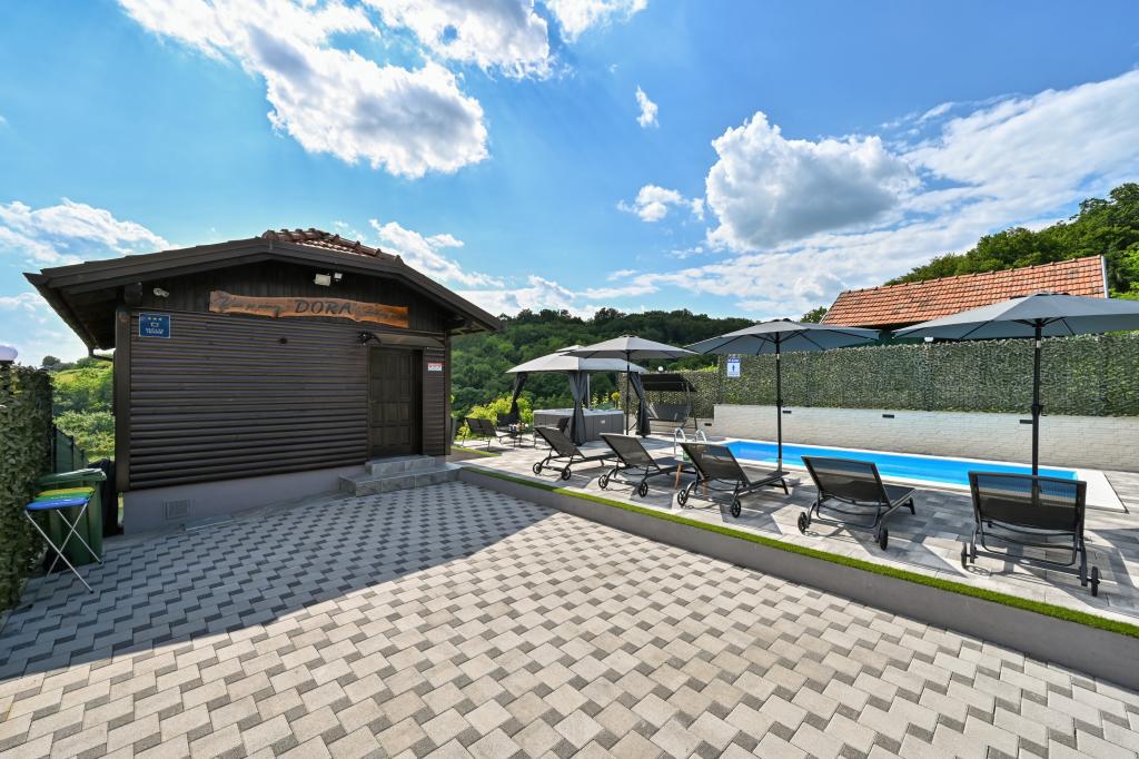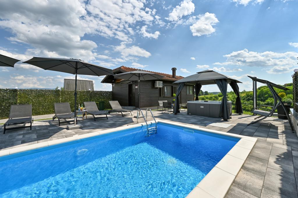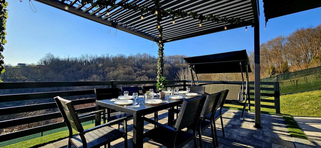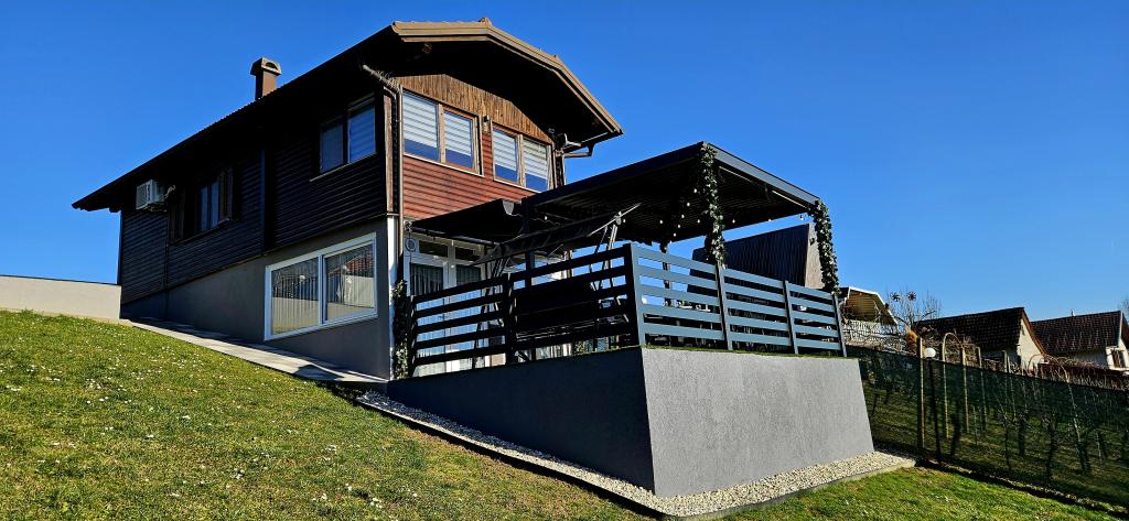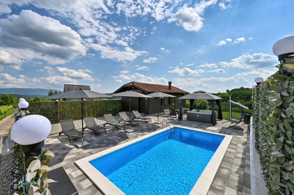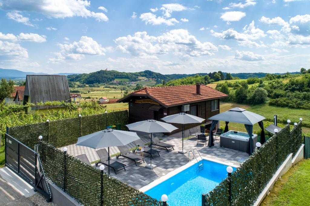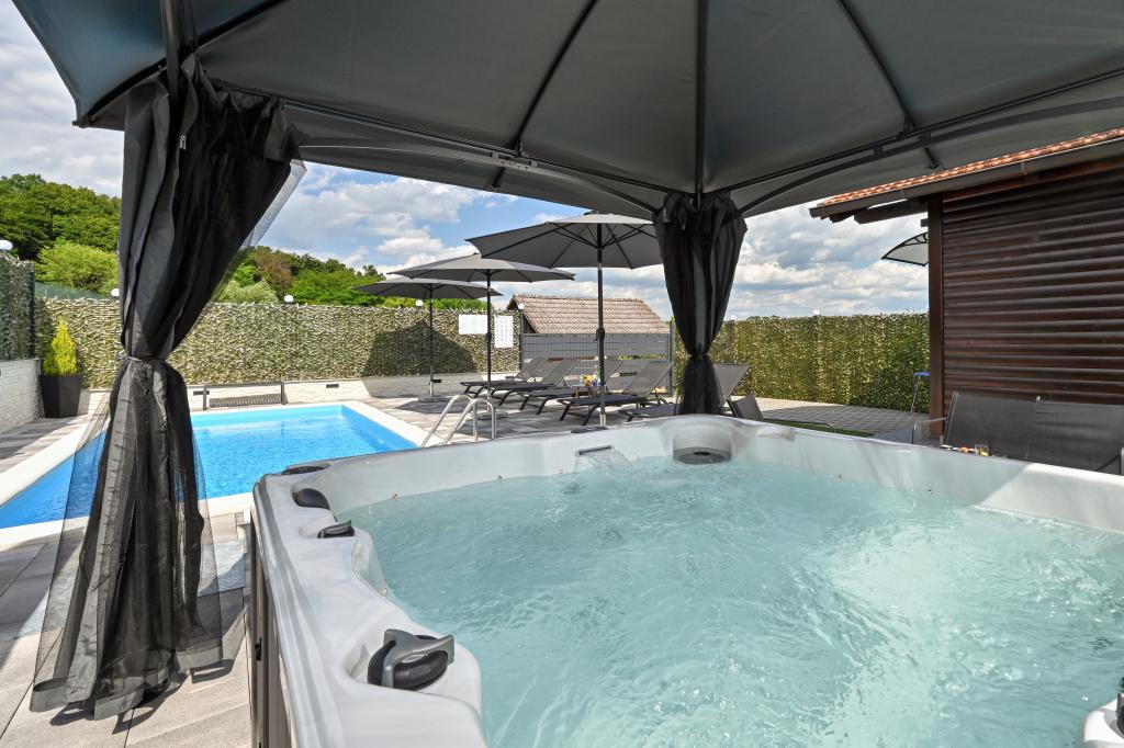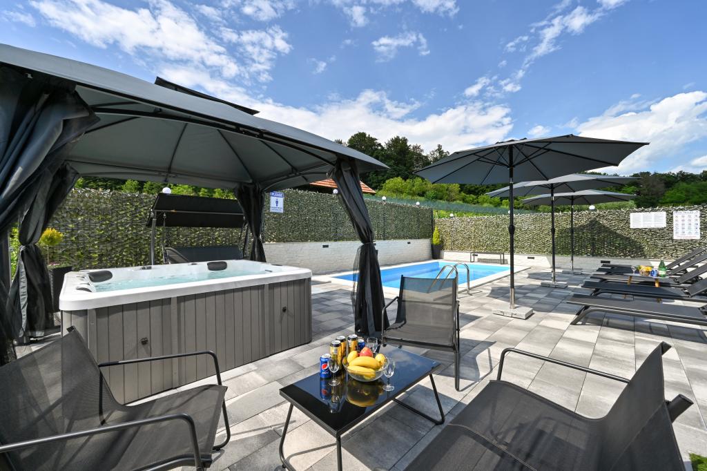 - Počitniška hiša s tremi zvezdicami v mirnem delu hrvaškega Zagorja. - Zasebno parkirišče - Velika terasa: bazen zdaj z avtomatskim doziranjem pH in klora za brezhibno čisto in zdravo vodo, spa/jacuzzi za 5 oseb - Terasa opremljena s 5 ležalniki, vrtna sedežna garnitura, klop, zunanji solarni tuš, senčniki, vrtna gugalnica za 3 osebe - Zgornji del hiše: jedilnica, kuhinja, bar, TV, raztegljiv kavč, hladilnik, pralni stroj, spalnica z zakonsko posteljo s TV, garderobne omare, kopalnica/wc, s čudovitim razgledom - Spodnji del: terasa z lep razgled, miza in stoli za 8 oseb, žar, postelja, omare, spalnica zakonska postelja s TV, - Hiša se nahaja 7 minut od avtoceste A2 Zagreb-Macelj