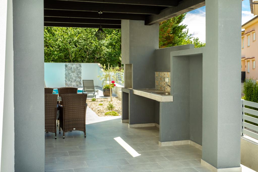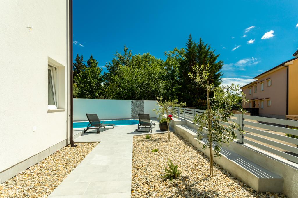 Hiša se nahaja v mirnem mestu Soline, le približno 100 metrov od plaže in približno 15 minut vožnje z avtomobilom do centra Krka. Oddaja se za največ 8 oseb, ker ima 3 spalnice in 2 dnevni sobi, tako da se lahko družine družijo v skupnem večjem dnevnem prostoru ali po želji ločeno. Gostje imajo dostop do celotne hiše, bazena in parkirišča, lastniki pa živijo v ločenem stanovanju z ločenim vhodom, ker je hiša dupleks in ima še en apartma za 4 osebe, ki je prav tako najet, vendar je popolnoma ločen in se ne uporablja. bazen Naš zaliv Soline ponuja različne vrste plaž (betonske, peščene) in zelo znano plažo z zdravilnim blatom, ki jo lahko vsi uporabljajo popolnoma brezplačno. Zdravilno blato je uporabno pri zdravljenju revmatičnih in kožnih bolezni. Ob delu obale se razprostira borov gozd, zato je kraj koristen tudi za astmatike. Pogosto nas obiščejo družine z majhnimi otroki, saj je del obale zelo senčen in zagotavlja zavetje pred direktnim soncem skozi ves dan.