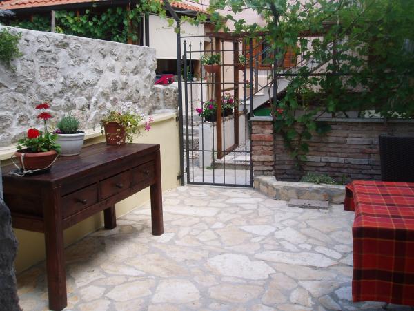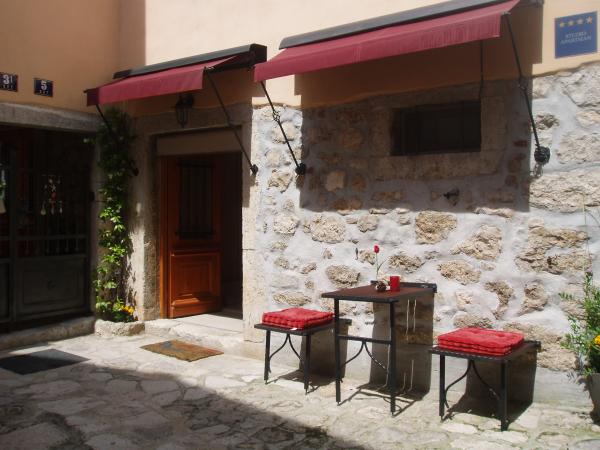Krk center, urbana vila. Apartmaji s 4 zvezdicami, opremljeni v rustikalnem stilu, z moderno opremo, kuhinjo, klimo, TV sprejemnikom. Vila se nahaja v središču starega mestnega jedra in v mirnem delu ulice, le 70 metrov od plaže. Parkiranje v bližini na zasebnem parkirišču.