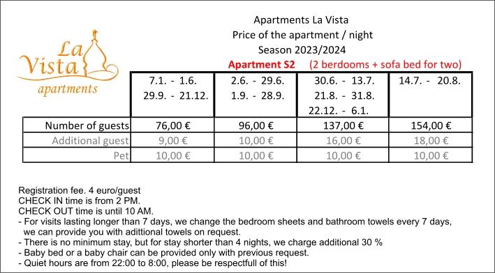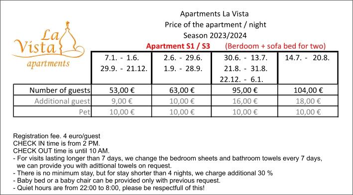 Preberite več Namestitvene enoteZa vsa vprašanja in rezervacije nas kontaktirajte po elektronski pošti. Prijava gosta - 4,00 EUR / osebo. Okoljska taksa - 0,15 EUR oseba/dan, otroci do 12. leta okoljske dajatve ne plačajo. Za goste, ki bivajo krajše od 4 noči, se cena namestitve poveča za 30%. Končno čiščenje apartmaja in turistična taksa sta vključeni v ceno namestitve.