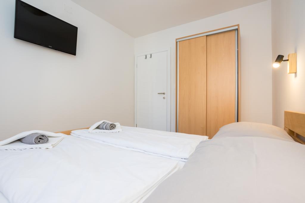 Preberite več Namestitvene enoteVključeno v ceno: Najem in uporaba vseh naprav, poraba elektrike, poraba vode, klimatska naprava, televizija, brezžični internet, končno čiščenje, tedensko menjava vseh perila (listi, prti, brisače, kuhinjske brisače), turistična taksa, eko davek. Vsak apartma ima dodatno ležišče na doplačilo 12,00 evra / dan. Ob potrditvi rezervacije je potrebno plačati akontacijo v višini 20% celotne cene. Čas za vstop v apartma je 14h in čas odhoda je 10h. Turistična taksa je vključena v ceno.