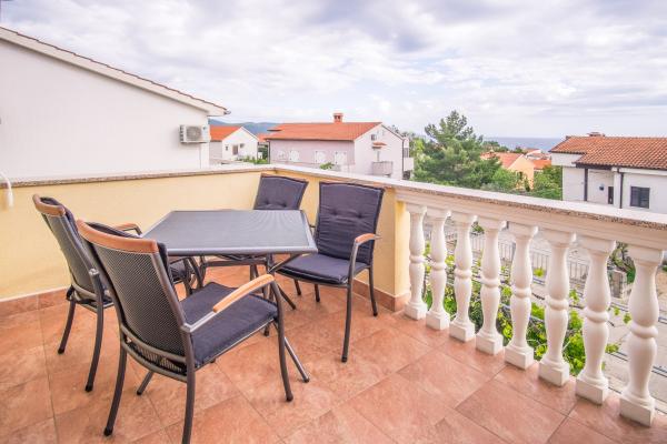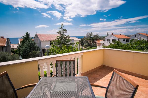 Najemamo 6 apartmajev za 2-6 oseb v mirnem delu mesta Krk, nad hotelom Koralj in le 200 m od plaže borovega gozda. Trije apartmaji so v pritličju in imajo pogled na morje, medtem ko sta dva apartmaja v pritličju. Vsi apartmaji imajo hlajenje in ogrevanje ter imajo lastno parkirišče na dvorišču. Možnost uporabe žara na oglju na dvorišču. Apartma je od središča mesta oddaljen 15 minut vožnje in 400 metrov od trgovine, športnih igrišč in restavracij. V bližini kolesarskih poti Krk - Malinska in Krk - Punat je dolga 20 km.