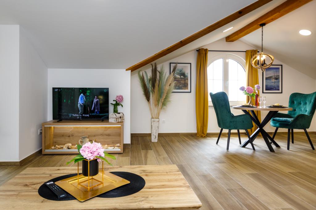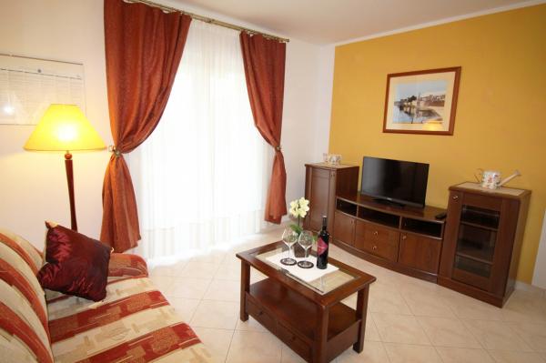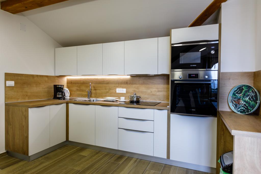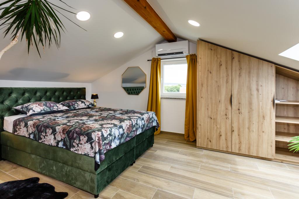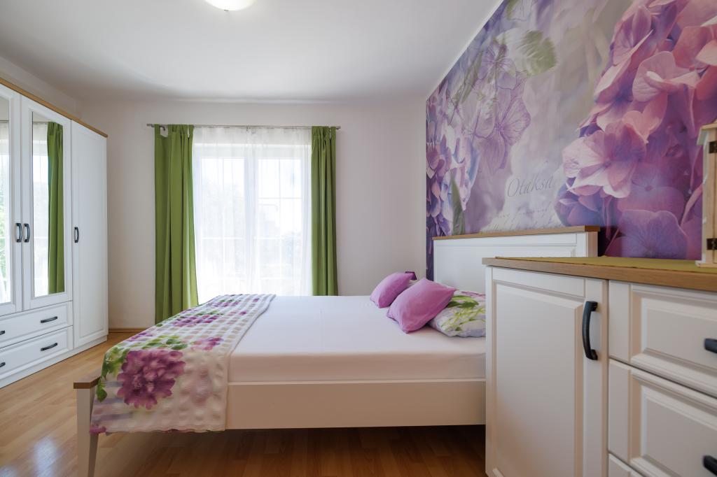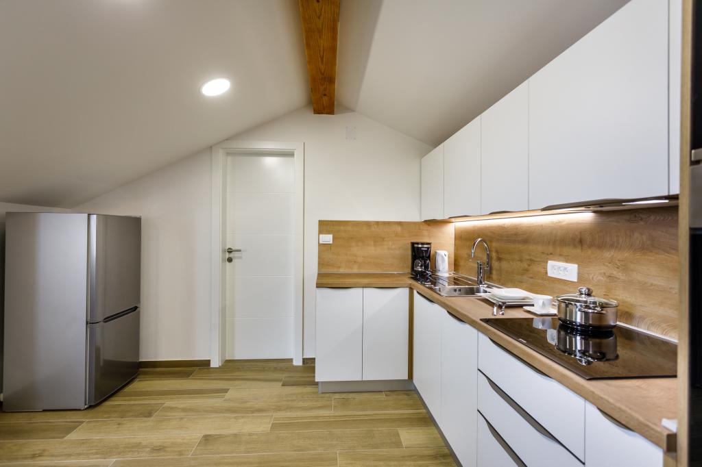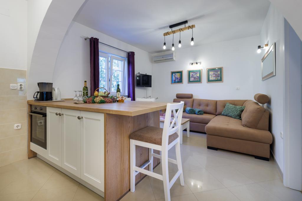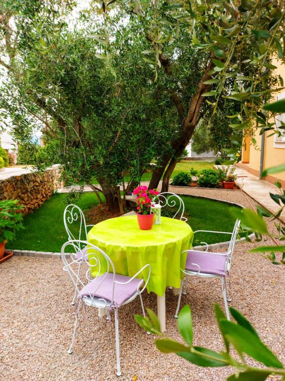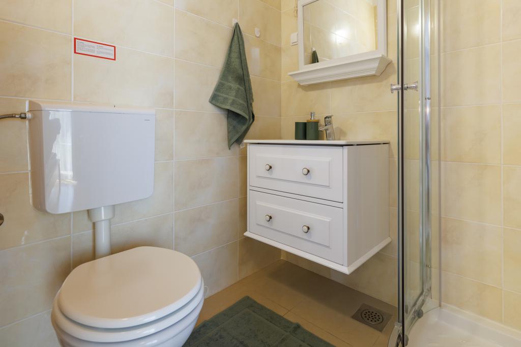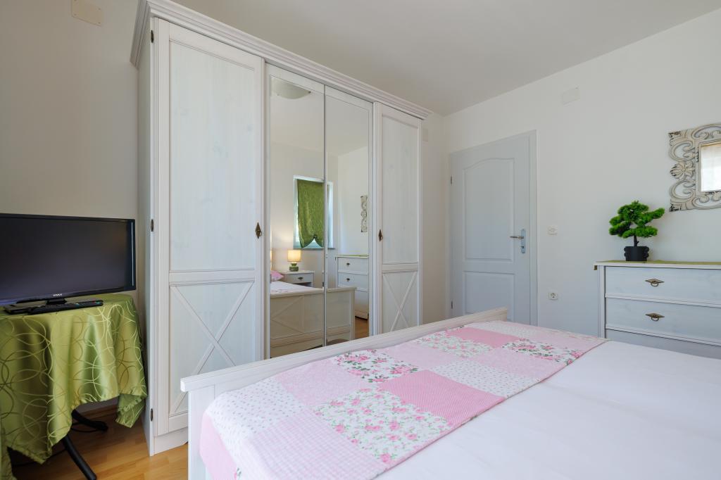 Novi sodobno opremljeni apartmaji v mirnem in privlačen Krke lokaciji s pogledom na morje. Hiša se nahaja 300 m od plaže in 700 metrov od središča mesta. Stavba ima lastno parkirišče in vrt. Apartmaji so dobro opremljeni in udobno bivanje.