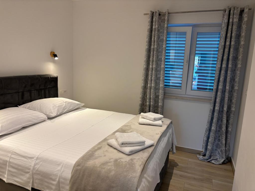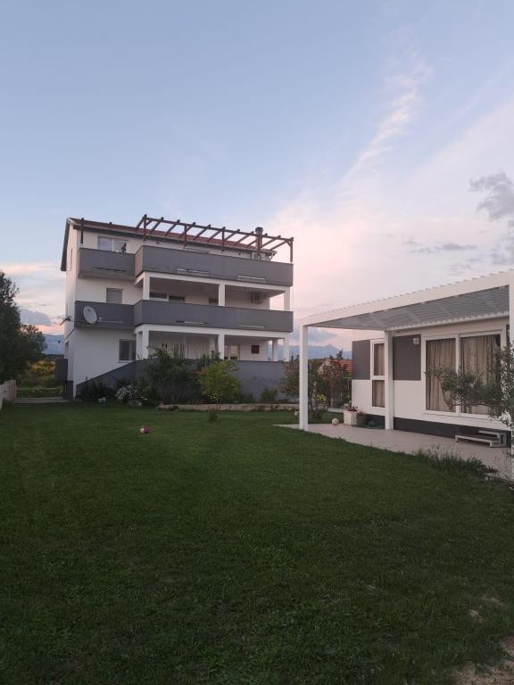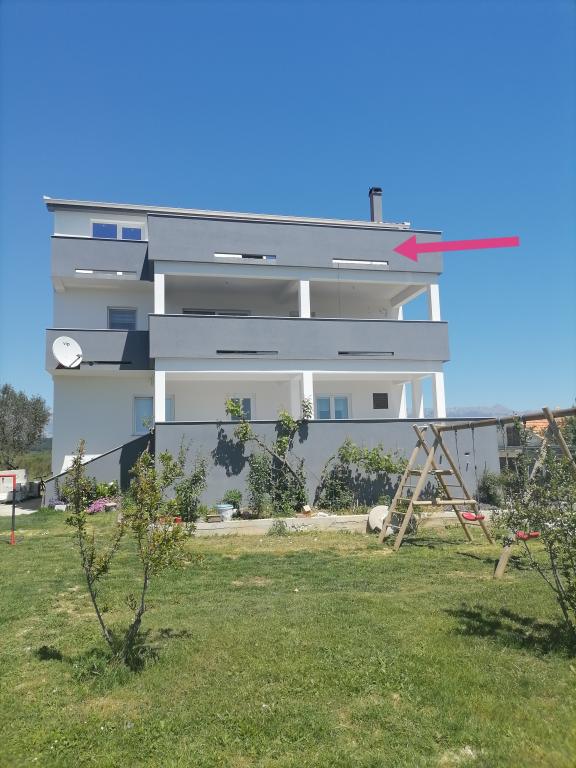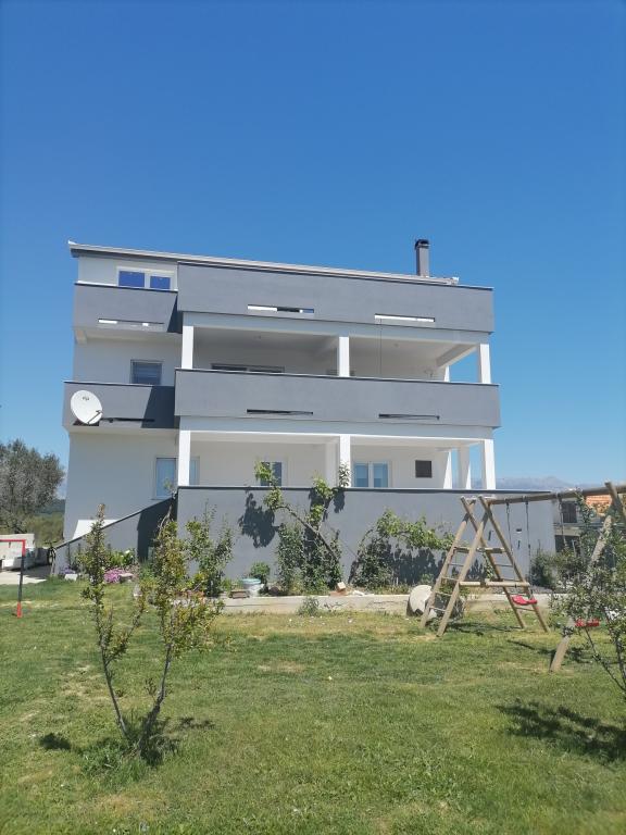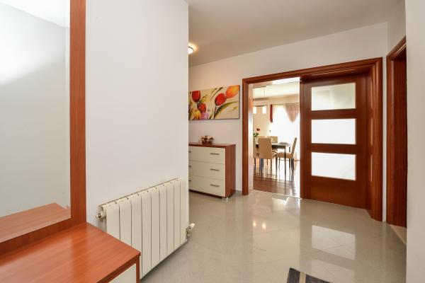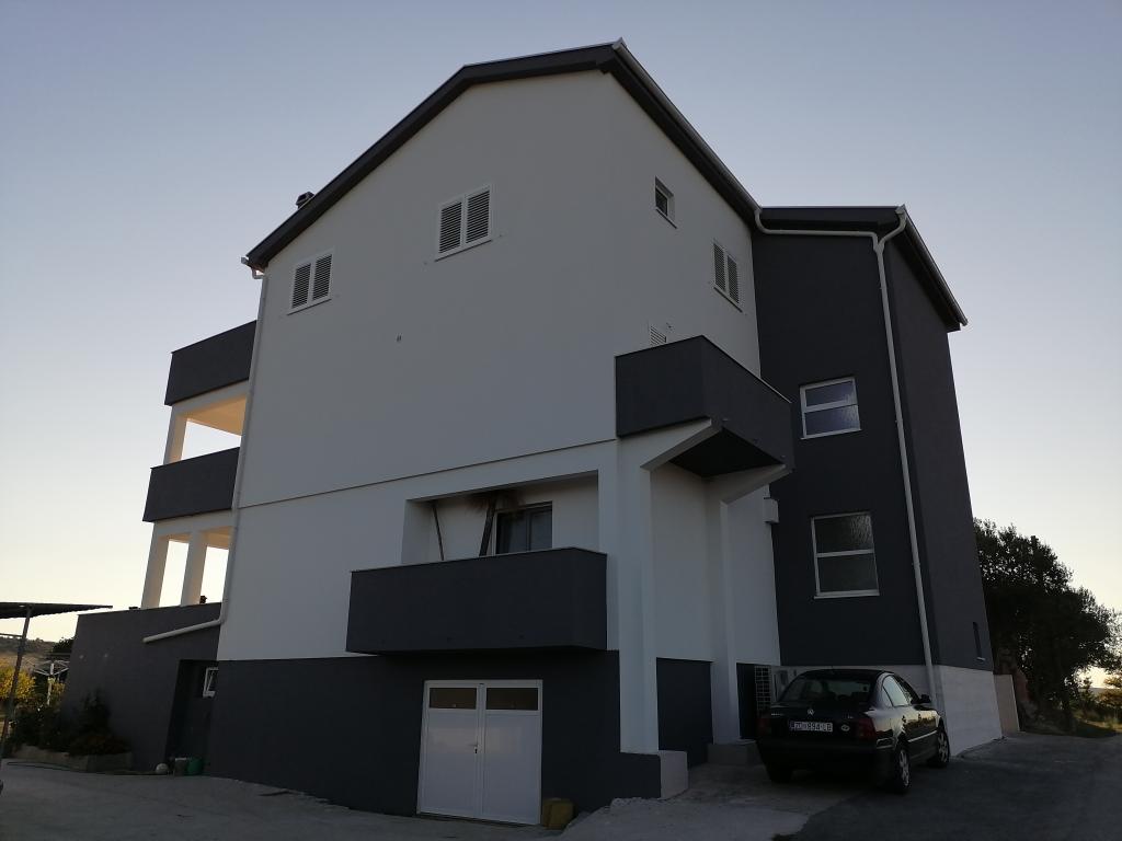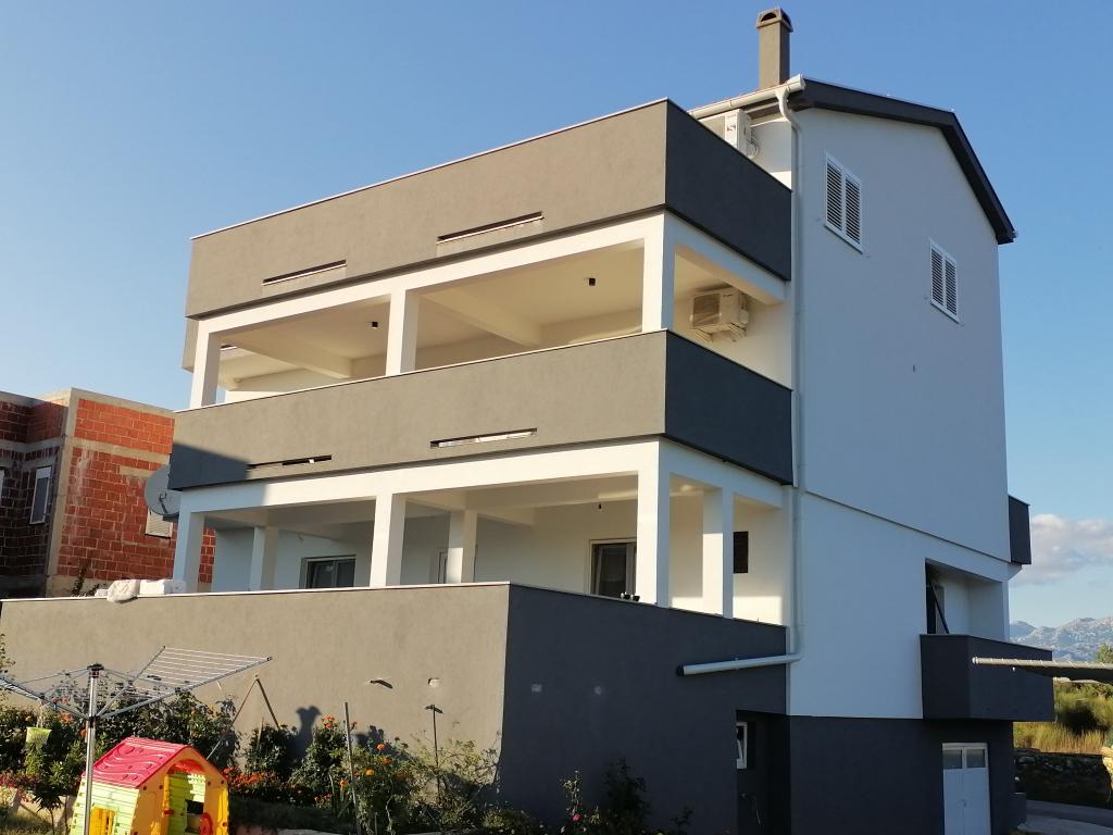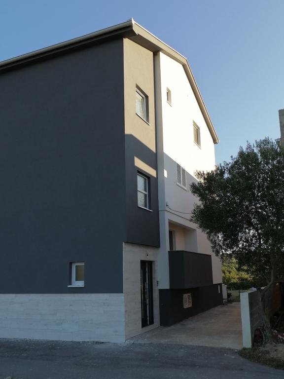 Apartmaja se nahajata v družinski hiši. Oba imata 100 kvadratnih metrov in 30 kvadratnih metrov veliko teraso. Apartma 1 se nahaja v 1. nadstropju hiše. Ima dve sobi in dve dodatni ležišči. Ima dve kopalnici. Apartma 2 se nahaja v drugem nadstropju hiše. Ima 3 sobe in eno dodatno ležišče. Ima 2 kopalnici. Dvorišče je prostorno in primerno za igro (gugalnice, tobogan, goli). Zagotovljeno je senčno parkirno mesto. Plaža je peščena, morje je plitvo in toplo, idealno za družine z majhnimi otroki.