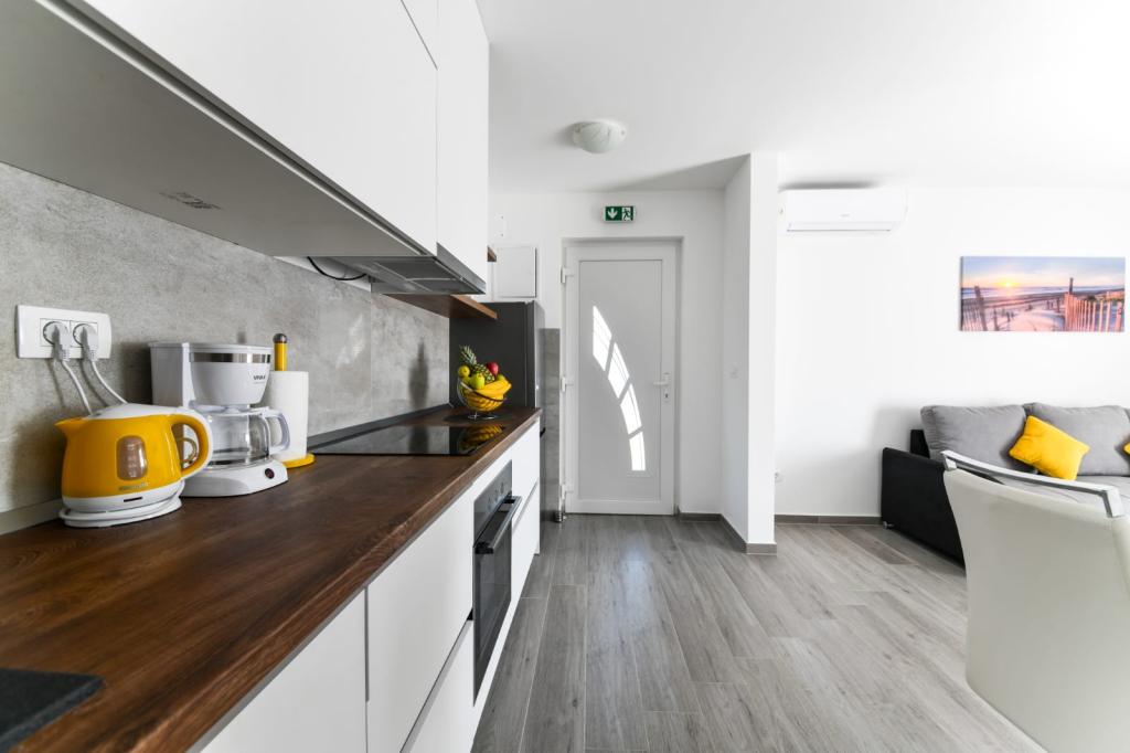 Enosobno stanovanje 2+2, zgrajeno leta 2020. Moderno, popolnoma opremljeno stanovanje v mirnem delu mesta, ki zagotavlja mir in tišino. Od morja je oddaljeno 300 m, od restavracij in kavarn 700 m ter od trgovin 800 m. Na voljo je žar, terasa in balkon s pogledom na morje. Varovano parkirišče. Za otroke sta na voljo premična otroška posteljica in otroški stolček. Z avtomobilom je enostavno dostopno do Narodnega parka Paklenica, otoka Pag, Nina, Vrsija, Zadra, 24 km od letališča Zemunik.