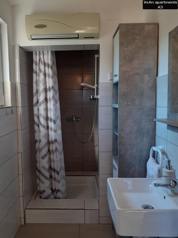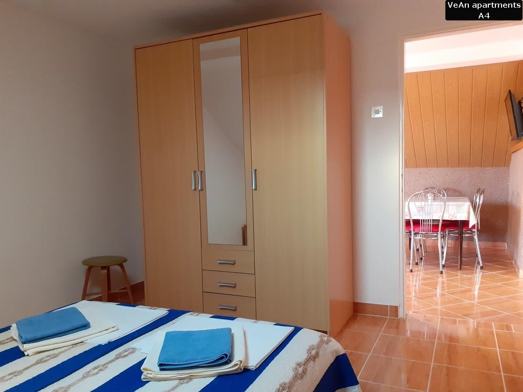 Čakajo vas štirje udobni apartmaji. Apartma A1 (A2+1) je velik 30m2 in je primeren za 2-3 osebe. Velika prednost A1 je, da je vedno kul, saj se nahaja v pritličju (zadaj pod zemljo). Apartma A1 izstopa po svoji edinstvenosti z dvema terasama; ena je nepokrita in ima pogled na morje, druga pokrita pa je možno uživati tudi med dežjem. Apartma A2 (A4+1) je velik 60m2 in je primeren za 4-5 oseb. Velika posebnost A2 je, da ima veliko teraso 20m2, kjer lahko uživate in se sončite na ležalniku, in se nahaja v pritličju, v istem nivoju kot dvorišče. Apartma A3 (A4+1) je velik 60m2 in je primeren za 4-5 oseb. Velika prednost A3 je, da se nahaja v 1. nadstropju in ima lep razgled z velike terase. Vse je lepše z lepim razgledom, tudi branje knjige. Apartma A4 (A4+1) je velik 60m2 in je primeren za 4-5 oseb. Velika prednost A4 je, da se nahaja v 1. nadstropju in ima lep razgled z velike terase. Če zjutraj, preden zapustite spalnico, prva stvar, ki jo radi naredite, pokukate ven in pogledate sonce z majhnega balkona, potem je to pravo stanovanje za vas, saj ima ena spalnica majhen balkon.