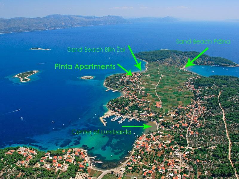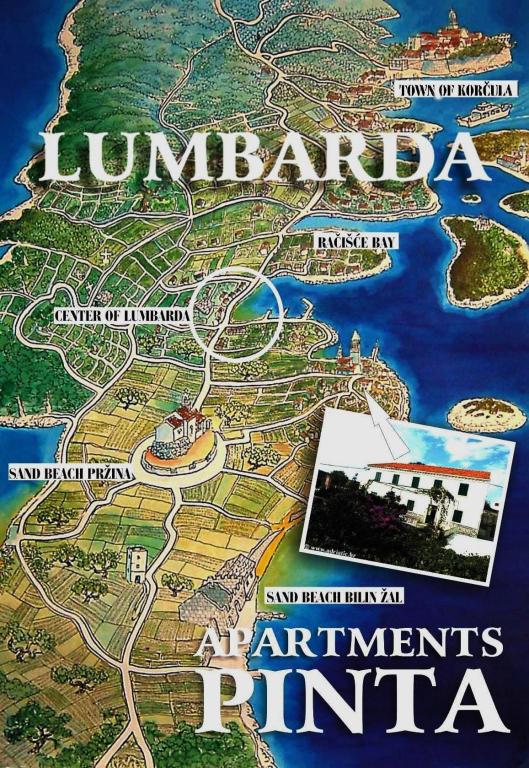 Apartmaji Pinta se nahajajo v starem in mirnem delu mesteca Lumbarda na otoku Korčula. Od peščenih plaž Bilin žal in Pržina so oddaljeni 5-10 minut hoje, od centra Lumbarde pa 10 minut. Naša družina ima dolgo tradicijo osrečevanja popotnikov. Leta 1928 so naši predniki odprli prvi penzion v Lumbardi pod imenom PINTA. V osemdesetih letih prejšnjega stoletja je bila hiša preurejena v stanovanja, leta 2012 pa je bila hiša popolnoma prenovljena, s čimer se je pokazala lepota stare stavbe. Razpoložljive kapacitete in velike terase s svojo povezanostjo v eno hišo predstavljajo možnost skupnega preživljanja večjih skupin gostov, ki imajo hkrati v vsakem apartmaju svoje udobje. Na voljo so vam: Apartmaji za dve osebi - nahajajo se v prvem nadstropju (z veliko teraso), Apartma za pet - pritličje in prvo nadstropje hiše (terasa in balkon); Apartma za štiri - v prvem nadstropju z lastnim velikim balkonom.