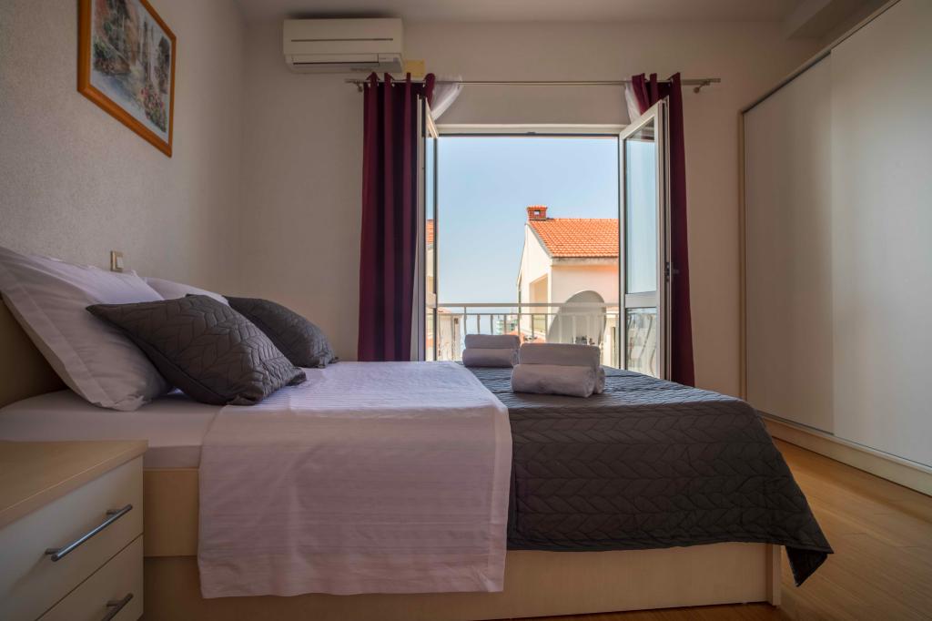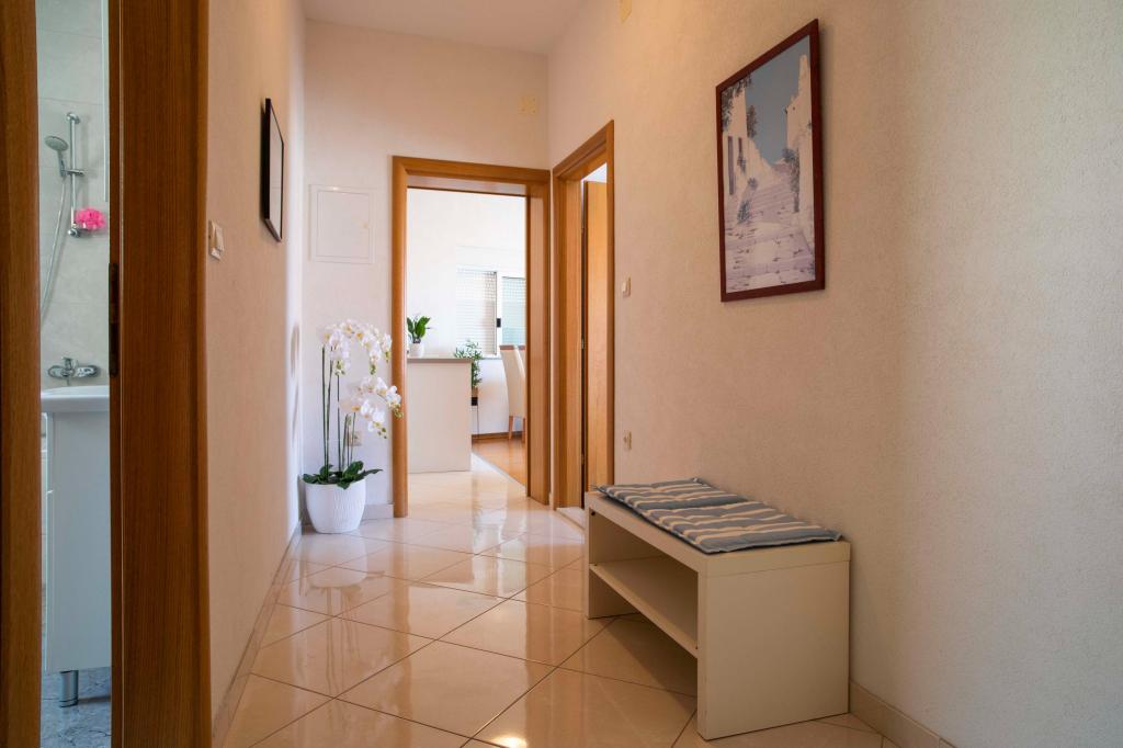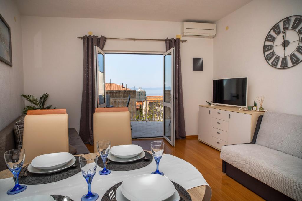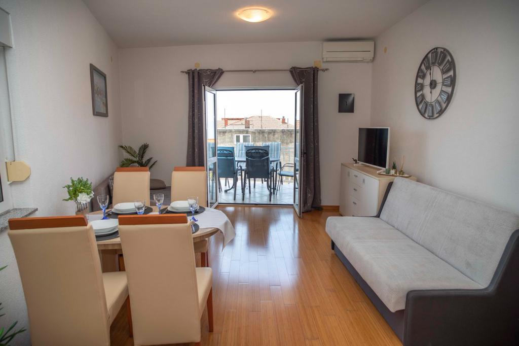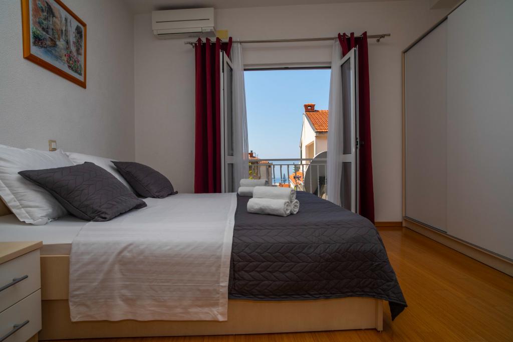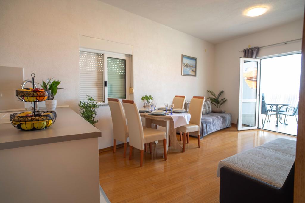 Dobrodošli v apartmaju "Ivana" s pogledom na morje in garažo. Idealno za 2 odrasla in 4 otroke. Sestavljen je iz spalnice, kopalnice, dnevne sobe z 2 raztegljivima kavčema in popolnoma opremljene kuhinje. V dnevni sobi in spalnici sta klimatski napravi.