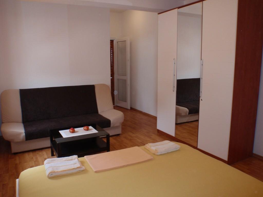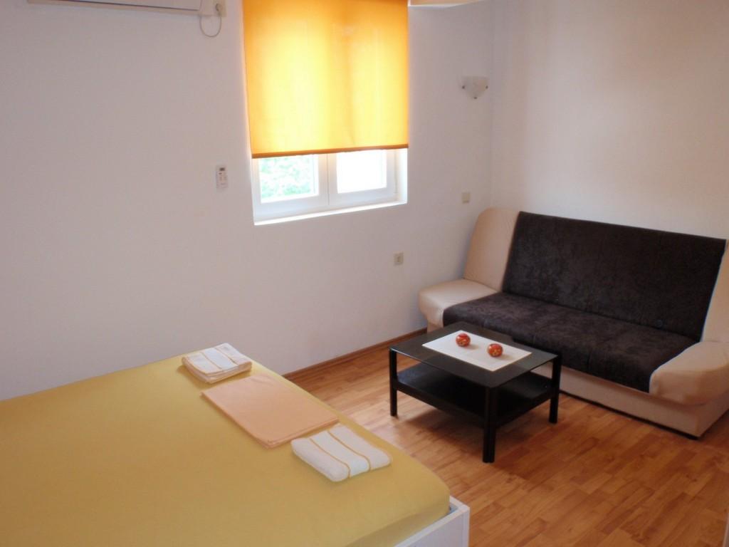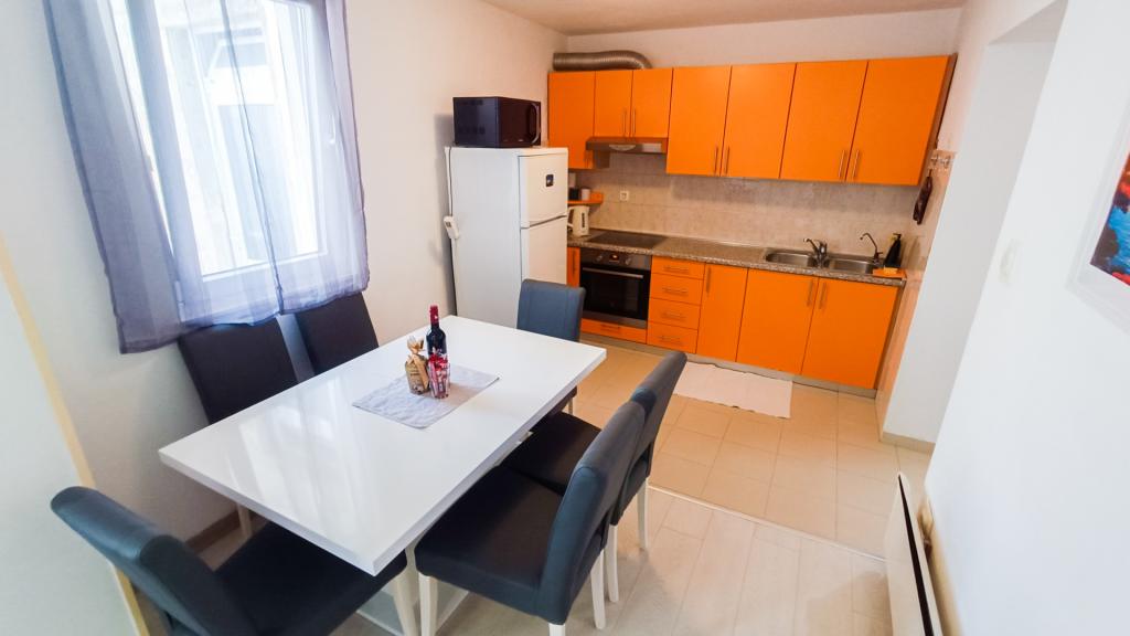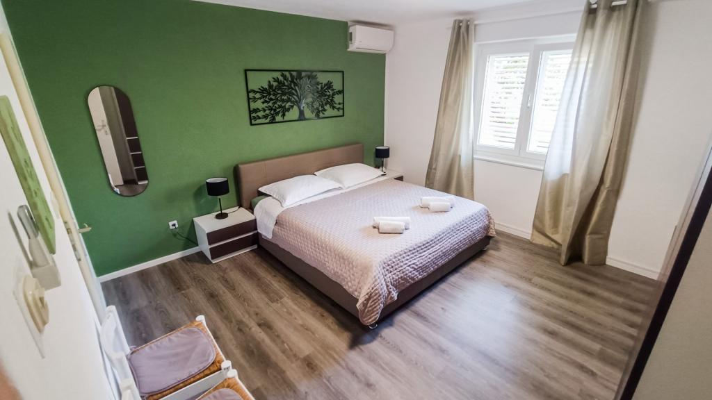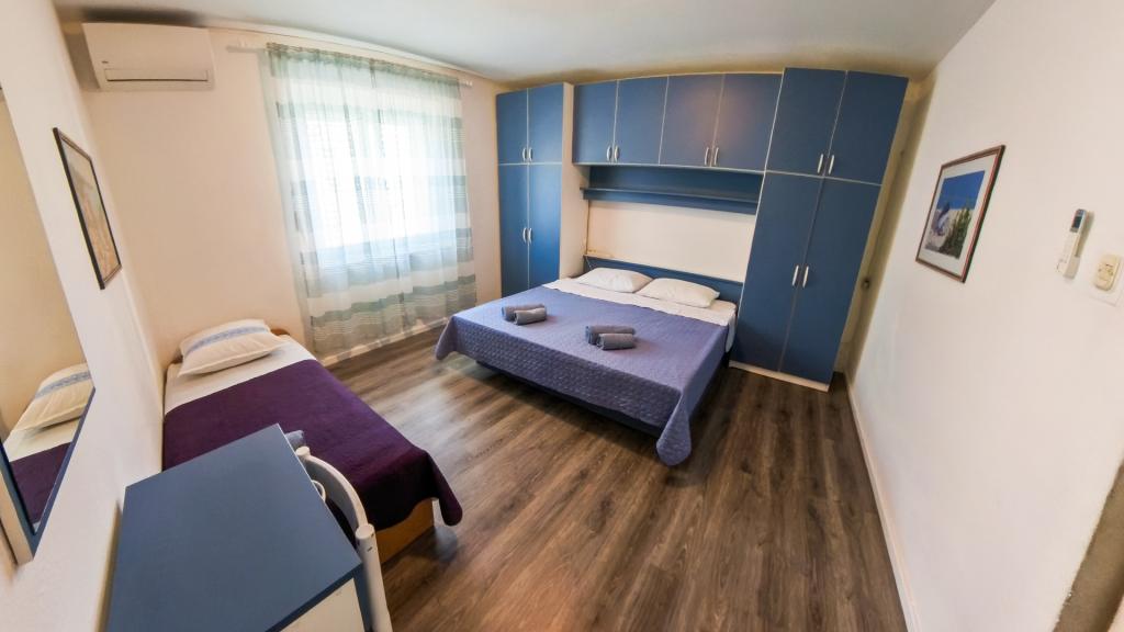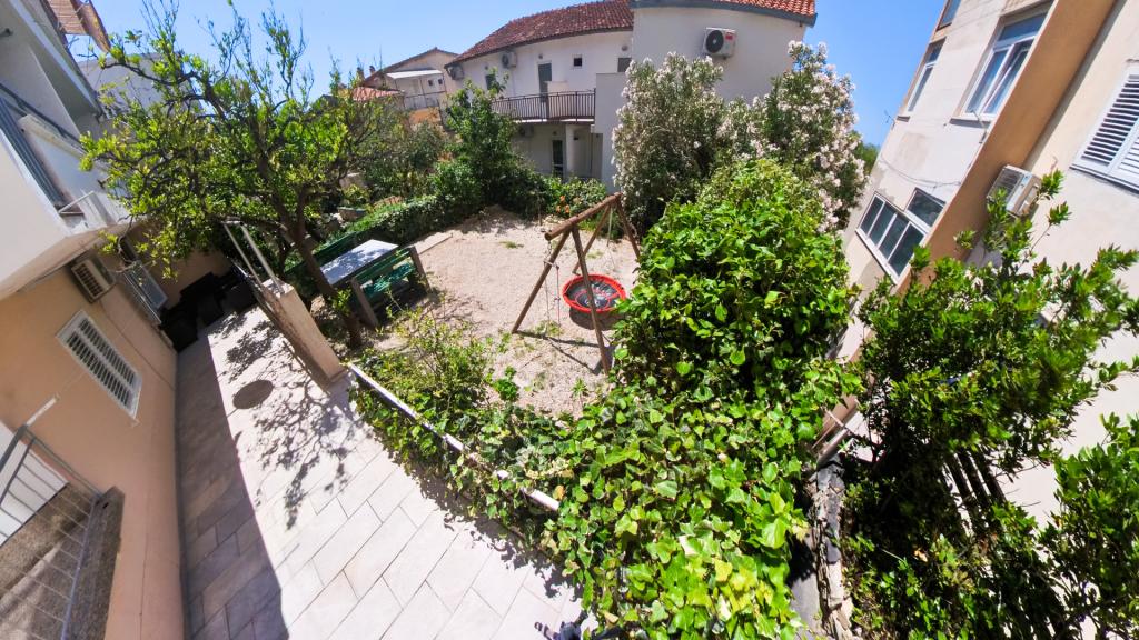 Apartma 5+4 je idealen za družine z otroki. Ima dve spalnici (ena za 2 in ena za 3 osebe), dva raztegljiva kavča v dnevni sobi, 3 kopalnice, kuhinjo in veliko dvorišče s sedeži, žarom in otroškim igriščem. Manjši apartmaji in sobe v objektu so primerni za 2 do 3 osebe. Objekt je od plaže oddaljen do 5 minut hoje in 10 minut do centra.