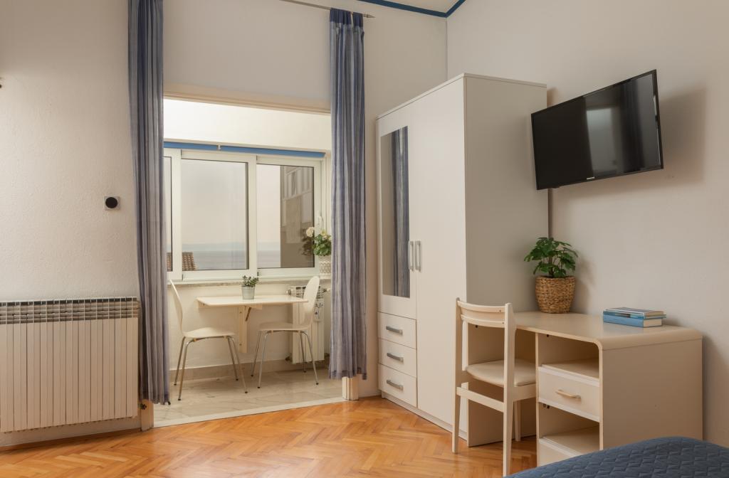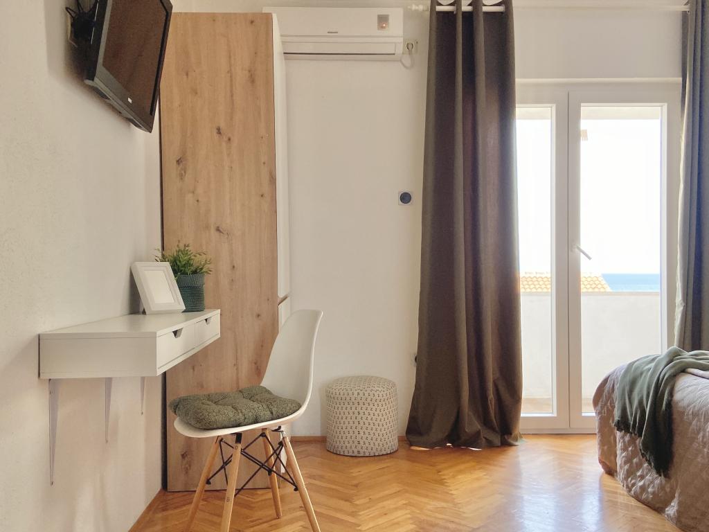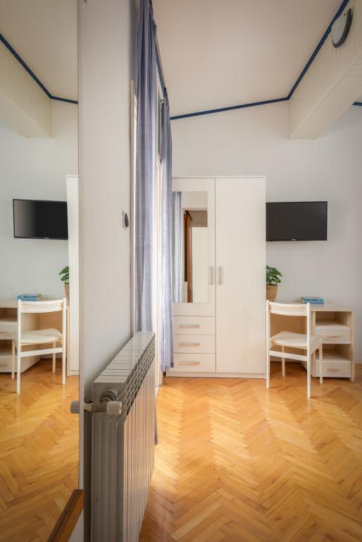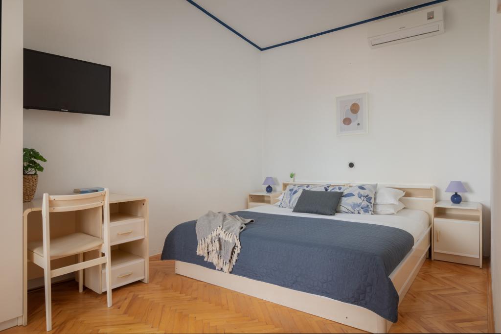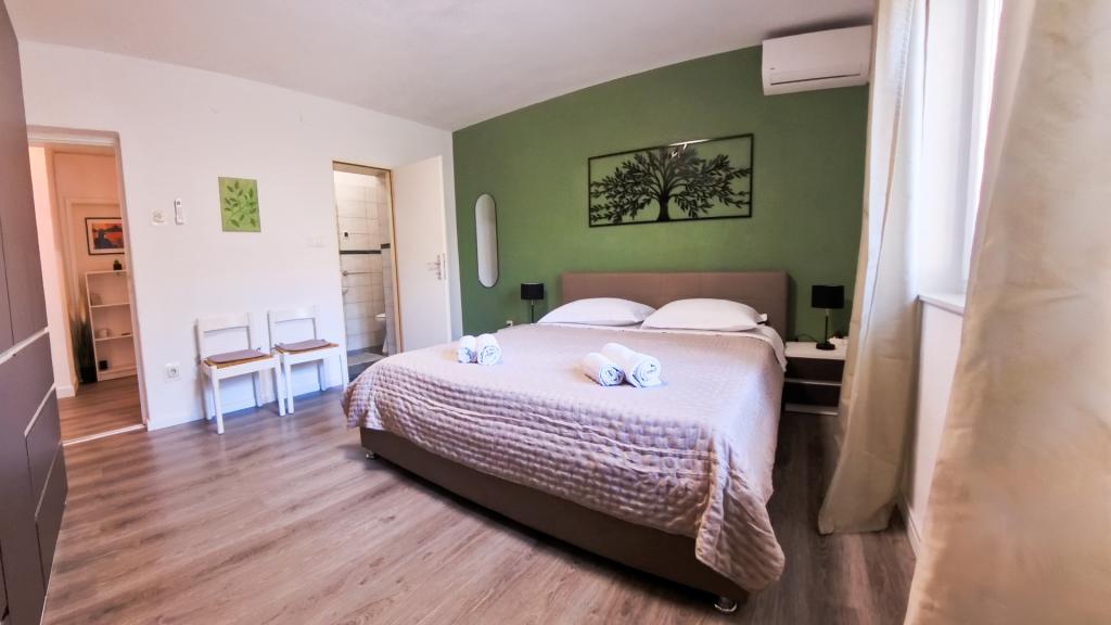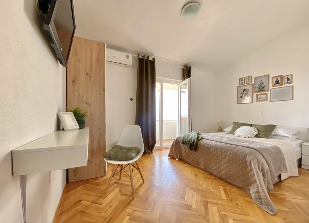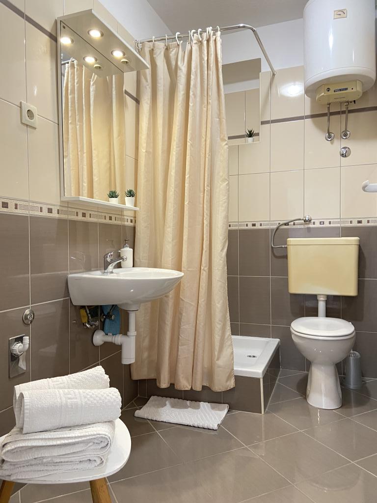 Apartma 5+4 je idealen za družine z otroki. Ima dve spalnici (ena za 2 in ena za 3 osebe), dva raztegljiva kavča v dnevni sobi, 3 kopalnice, kuhinjo in veliko dvorišče s sedeži, žarom in otroškim igriščem. Manjši apartmaji in sobe v objektu so primerni za 2 do 3 osebe. Objekt je od plaže oddaljen do 5 minut hoje in 10 minut do centra.