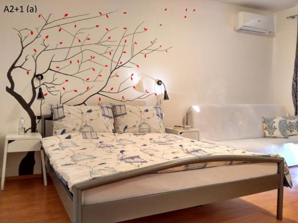 Čudoviti prostorni apartmaji se nahajajo v 2 nadstropjih hiše, obdane z avtohtonimi rastlinami in odmaknjene od ceste z vrtom. Pogled na morje in otoke na eni strani ter Biokovo na drugi vam zagotavlja nepozabno doživetje. Le 5 minut hoje od plaže in 15 minut hoje od centra vam bodo apartmaji Kruno ponudili potreben počitek za raziskovanje mesta Makarska in njegove okolice. Uživajte v miru ob jutranji kavici na terasi z brezplačnim Wi-Fi-jem ali pa se družite ob žaru, ki je gostom na voljo... Objekt je prijazen hišnim ljubljenčkom, parkirišče pa je na voljo na zahtevo.