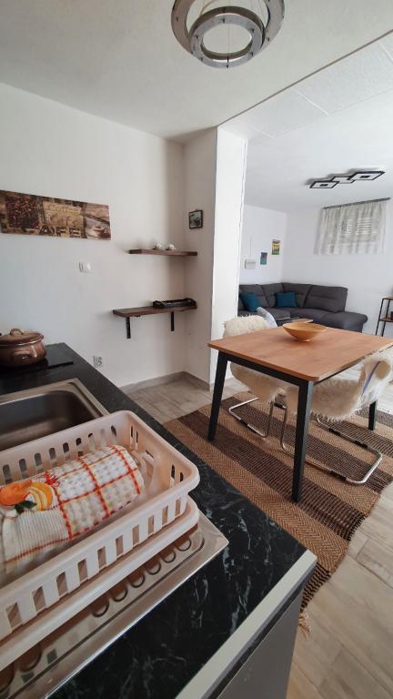 Ko se podjetje razvija skozi generacije in veste, kako je bilo zgrajeno, je tisto, kar dobite, zagotovo kakovostno. Tukaj boste zagotovo preživeli počitnice, kot ste si jih zamislili. Občutek doma, a opran z jutranjo svežino Biokova in sončen do poznega popoldneva. Miru, tišine in zasebnosti ne bo zmotil niti vsakodnevni obisk krotke in zveste psičke Tonke. Ko se vrneš domov, jo boš tudi ti pogrešal. Sodobno opremljena namestitev v vsakem delu ohranja zgodbo iz preteklih časov, ki jo pripoveduje Majina ročna dela in umetnost. V našem apartmaju smo imeli 100% udobje z dvema kopalnicama, dvema sobama, dvema terasama. V času bivanja imate možnost menjave posteljnine in brisač, po želji pa je na voljo tudi pralni stroj za vaše stvari. Za tiste, ki tukaj pripravljajo hrano, so na voljo mikrovalovne pečice ter plinski in električni štedilniki, tako da so obroki hitro pripravljeni. Parkiranje na dvorišču je udobje za vse, ki prihajajo z avtomobilom. Vse, kar potrebujete, je dovolj blizu, a tudi dovolj daleč, da ohranite svoj mir in užitek. Čeprav živijo v isti hiši, bodo gostitelji prisotni le toliko, kolikor boste potrebovali. Človek se ne zasidra povsod ... in mi smo dobili sidro kot darilo dobrodošlice ... za naša nova srečanja, pa tudi za vas, draga bralka. PS Hvala za nesebično deljenje časa z nami in odlične šale. Hvala za vse krofe! Velik objem od nas, predvsem pa Kosta in Filip!!