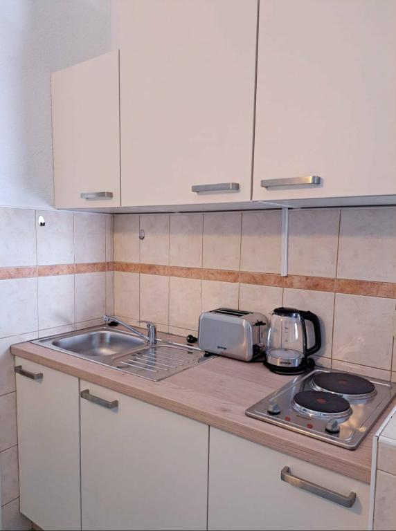 Ponujamo več apartmajev in studio apartmajev. Apartmaji in studio apartmaji so dvoposteljni, troposteljni in štiriposteljni. Vsak apartma in studio apartma ima klimatsko napravo, balkon, popolnoma opremljeno kuhinjo, kopalnico, TV in Wi-Fi. Cene se začnejo od 35 € na osebo in so odvisne od izbranega apartmaja. Prednost: bližina najlepših plaž na Makarski rivieri, brez vstopa v mestno gnečo. Vse najlepše plaže se nahajajo tik pod nami in do njih ne potrebujete niti 2 minuti vožnje z avtomobilom. Nahajamo se približno 1 km od prve in ene najlepših plaž v Makarski. Vožnja z avtomobilom traja približno 2 minuti. Pod nami se nahajajo nekatere najčistejše in najlepše plaže v Makarski. Plaže v bližini: plaža Buba, plaža Biloševac ️ Plaža Cubano ️ Plaža Cvitačka ️ Od prve trgovine, mesnice in kavarne smo oddaljeni približno 300 m, od prve restavracije pa 100 m. Gostom je na voljo brezplačno parkiranje tik pred hišo.