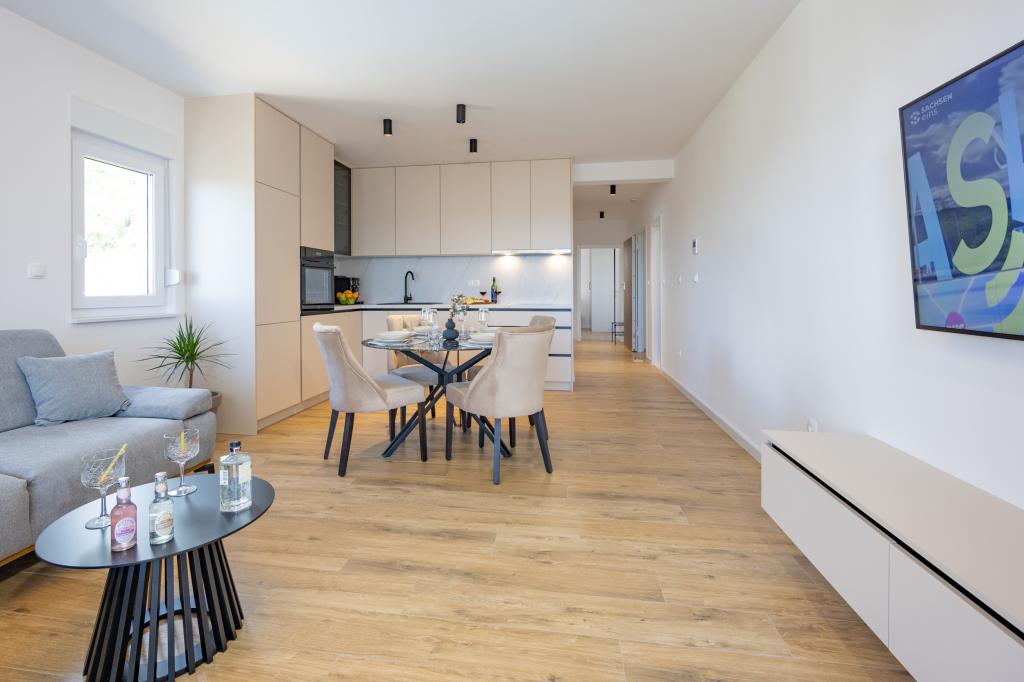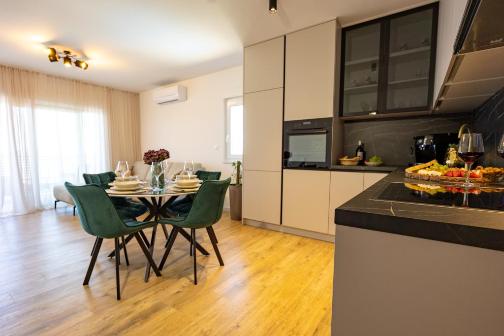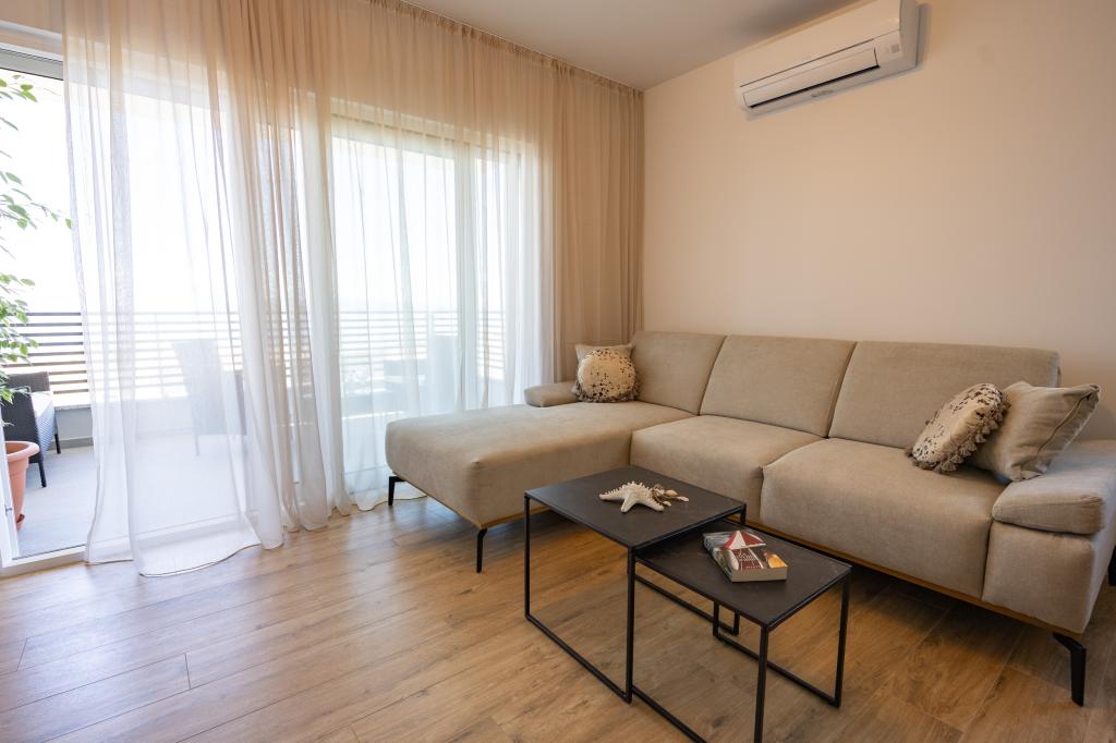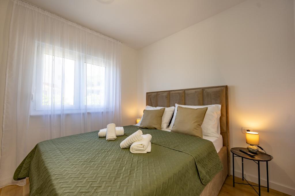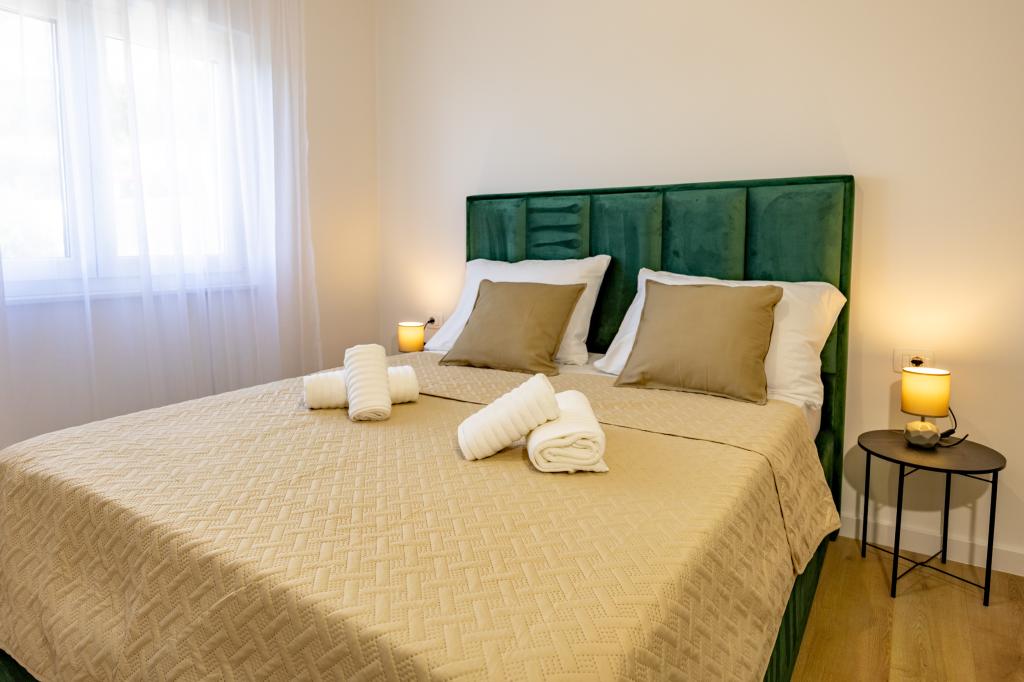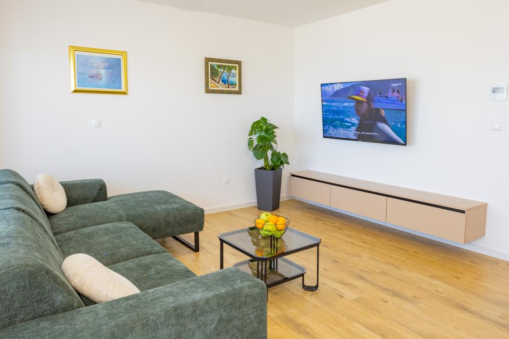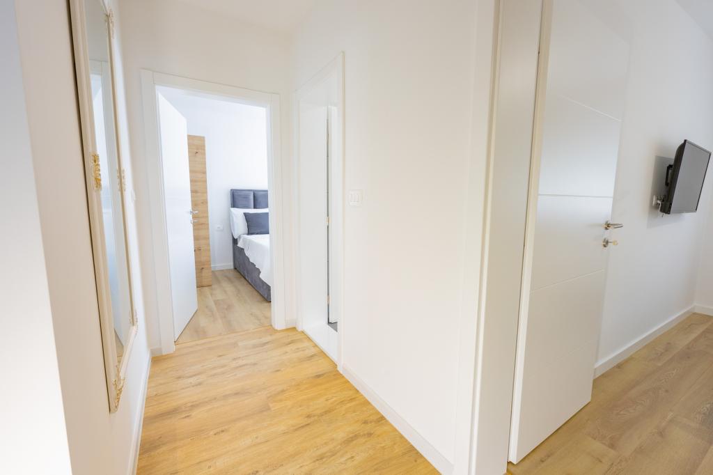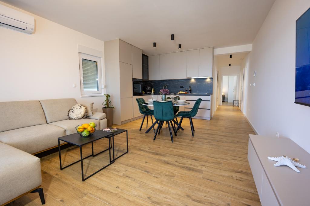Vsak apartma izžareva sodoben dizajn in prenovljeno notranjost. V prostorni dnevni sobi, okrašeni z okusnim pohištvom in sodobnimi detajli, se boste počutili kot doma. Odprt koncept naravno povezuje dnevno sobo s popolnoma opremljeno kuhinjo, kjer vas čakajo elegantni pulti, kakovostni aparati in ves prostor, ki ga potrebujete za pripravo svojih najljubših obrokov. Dnevni prostor se odpira na prijeten balkon - idealen kraj za jutranjo kavo ali večerno sprostitev ob kozarcu vina in nepozabnem sončnem zahodu nad Jadranom. Vsak apartma ima dve udobni spalnici z zakonskimi posteljami, opremljeni z mehko posteljnino in veliko prostora za shranjevanje, eno moderno kopalnico in dodatno stranišče. Apartmaji so klimatizirani in popolnoma opremljeni: TV/SAT, internet, pralni stroj, pomivalni stroj, aparat za kavo in vse, kar potrebujete za udobno in brezskrbno bivanje. Brezplačno parkiranje v bližini plaže je vključeno v ceno najema!