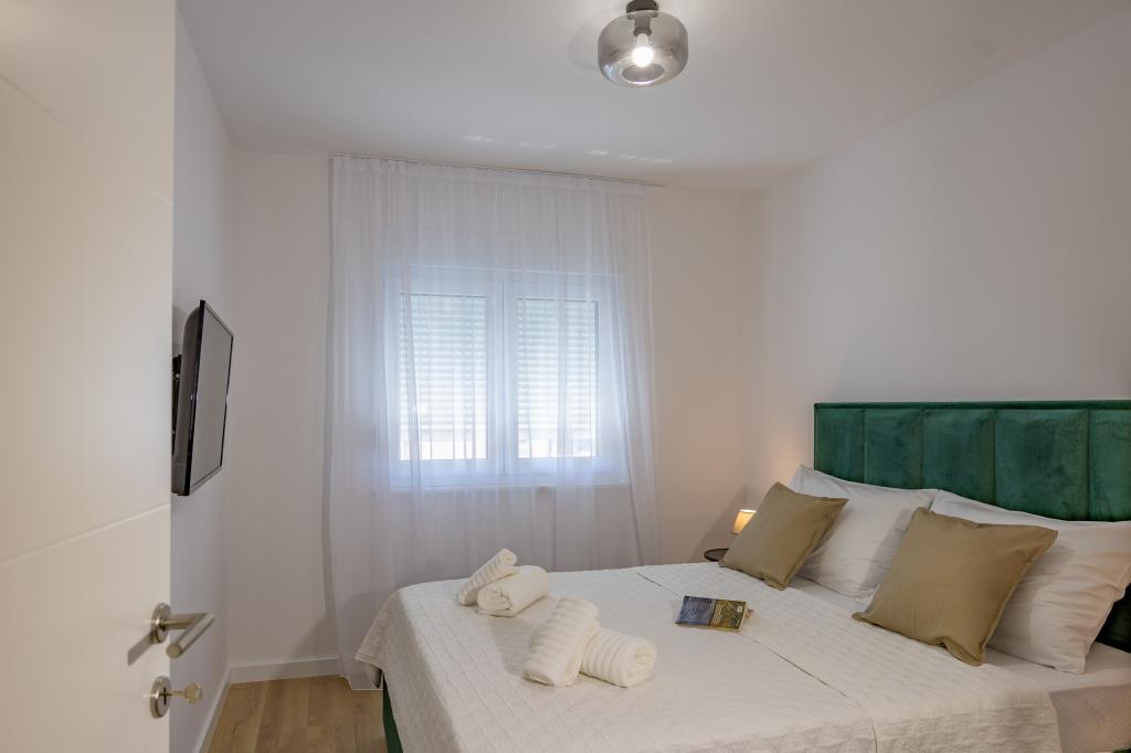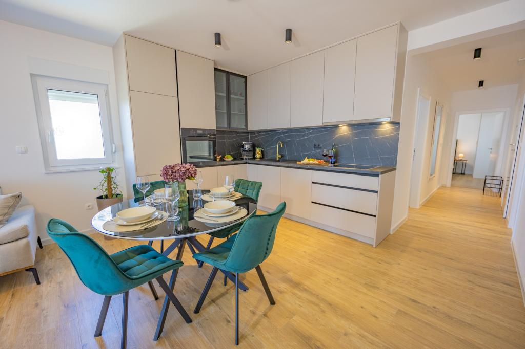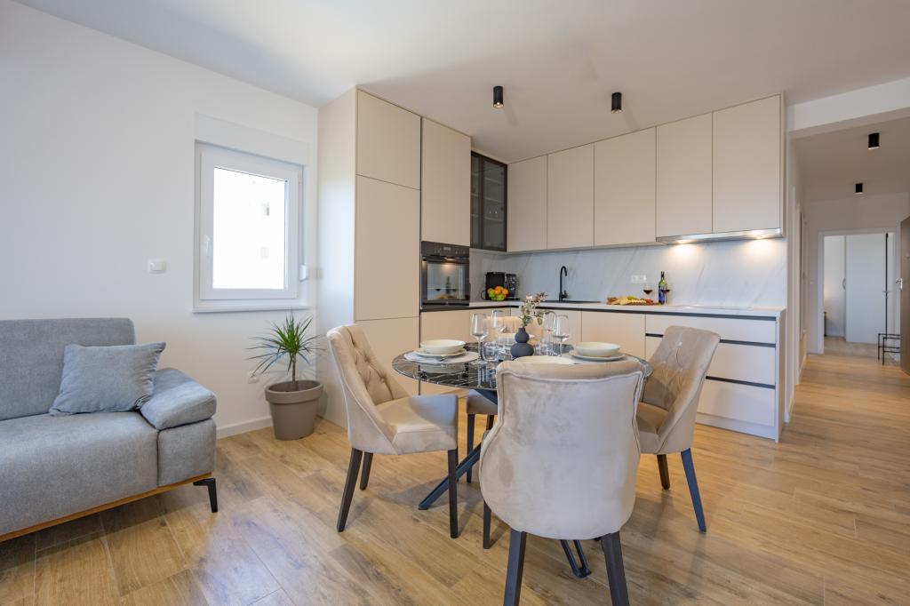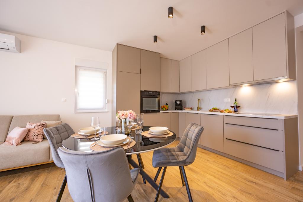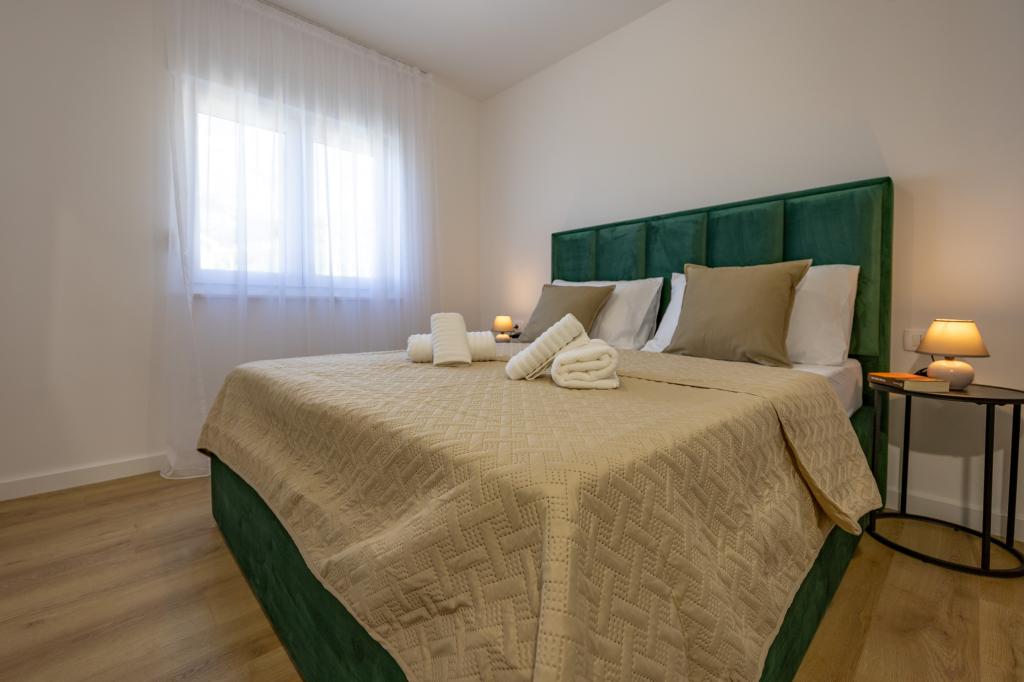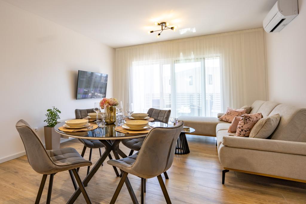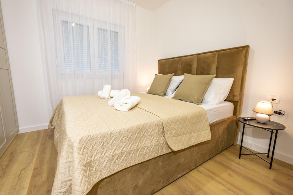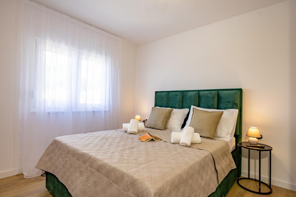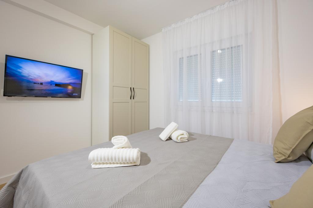 Vsak apartma izžareva sodoben dizajn in prenovljeno notranjost. V prostorni dnevni sobi, okrašeni z okusnim pohištvom in sodobnimi detajli, se boste počutili kot doma. Odprt koncept naravno povezuje dnevno sobo s popolnoma opremljeno kuhinjo, kjer vas čakajo elegantni pulti, kakovostni aparati in ves prostor, ki ga potrebujete za pripravo svojih najljubših obrokov. Dnevni prostor se odpira na prijeten balkon - idealen kraj za jutranjo kavo ali večerno sprostitev ob kozarcu vina in nepozabnem sončnem zahodu nad Jadranom. Vsak apartma ima dve udobni spalnici z zakonskimi posteljami, opremljeni z mehko posteljnino in veliko prostora za shranjevanje, eno moderno kopalnico in dodatno stranišče. Apartmaji so klimatizirani in popolnoma opremljeni: TV/SAT, internet, pralni stroj, pomivalni stroj, aparat za kavo in vse, kar potrebujete za udobno in brezskrbno bivanje. Brezplačno parkiranje v bližini plaže je vključeno v ceno najema!