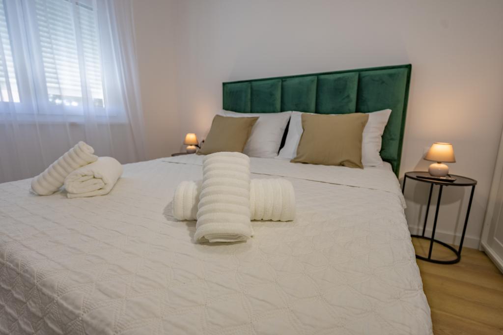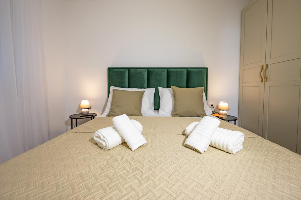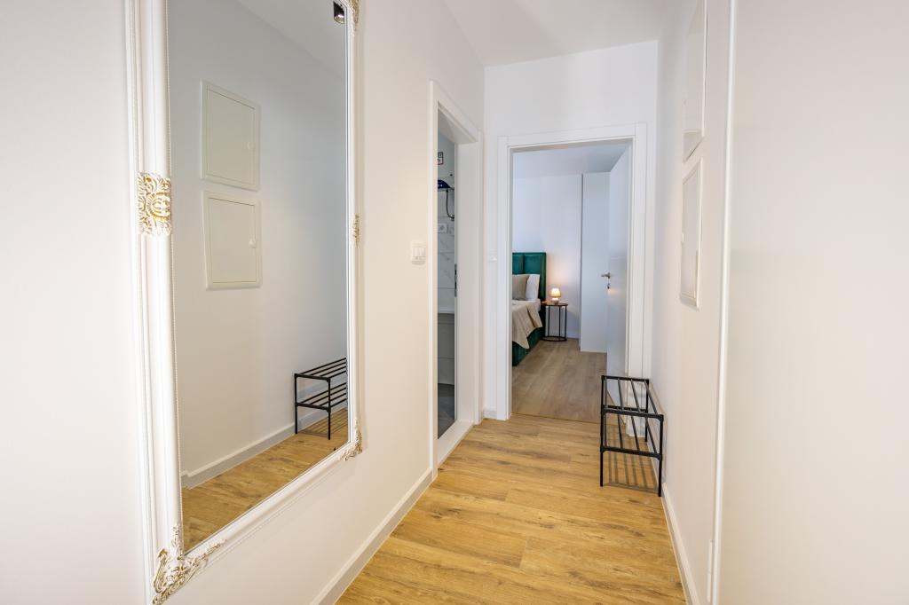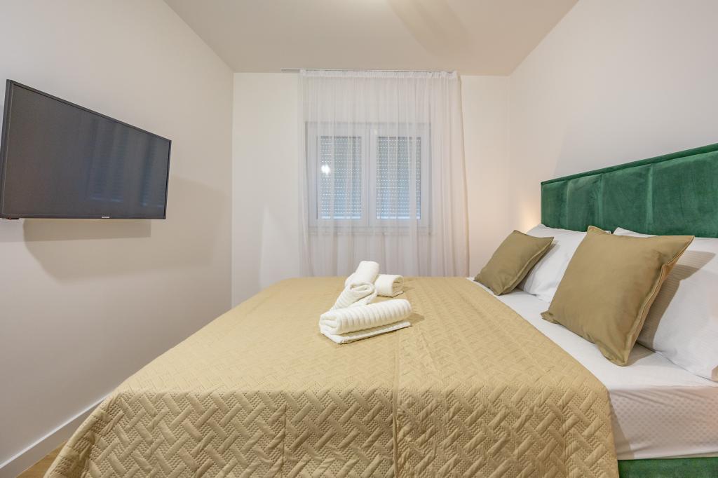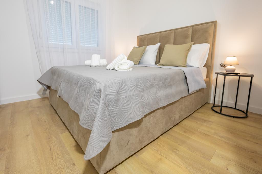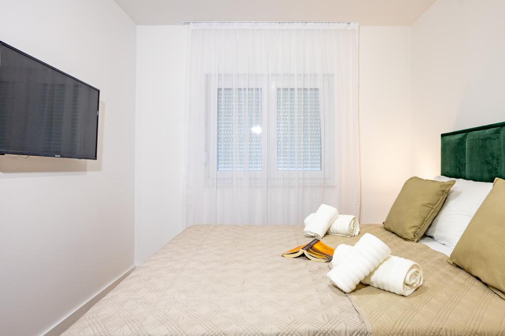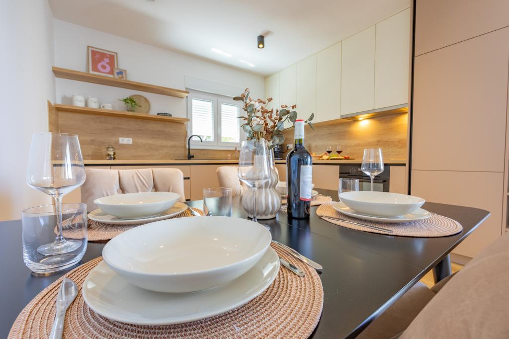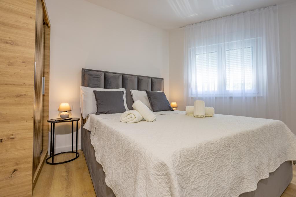 Vsak apartma izžareva sodoben dizajn in prenovljeno notranjost. V prostorni dnevni sobi, okrašeni z okusnim pohištvom in sodobnimi detajli, se boste počutili kot doma. Odprt koncept naravno povezuje dnevno sobo s popolnoma opremljeno kuhinjo, kjer vas čakajo elegantni pulti, kakovostni aparati in ves prostor, ki ga potrebujete za pripravo svojih najljubših obrokov. Dnevni prostor se odpira na prijeten balkon - idealen kraj za jutranjo kavo ali večerno sprostitev ob kozarcu vina in nepozabnem sončnem zahodu nad Jadranom. Vsak apartma ima dve udobni spalnici z zakonskimi posteljami, opremljeni z mehko posteljnino in veliko prostora za shranjevanje, eno moderno kopalnico in dodatno stranišče. Apartmaji so klimatizirani in popolnoma opremljeni: TV/SAT, internet, pralni stroj, pomivalni stroj, aparat za kavo in vse, kar potrebujete za udobno in brezskrbno bivanje. Brezplačno parkiranje v bližini plaže je vključeno v ceno najema!
