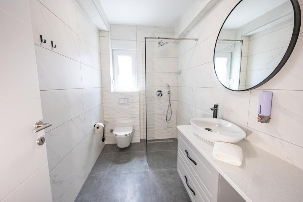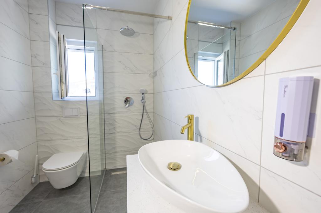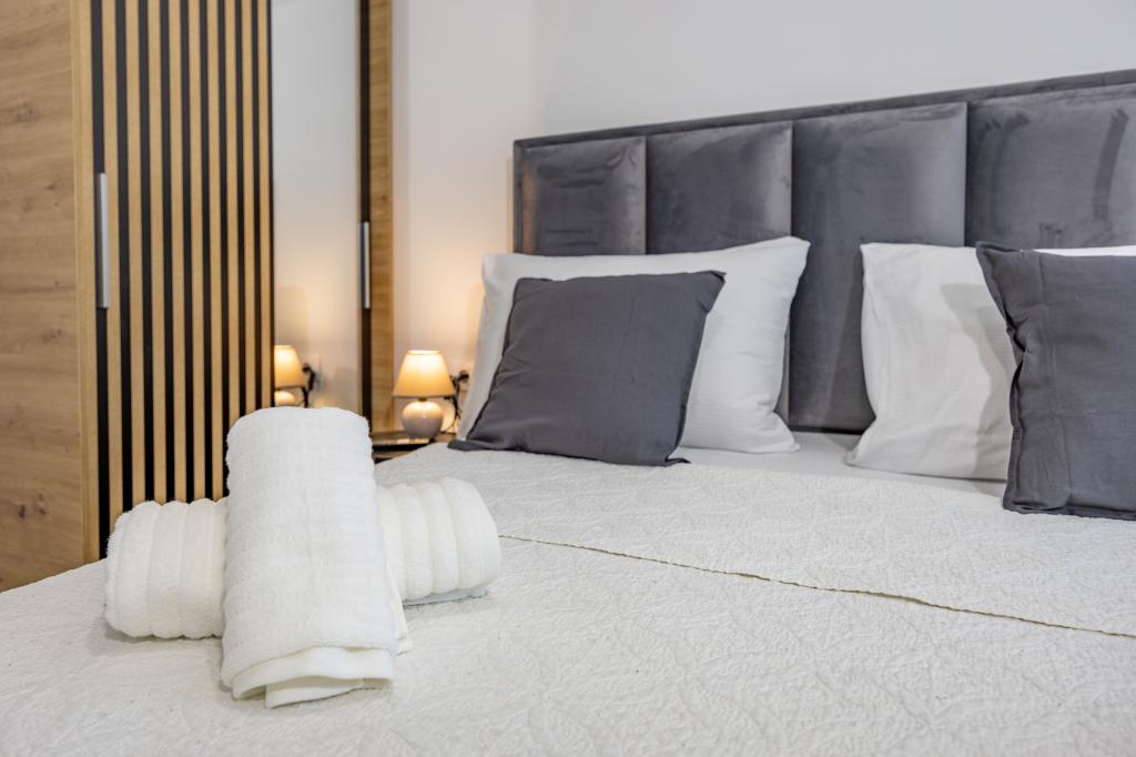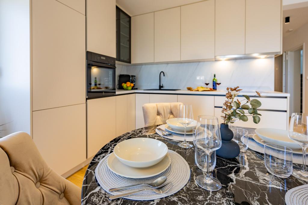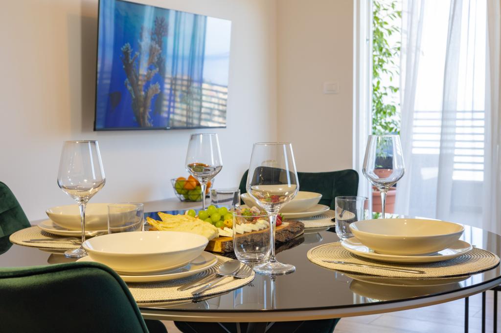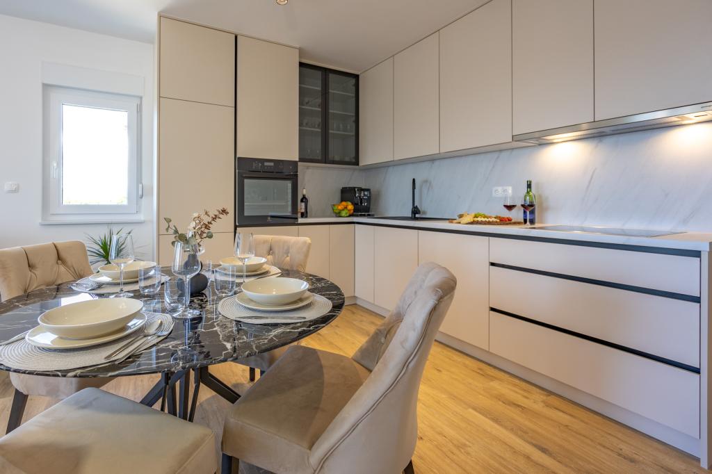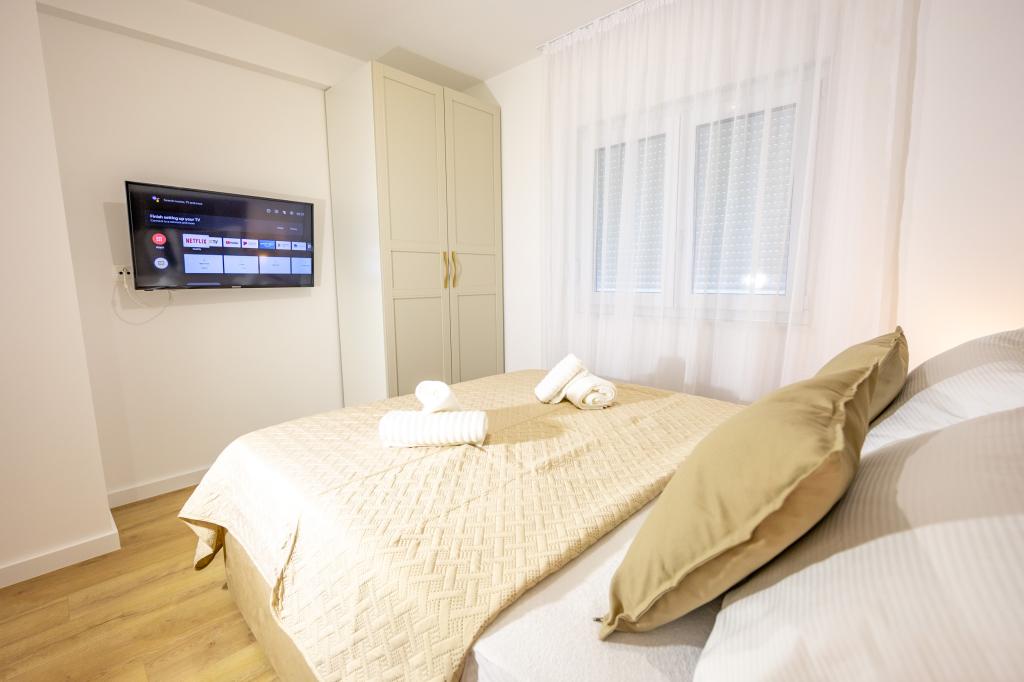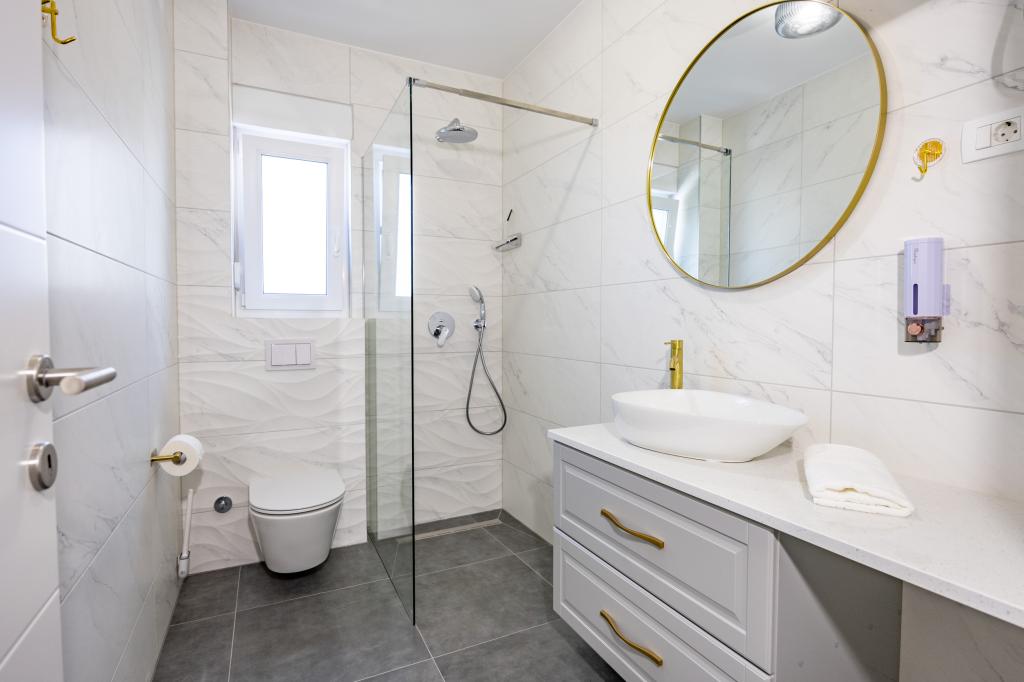 Vsak apartma izžareva sodoben dizajn in prenovljeno notranjost. V prostorni dnevni sobi, okrašeni z okusnim pohištvom in sodobnimi detajli, se boste počutili kot doma. Odprt koncept naravno povezuje dnevno sobo s popolnoma opremljeno kuhinjo, kjer vas čakajo elegantni pulti, kakovostni aparati in ves prostor, ki ga potrebujete za pripravo svojih najljubših obrokov. Dnevni prostor se odpira na prijeten balkon - idealen kraj za jutranjo kavo ali večerno sprostitev ob kozarcu vina in nepozabnem sončnem zahodu nad Jadranom. Vsak apartma ima dve udobni spalnici z zakonskimi posteljami, opremljeni z mehko posteljnino in veliko prostora za shranjevanje, eno moderno kopalnico in dodatno stranišče. Apartmaji so klimatizirani in popolnoma opremljeni: TV/SAT, internet, pralni stroj, pomivalni stroj, aparat za kavo in vse, kar potrebujete za udobno in brezskrbno bivanje. Brezplačno parkiranje v bližini plaže je vključeno v ceno najema!
