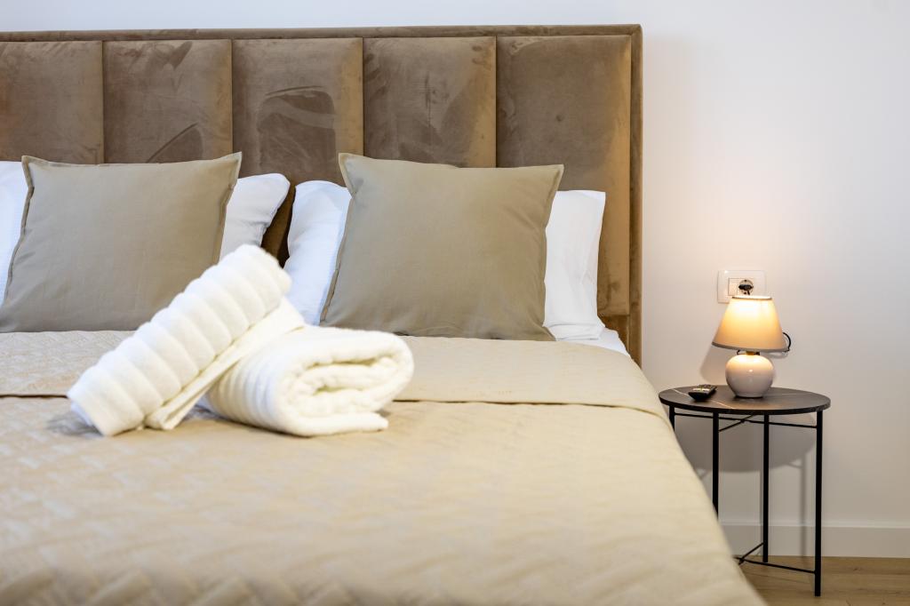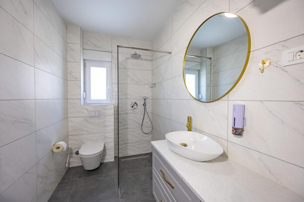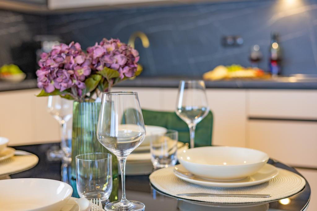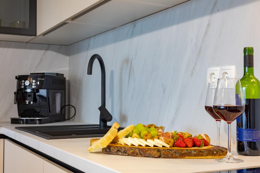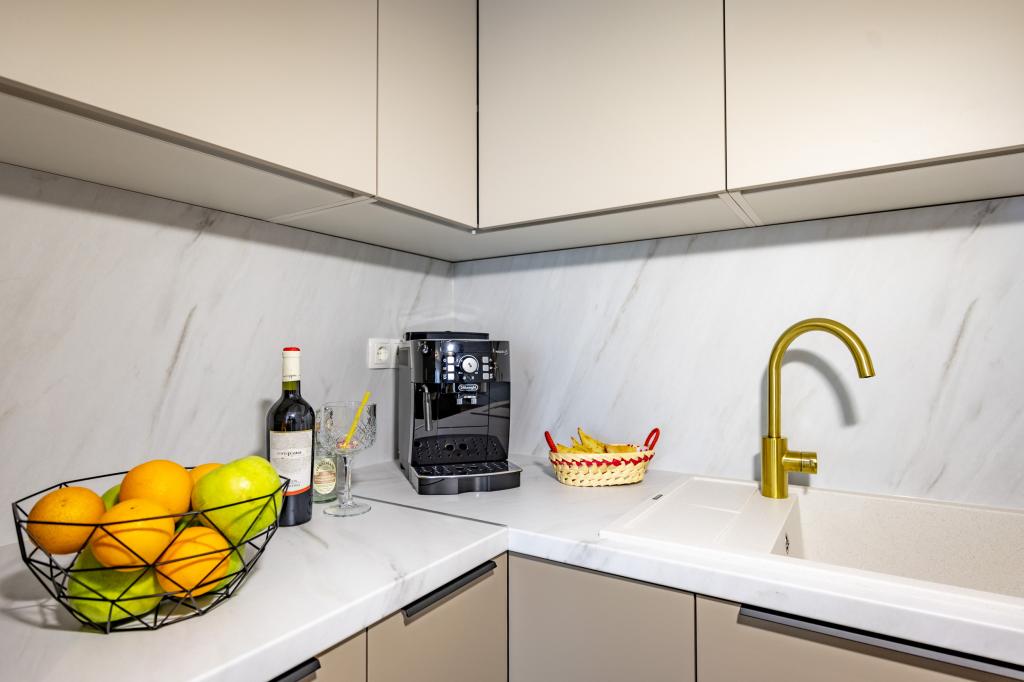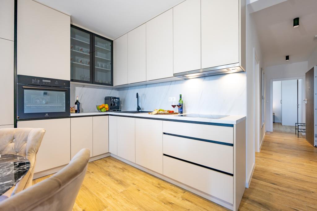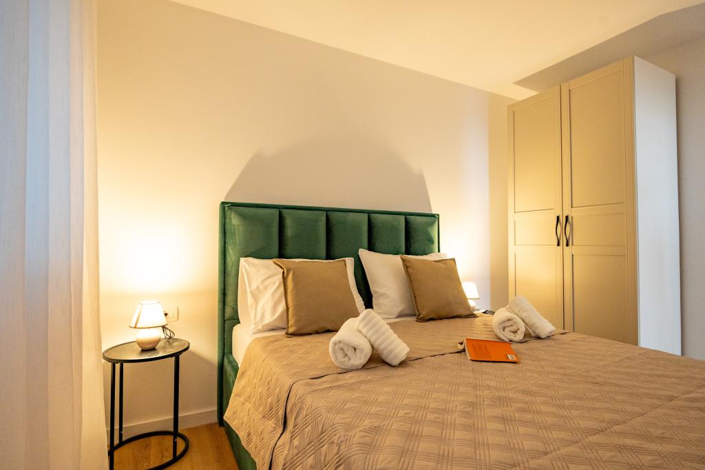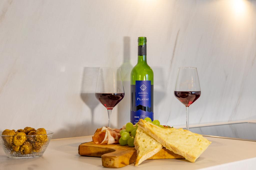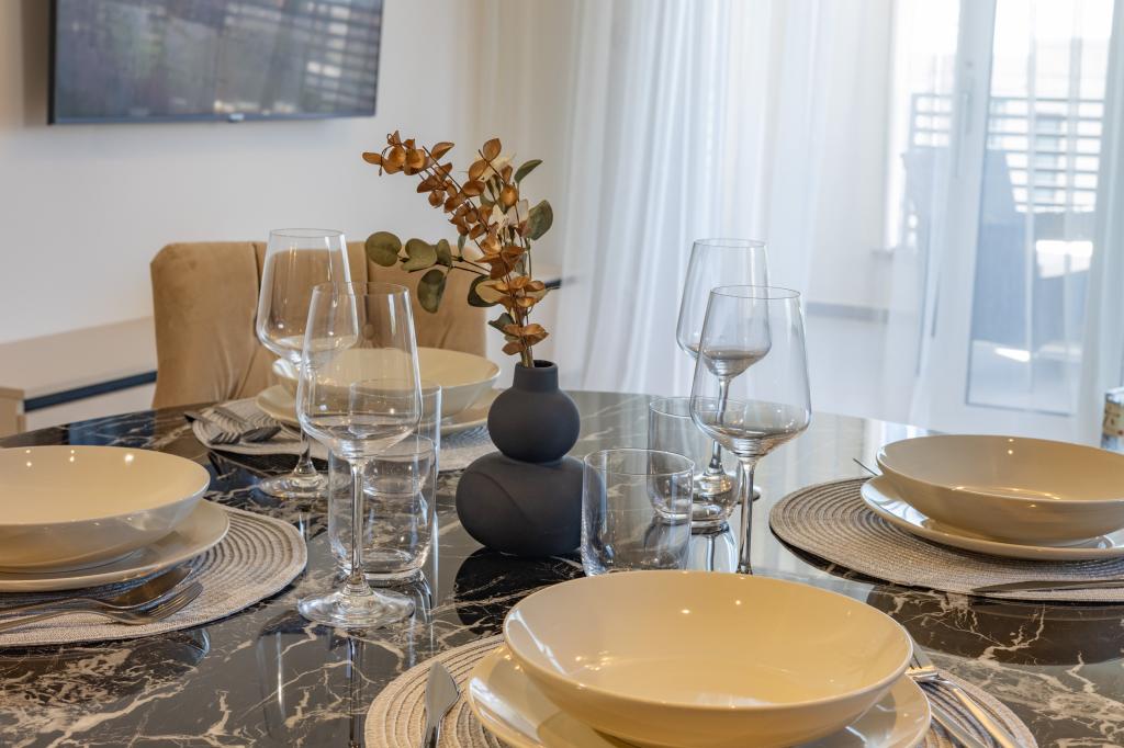 Vsak apartma izžareva sodoben dizajn in prenovljeno notranjost. V prostorni dnevni sobi, okrašeni z okusnim pohištvom in sodobnimi detajli, se boste počutili kot doma. Odprt koncept naravno povezuje dnevno sobo s popolnoma opremljeno kuhinjo, kjer vas čakajo elegantni pulti, kakovostni aparati in ves prostor, ki ga potrebujete za pripravo svojih najljubših obrokov. Dnevni prostor se odpira na prijeten balkon - idealen kraj za jutranjo kavo ali večerno sprostitev ob kozarcu vina in nepozabnem sončnem zahodu nad Jadranom. Vsak apartma ima dve udobni spalnici z zakonskimi posteljami, opremljeni z mehko posteljnino in veliko prostora za shranjevanje, eno moderno kopalnico in dodatno stranišče. Apartmaji so klimatizirani in popolnoma opremljeni: TV/SAT, internet, pralni stroj, pomivalni stroj, aparat za kavo in vse, kar potrebujete za udobno in brezskrbno bivanje. Brezplačno parkiranje v bližini plaže je vključeno v ceno najema!