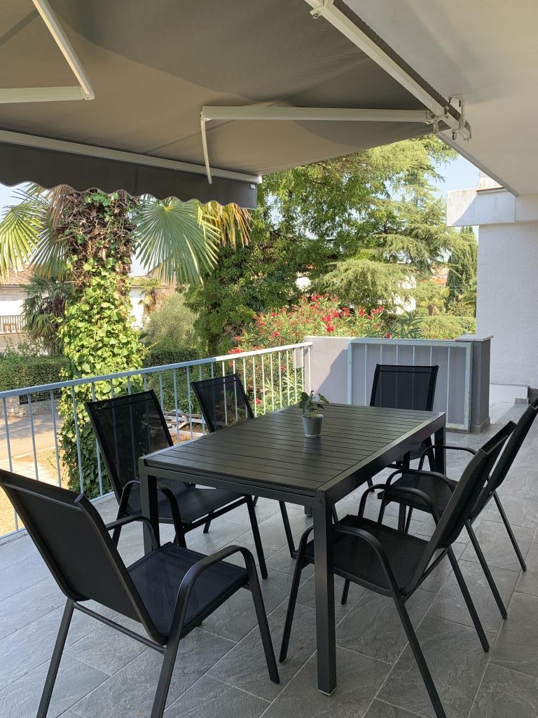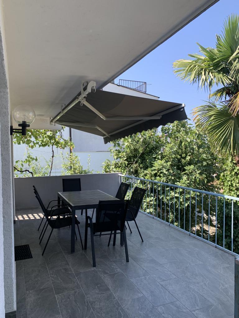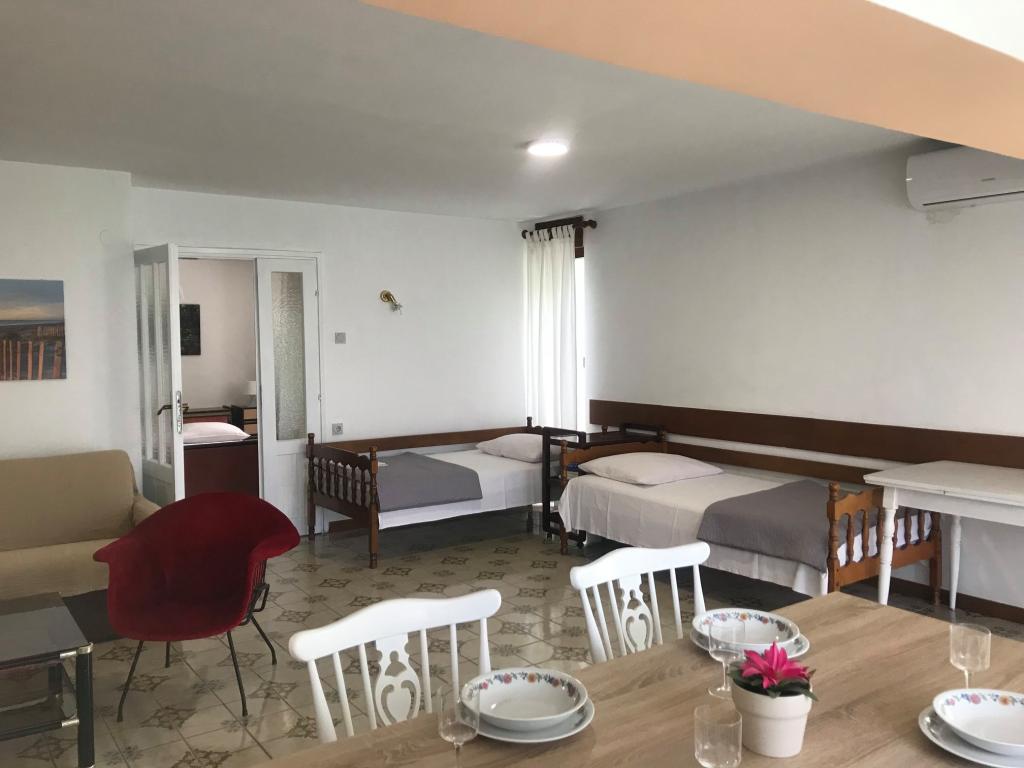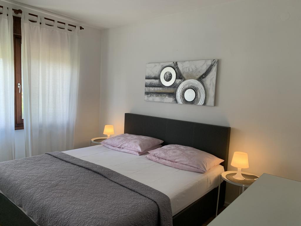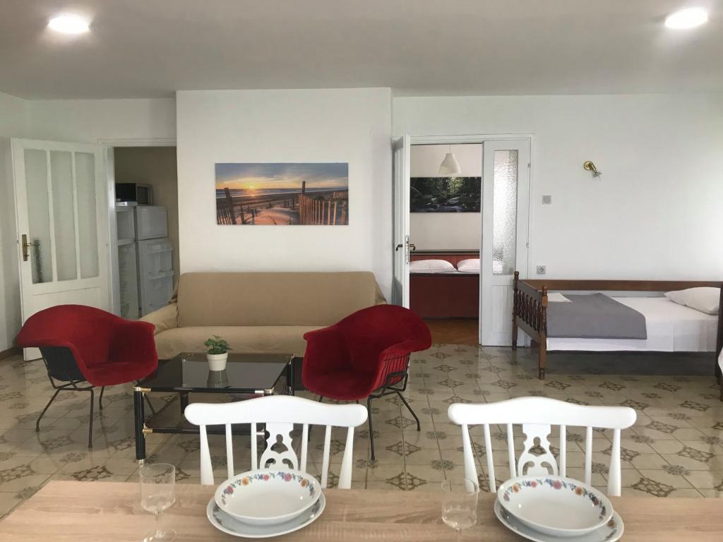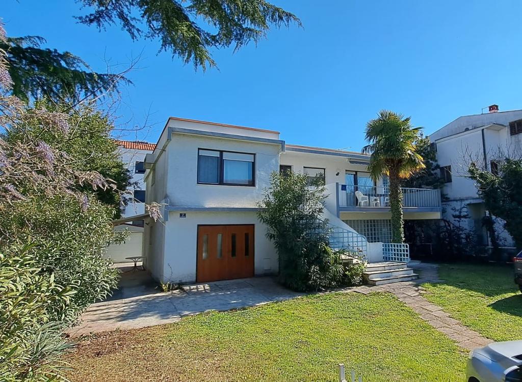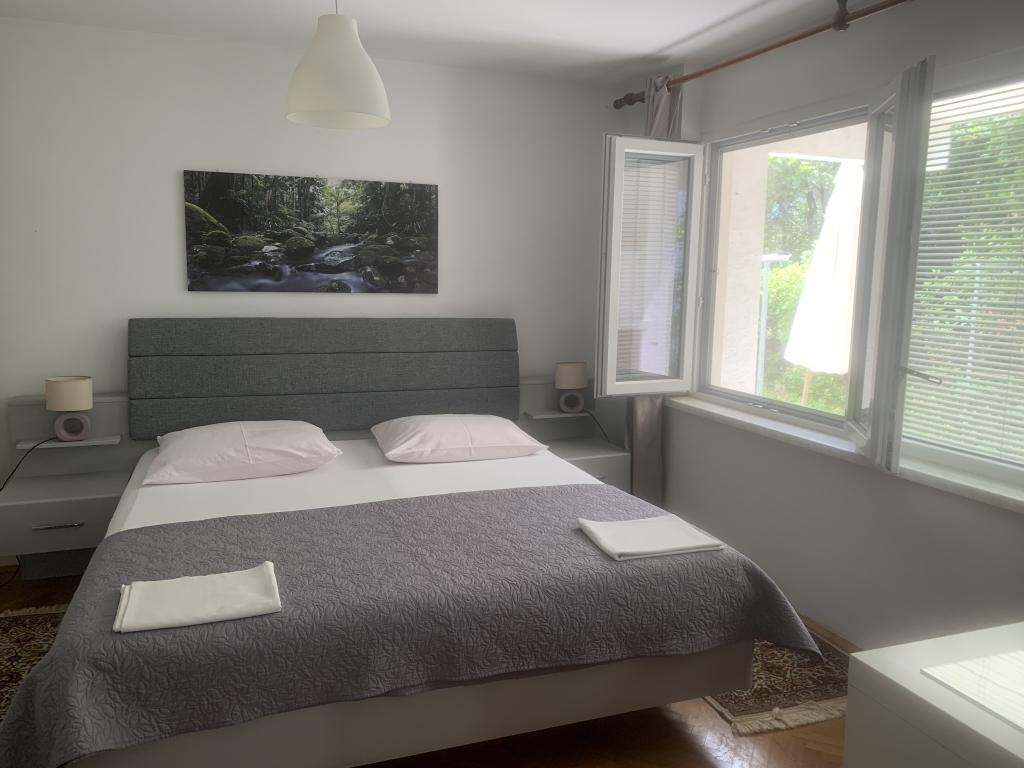 Turistična taksa je vključena v ceno. Dokument o potrditvi rezervacije ob rezervacijiApartma 2+2 (55 m2) se nahaja v pritličju in je sestavljen iz spalnice z zakonsko posteljo, dve dodatni ležišči pa se nahajata v dnevni sobi (dve postelji z vzmetnicami). Kuhinja je opremljena s posodo, hladilnikom z zamrzovalnikom, mikrovalovno pečico, električnim štedilnikom s pečico, grelnikom vode in aparatom za kavo. Apartma ima sprednjo in zadnjo teraso. Hišni ljubljenčki so dobrodošli z doplačilom 5 € na dan na hišnega ljubljenčka. ------------------------------------------------------------------ Apartma 4+2 (85 m2) se nahaja v prvem nadstropju in je sestavljen iz 2 spalnic z zakonskimi posteljami, 2 dodatni ležišči pa se nahajata v dnevni sobi. Apartma ima kopalnico (tuš/WC) in ločen WC. Kuhinja je opremljena s posodo, dvojnim hladilnikom z zamrzovalnikom, mikrovalovno pečico, električnim štedilnikom s pečico, grelnikom vode in aparatom za filter kavo. Apartma ima veliko teraso na sprednji strani, obrnjeno proti dvorišču, in balkon s pogledom na vrt.