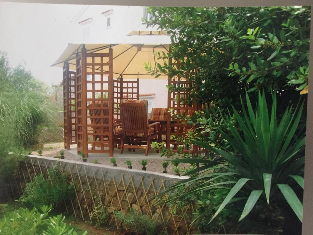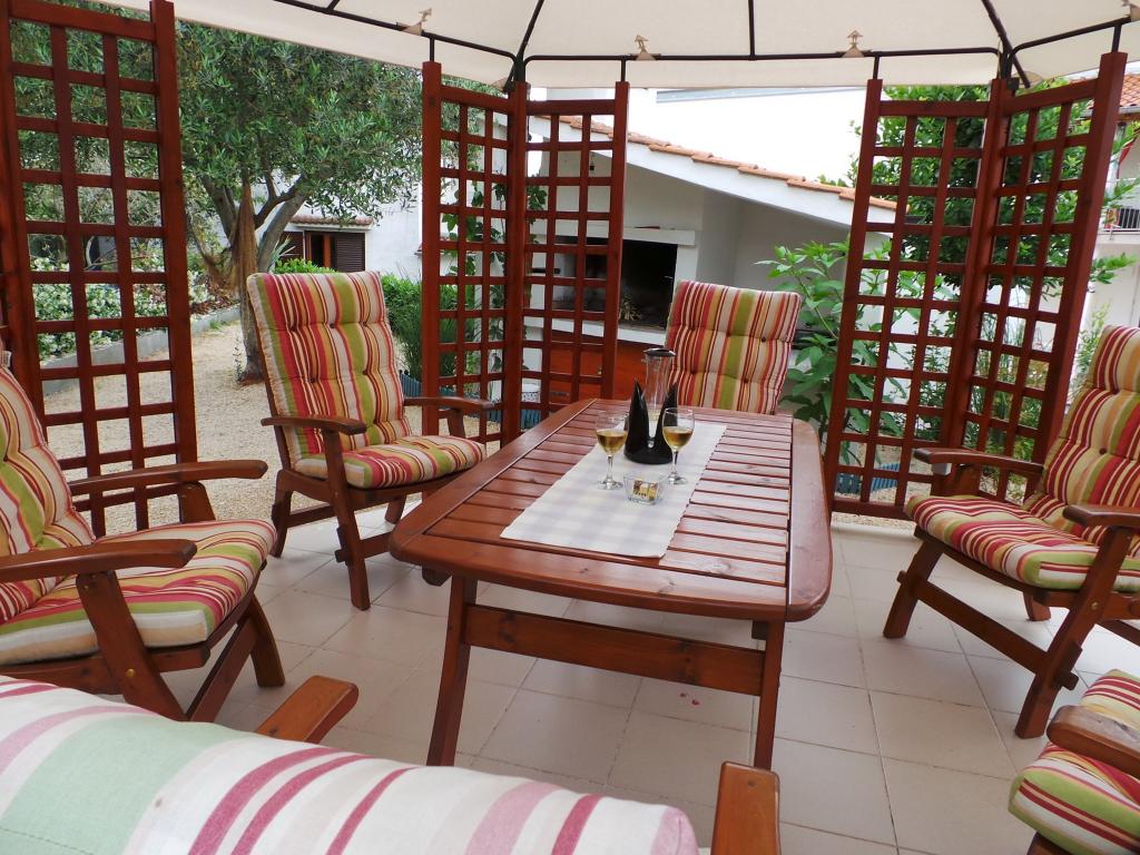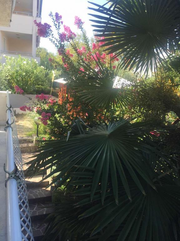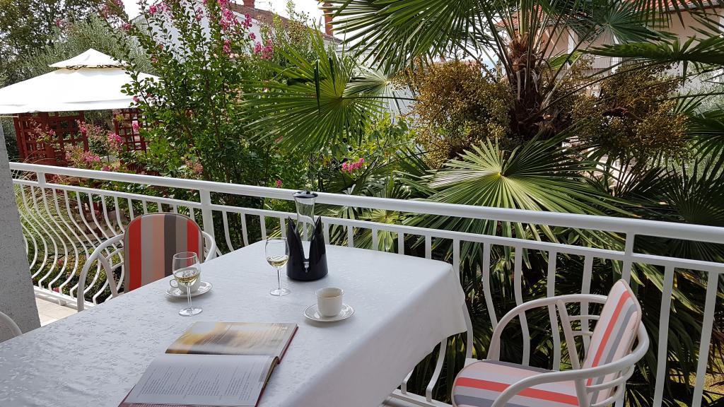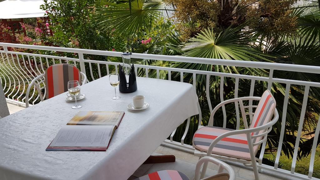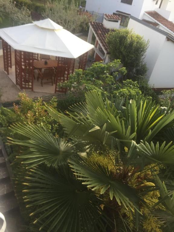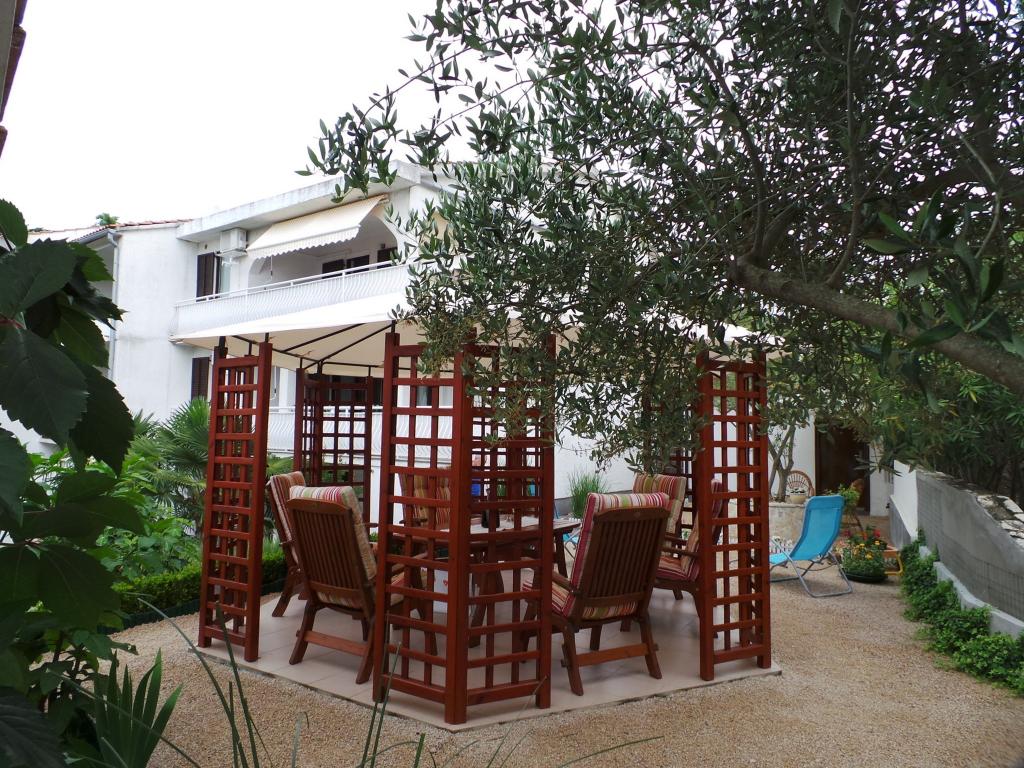 Pogled na vrt in paviljon, kjer gostje zvečer uživajo v romantičnem okolju diskretne razsvetljave in cvetja s kozarcem dobrega vina in dobrotami z žara. Vonji lokalnih ribjih specialitet prihajajo iz bližnje ribje restavracije / 200 m od apartmaja /. Dodatne storitve v bližini: kegljanje, jahanje, različni vodni športi, izposoja koles, čolni, organizirani izleti, dolge in lepe promenade so možnosti, ki jih ponuja kraj.
