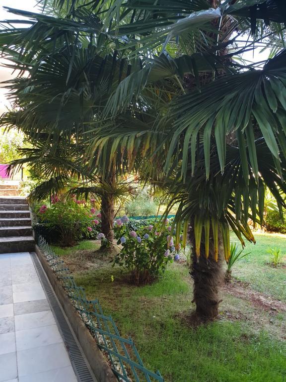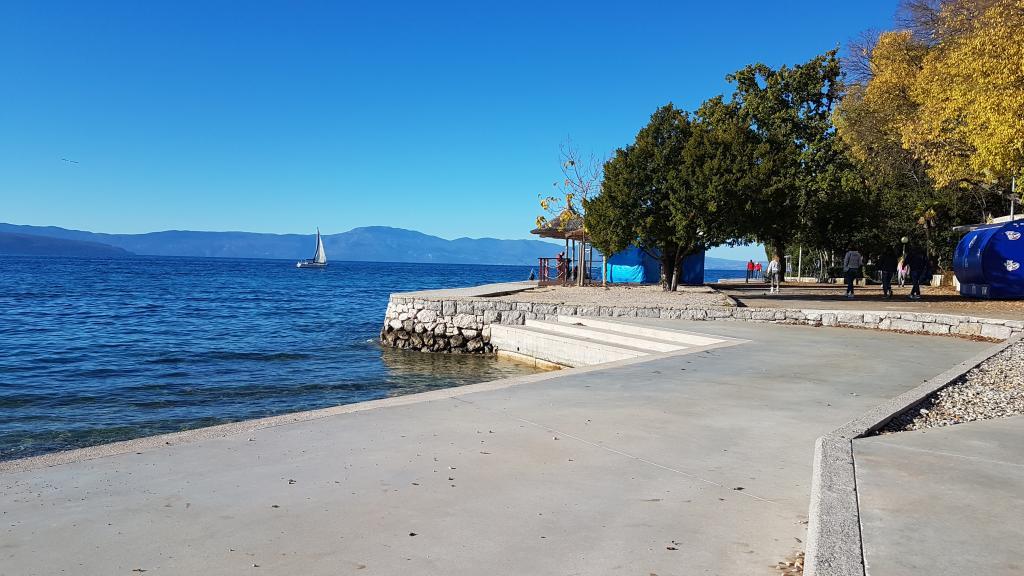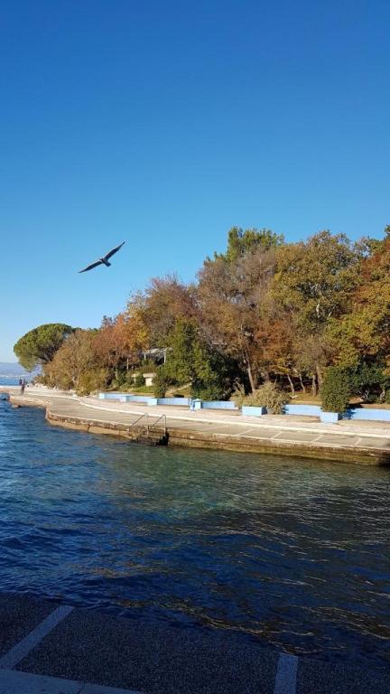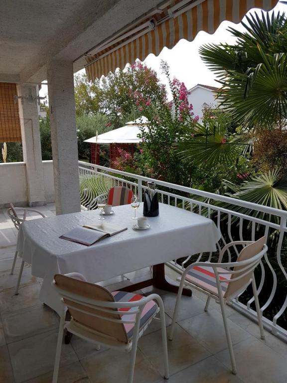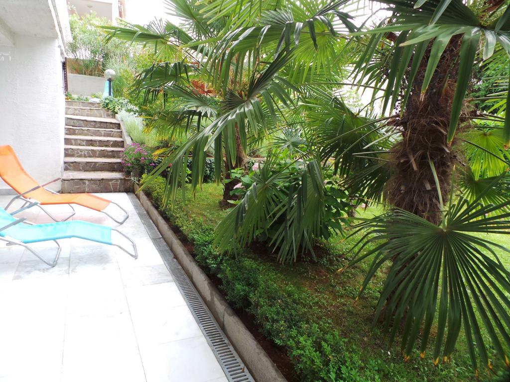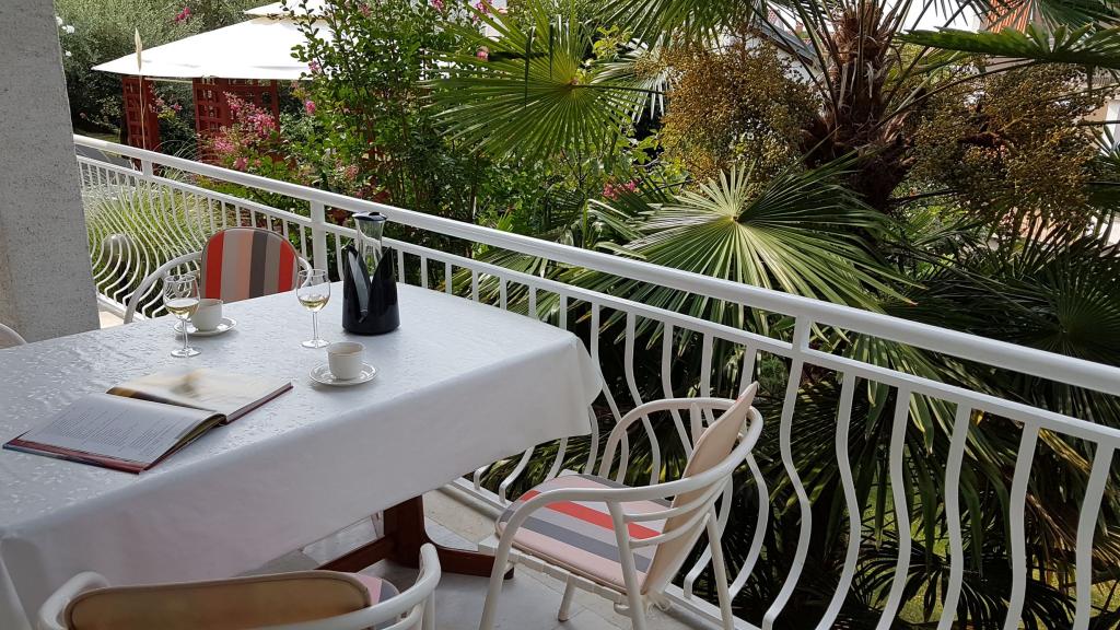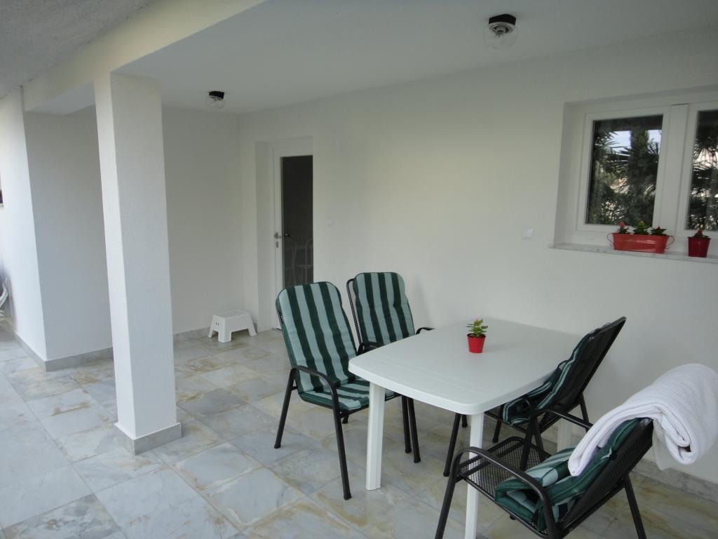 Pogled na vrt in paviljon, kjer gostje zvečer uživajo v romantičnem okolju diskretne razsvetljave in cvetja s kozarcem dobrega vina in dobrotami z žara. Vonji lokalnih ribjih specialitet prihajajo iz bližnje ribje restavracije / 200 m od apartmaja /. Dodatne storitve v bližini: kegljanje, jahanje, različni vodni športi, izposoja koles, čolni, organizirani izleti, dolge in lepe promenade so možnosti, ki jih ponuja kraj.