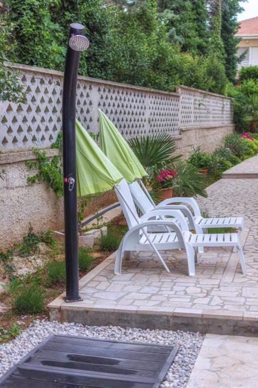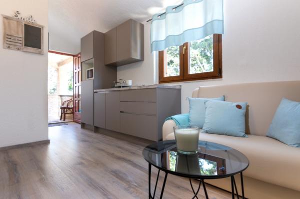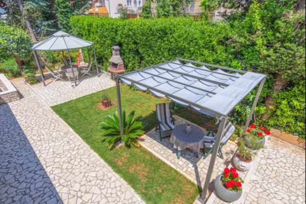 Popolnoma opremljeni apartmaji se nahajajo 2-3 min hoje do plaže. Obkroženi so z velikim vrtom in cipresami. Imajo zasebno parkirišče z avtomatskimi vrati. Apartma 4+ 1 ima dve spalnici z zakonsko posteljo in klimatsko napravo. V dnevni sobi je raztegljiv kavč za 1 osebo. Apartma ima 2 terasi in gazebo z žarom, ki je na voljo gostom obeh apartmajev. Kuhinja je popolnoma opremljena, vključno s pomivalnim strojem. Apartma 2 ima spalnico z zakonsko posteljo in klimatsko napravo, opremljeno kuhinjo s pomivalnim strojem, kopalnico, teraso in gazebo. Oba apartmaja imata TV-SAT in Wi-Fi, sušilec za lase, likalnik in likalno desko, apartma 4 1 pa ima tudi pralni stroj . Posteljnina in brisače so vključene v ceno in se menjajo tedensko.