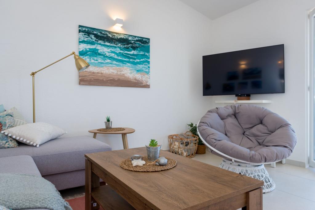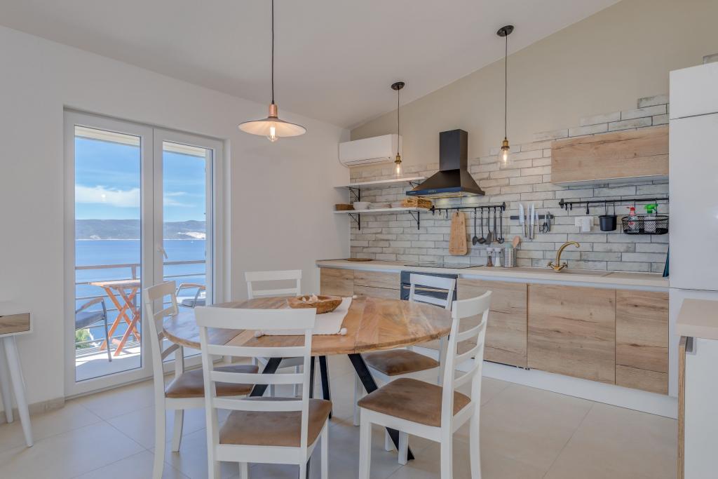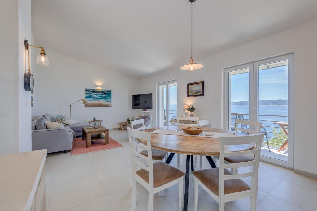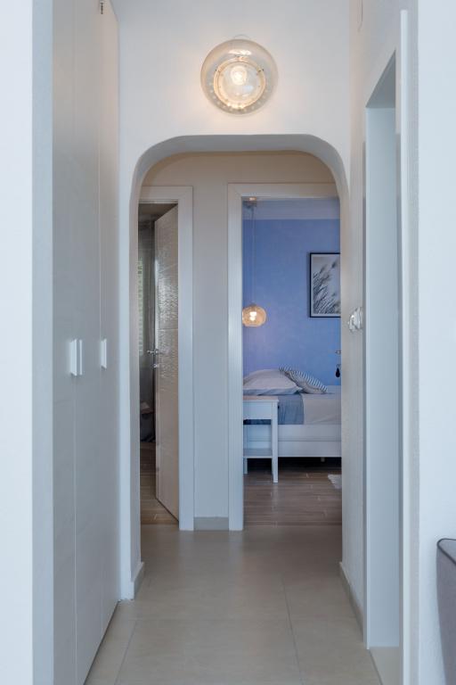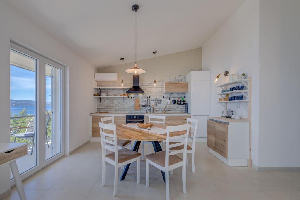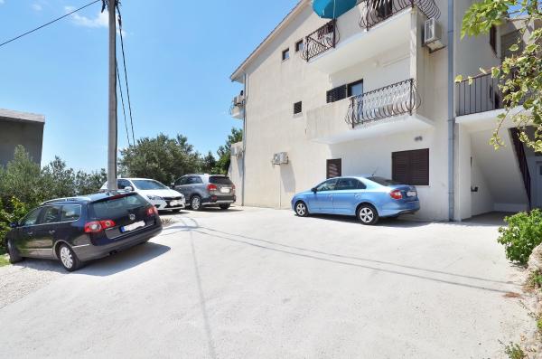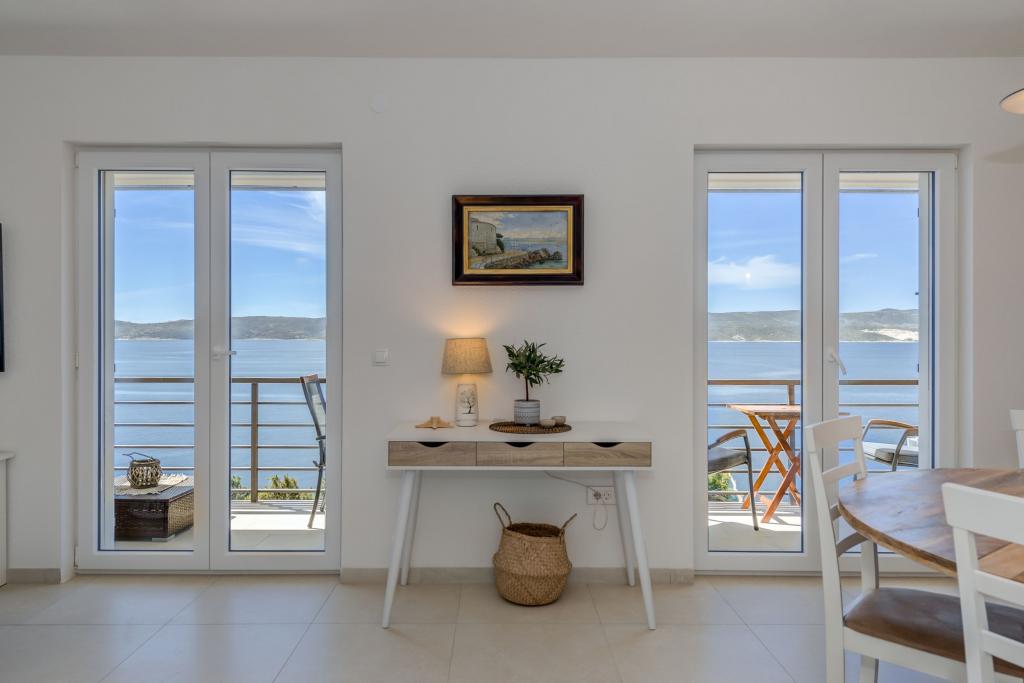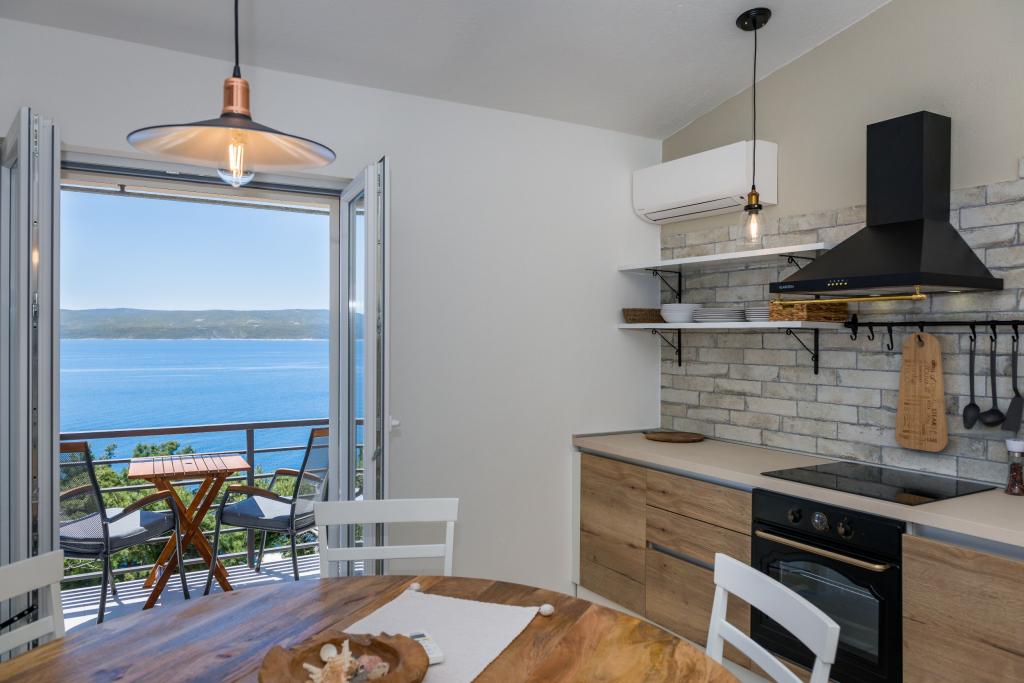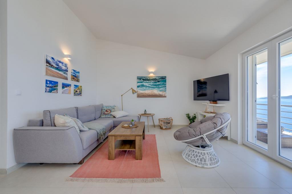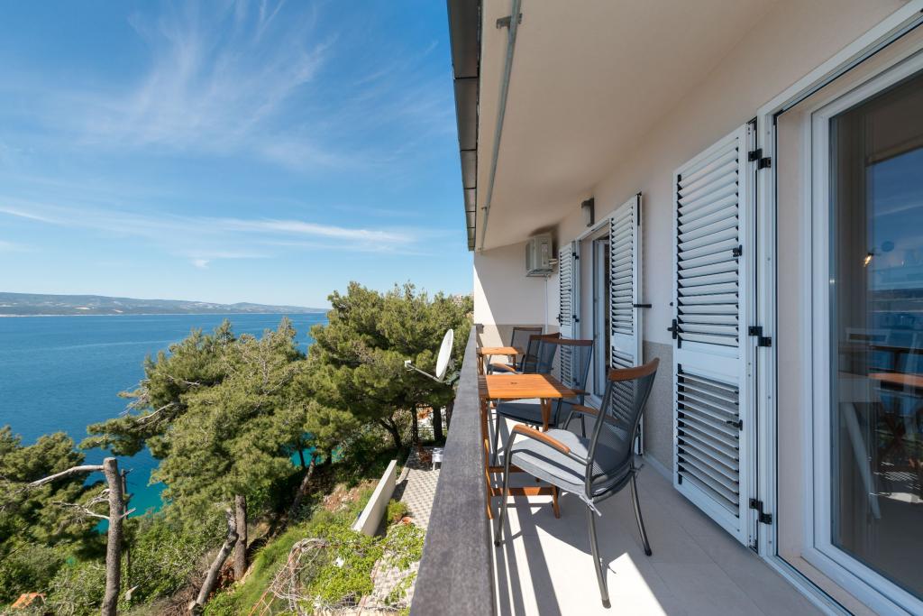 Apartma se nahaja v drugem nadstropju, s skupno površino 90 m2. Ima veliko teraso, ki se nahaja na jugozahodni strani v velikosti cca. 50m2. Apartma ima dve spalnici in dve kopalnici, popolnoma opremljeno kuhinjo in prostorno dnevno sobo. Ena soba ima zakonsko posteljo z dodatnim ležiščem (2 +1), ločeno kopalnico in dostop do prostorno teraso s pogledom na jug. Druga spalnica je obrnjen proti severu je borov gozd zakonsko posteljo. Kuhinja in dnevna soba razteza od severa proti jugu v liniji. S popolnoma opremljeno kuhinjo (hladilnik, štedilnik - pečica, mikrovalovna pečica, pomivalni stroj, kavni avtomat, itd ...), je miza s šestimi stoli. Dnevna soba je opremljena z dvema zofe in fotelj, iz katerega čudovit pogled na morje. Ob izhodu iz dnevne sobe pridete na veliko teraso, ki je 4,5 metra širok in dolg 10 metrov, z veliko mizo za 6 oseb, udobno sedenje in kaminom.